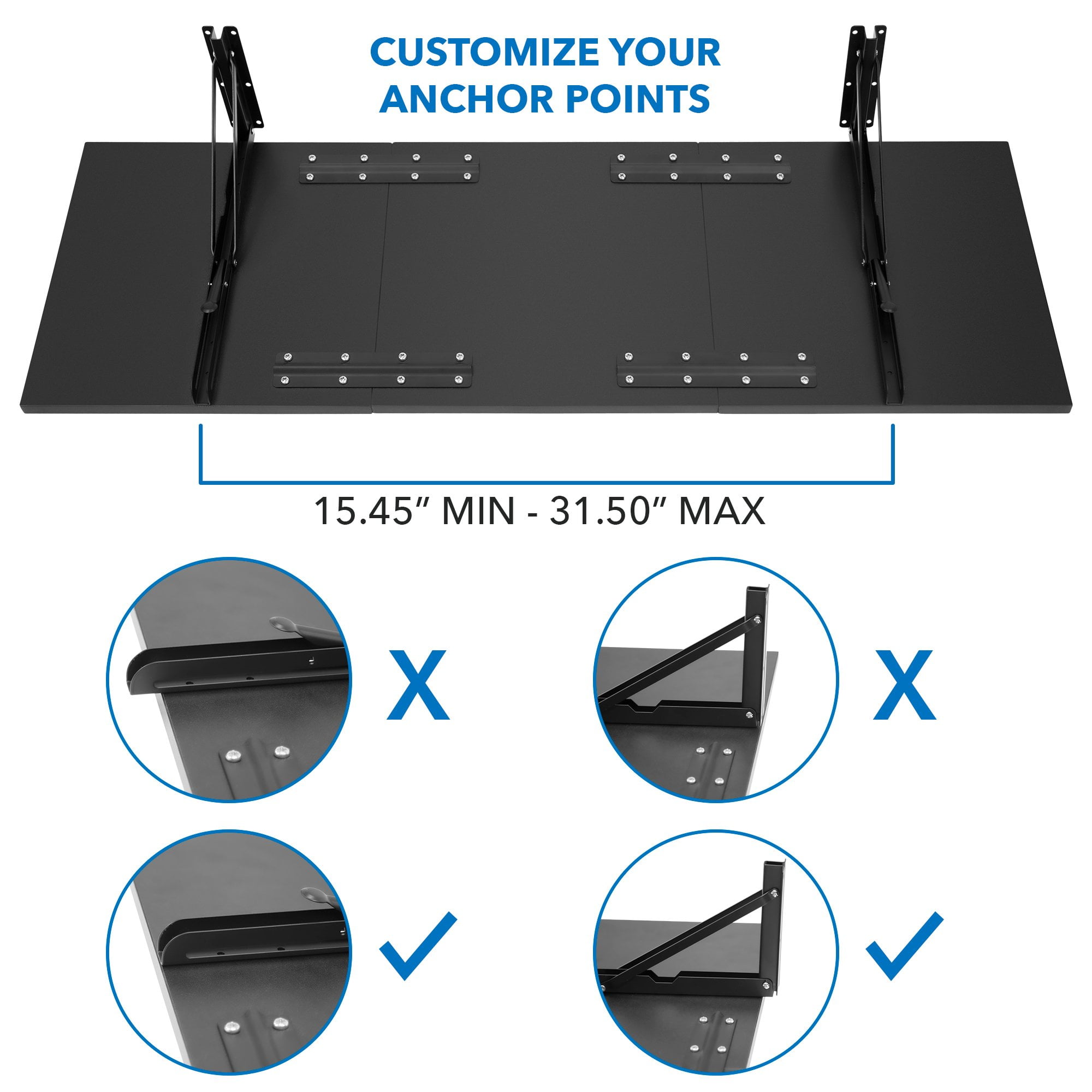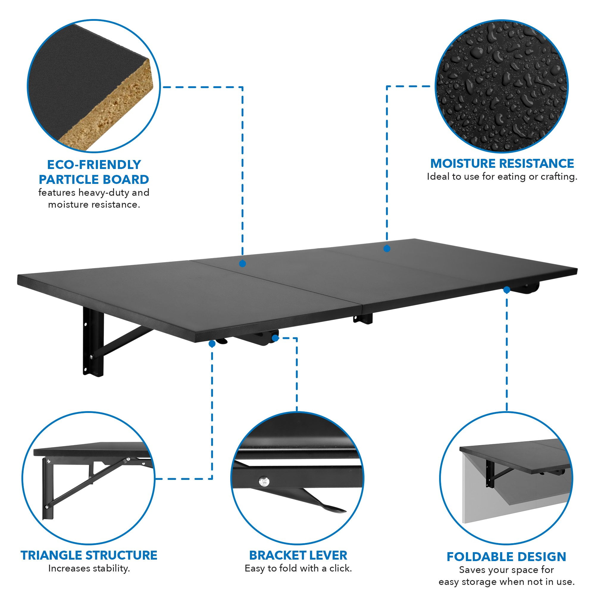 Whether you occasionally need the extra tabletop space for working on your laptop, folding laundry or place cases of water, this folding wall mounted table provides a flexible solution with a high load capacity. The 3-piece tabletop can be mounted in two different set-ups to fit your space: 30″ or 45″ tabletop width. Simply fold your table up when you need it and back down to save space in small rooms.