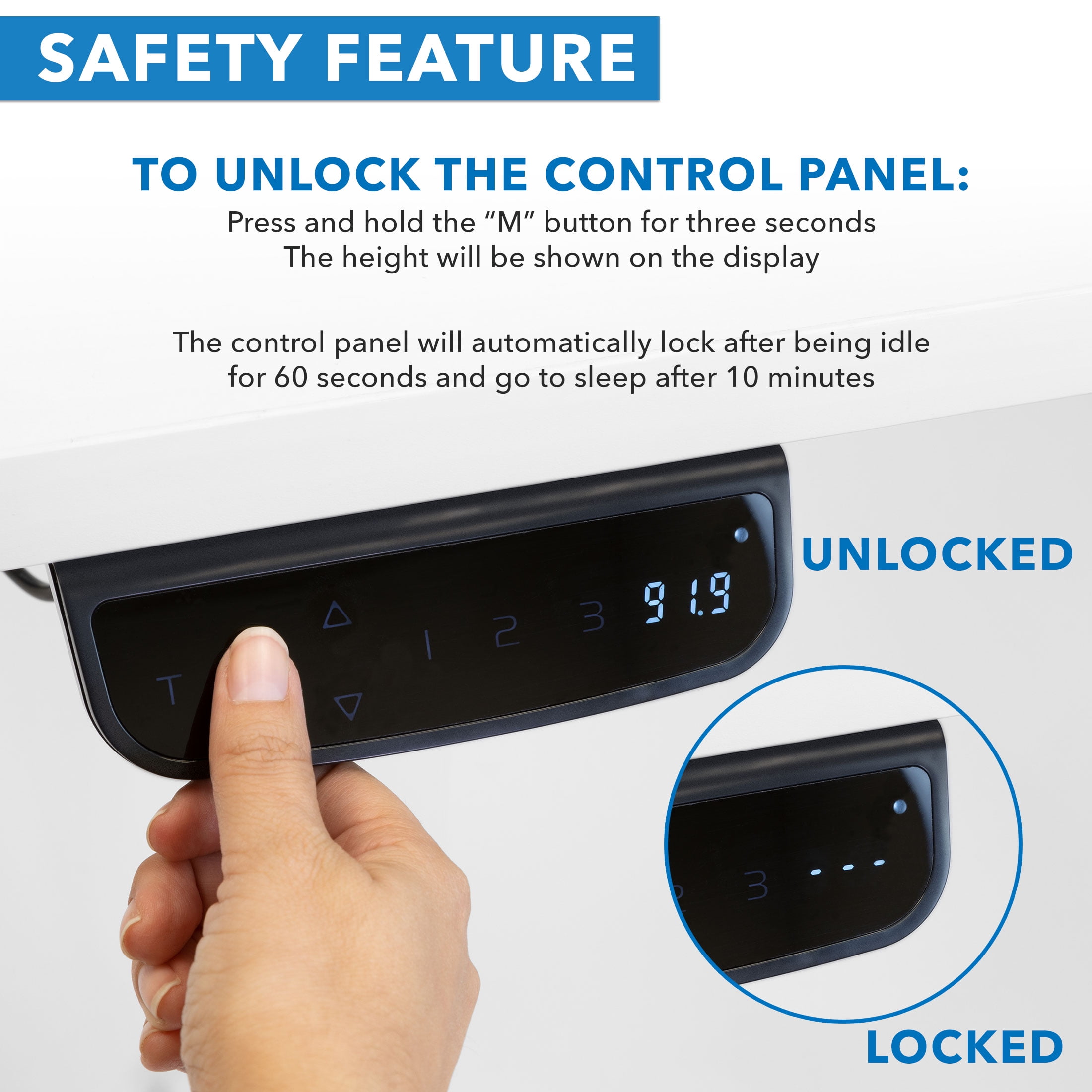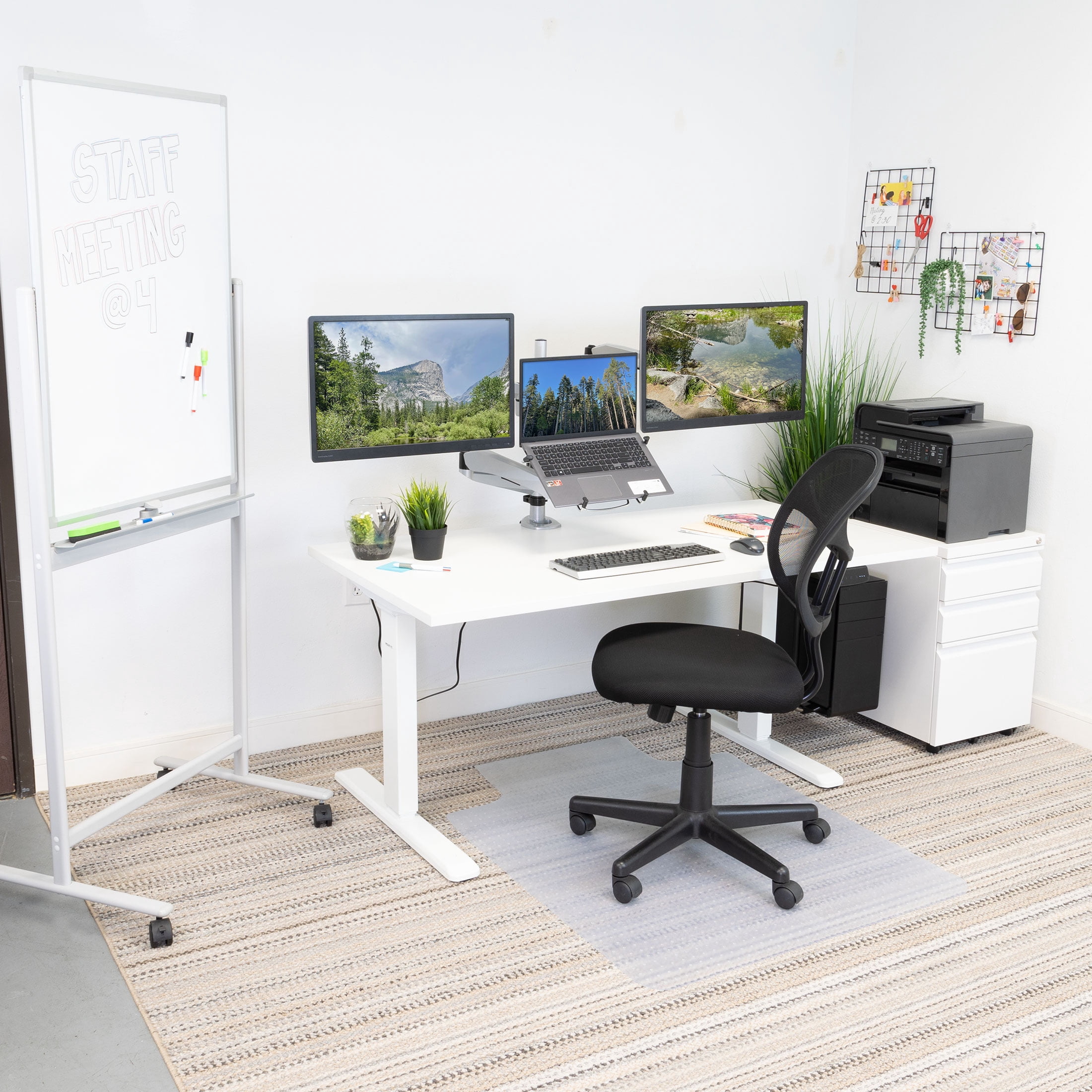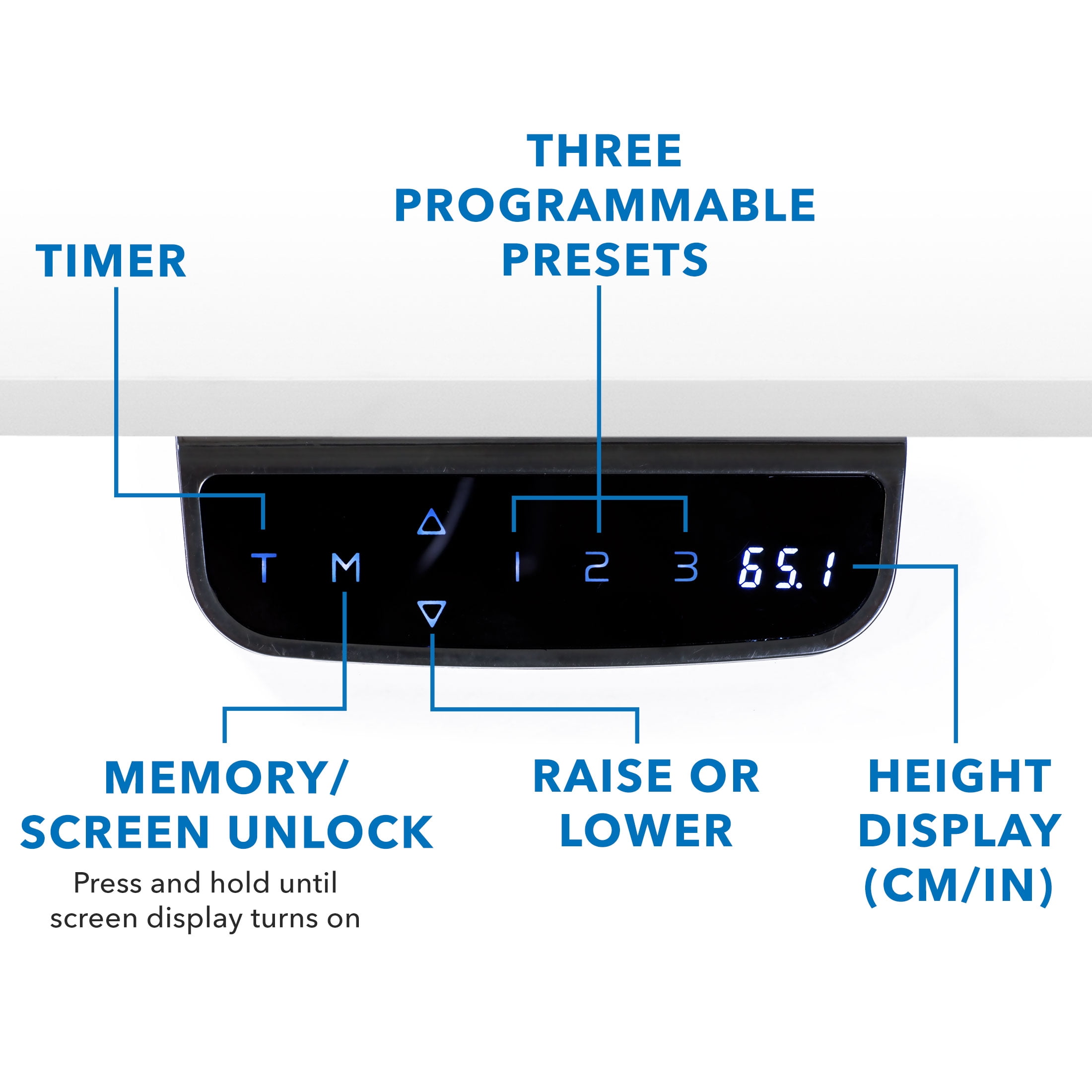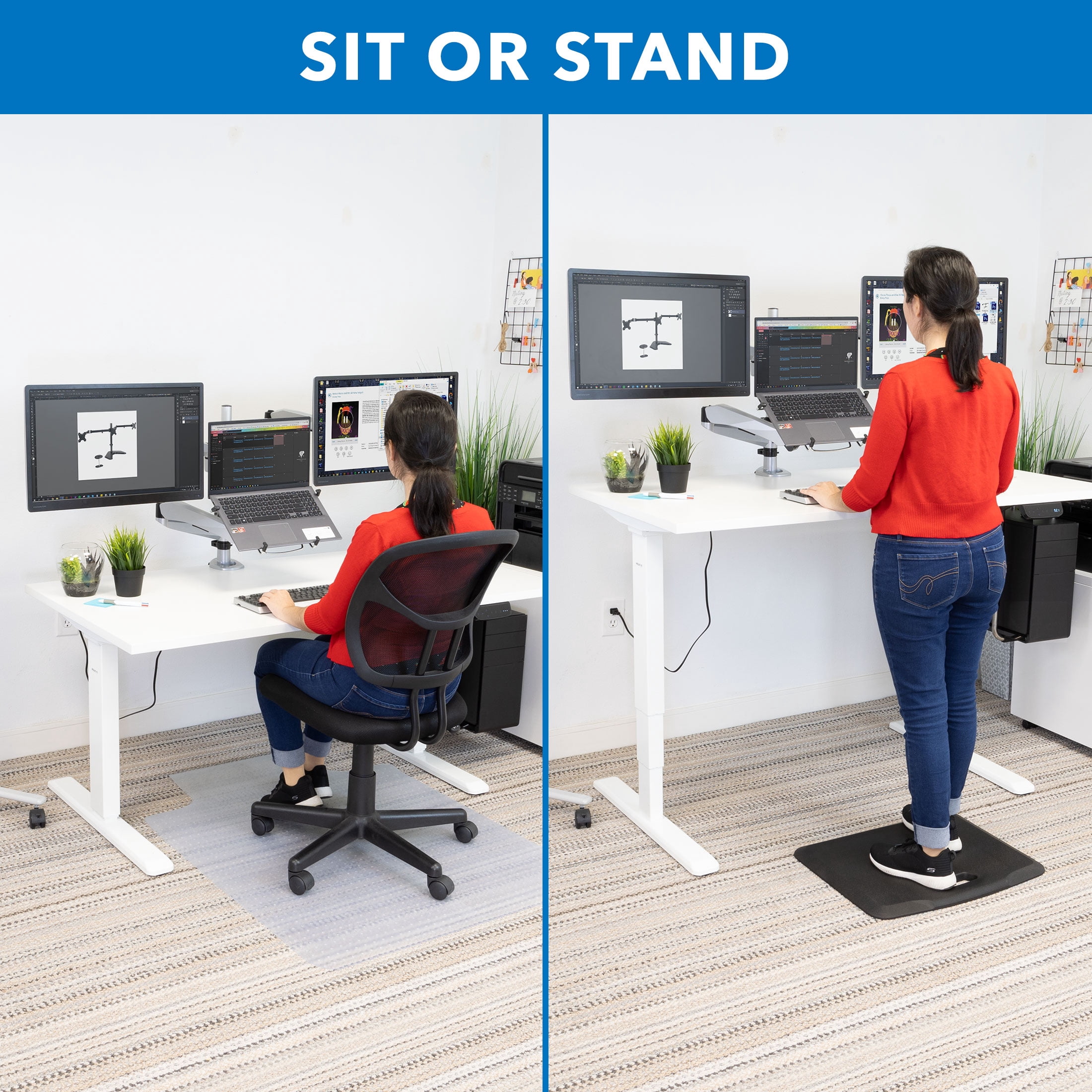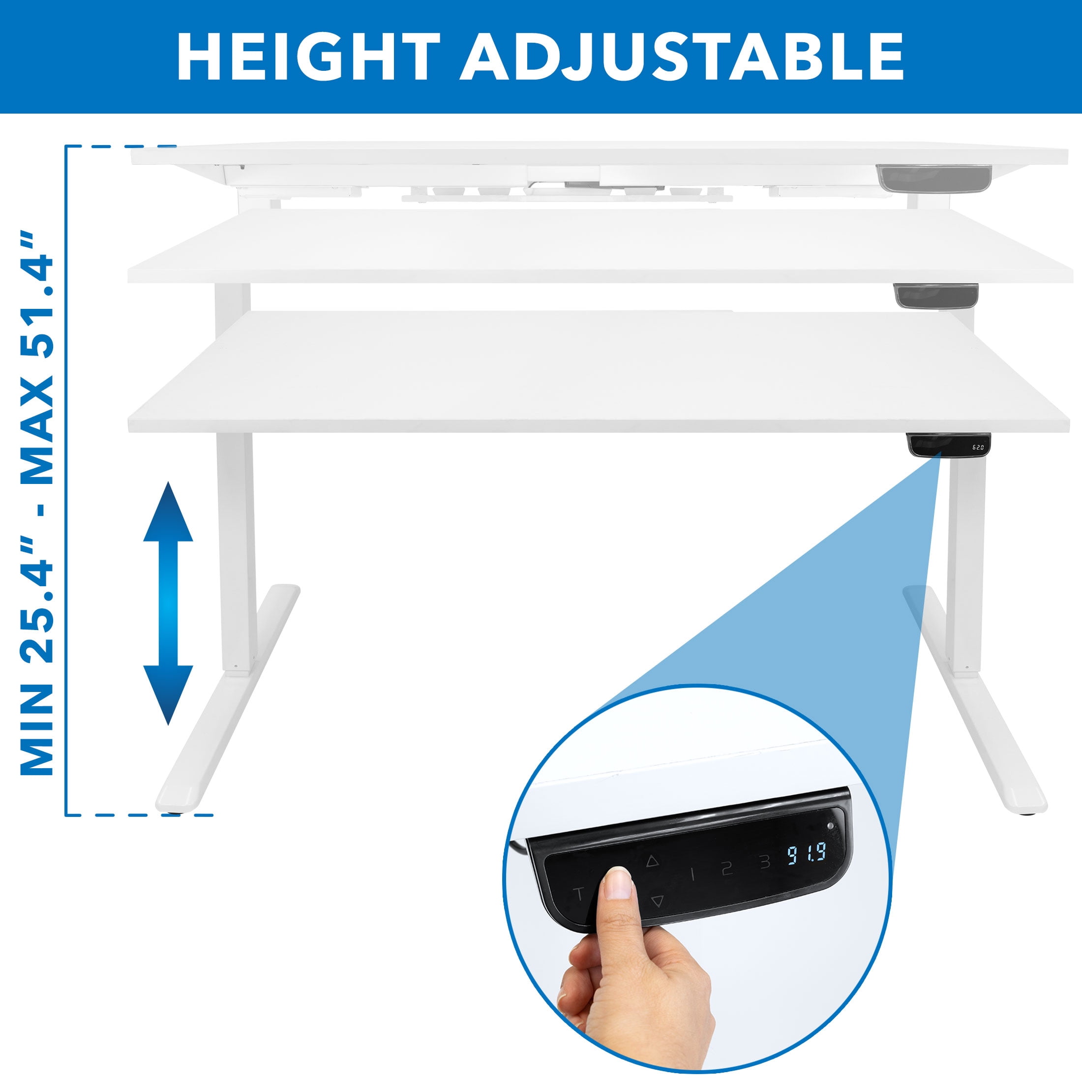 MI100033F is a white frame and extra-large white tabletop with dual motor Expands from 39.4″ to 63″ W and supports up to 275 lbs Quiet electric dual motor moves desk from 25.4” high to 51.4″ high Adjustable feet for all flooring surfaces Cable management rack Burn more calories and improve your posture