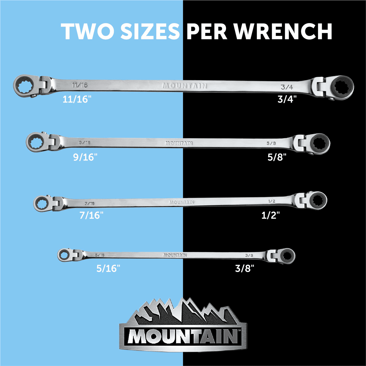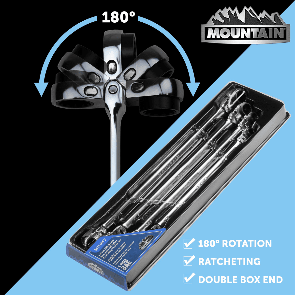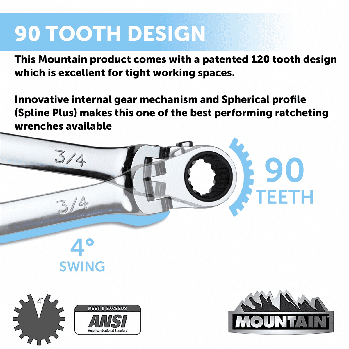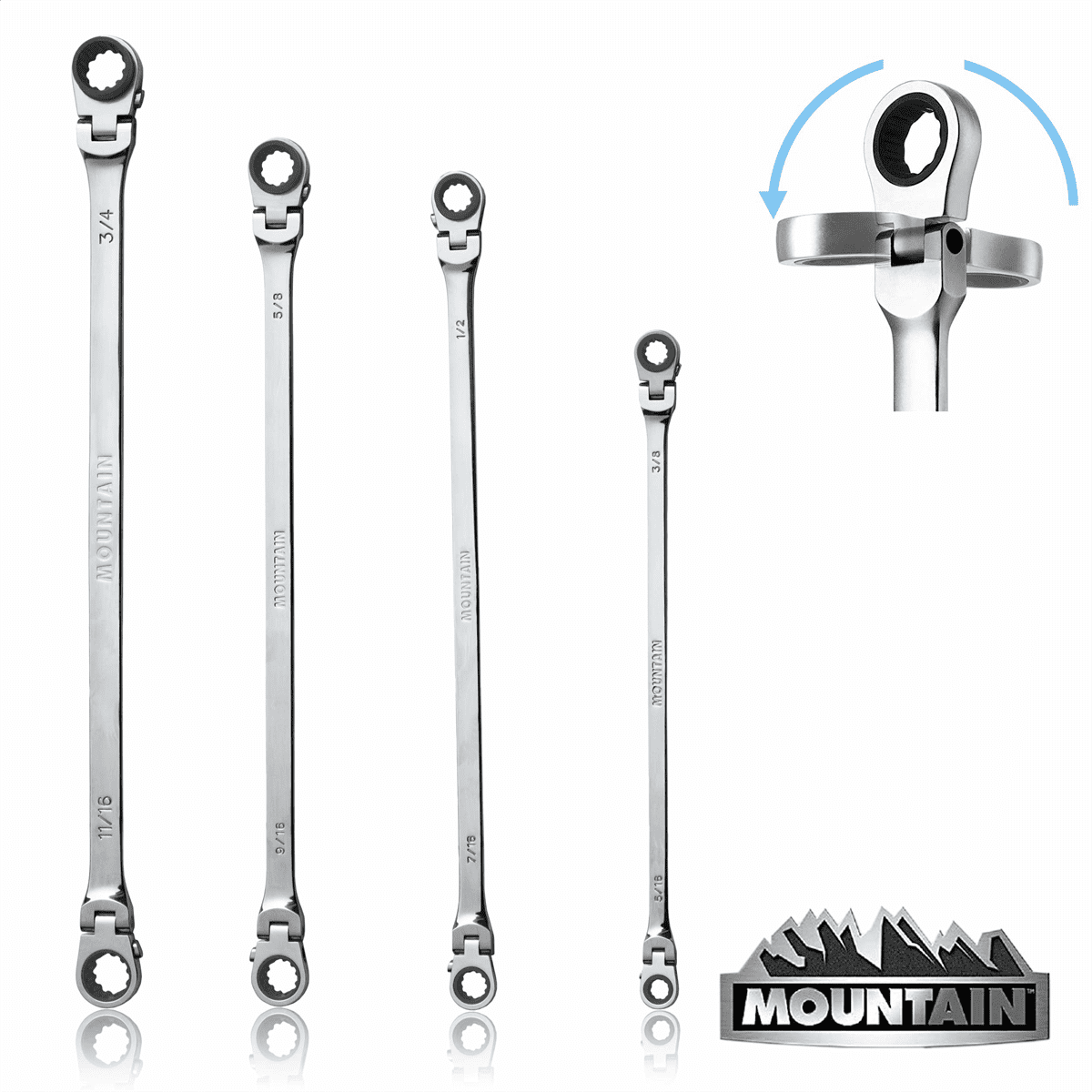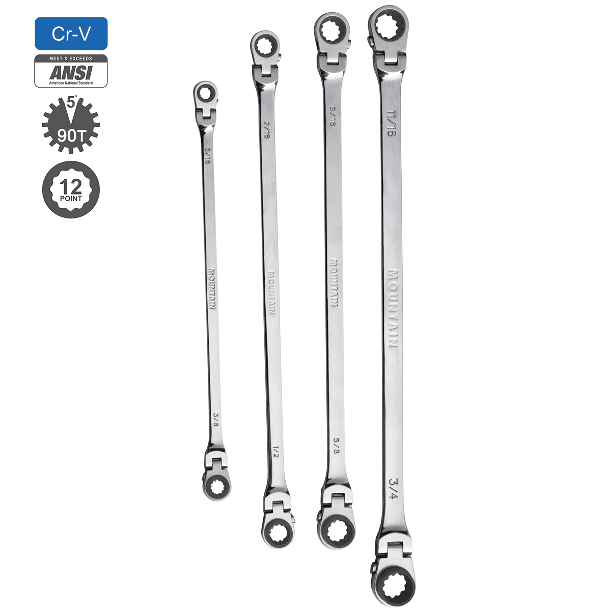 [VERSATILE]- Extra long, flexible and reversible making it the most versatile set of ratcheting wrenches on the market [90 TOOTH DESIGN]- This Mountain product comes with a patented 90 tooth design [180 DEGREES] – The 180°rotating head on both ends of the wrench allows the ratchet wrench to flexibly bypass obstacles for easy use at any angle [PATENTED DESIGN]- Innovative internal gear mechanism and Spherical profile (Spline Plus) makes this one of the best performing ratcheting wrenches available [COLLAR]- Raised box end gear provides more surface contact and access to recessed fasteners