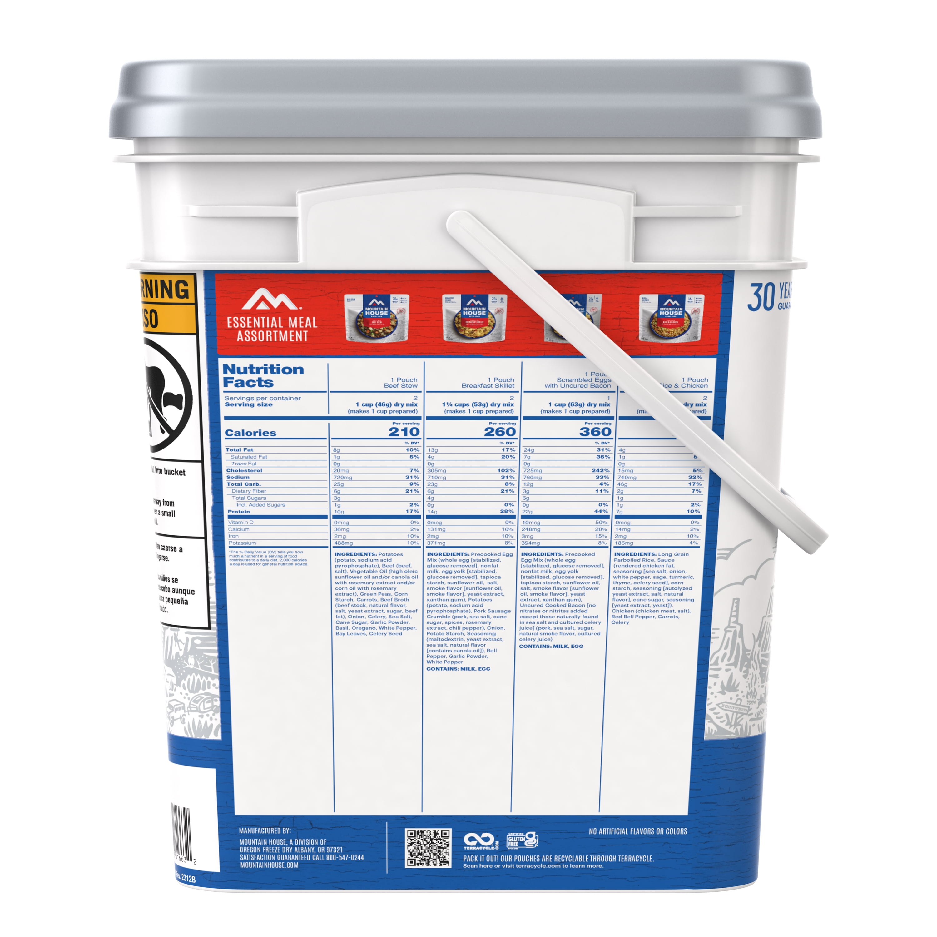 Mountain House Gluten-Free Freeze-Dried Shelf-Stable Just in Case Essential Bucket, 12 Counts Easy to carry bucket containing 12 meal pouches, perfect for outdoor adventures Includes 22 total servings of popular freeze-dried meals Meals included: (4) Beef Stew, (4) Rice and Chicken, (2) Breakfast Skillet, and (2) Scrambled Eggs with Bacon Quick and convenient preparation: just add hot water and enjoy in less than 10 minutes Unique pouch design offers a bowl-like experience for easy eating Requires 18 cups of water to prepare all meals in the bucket