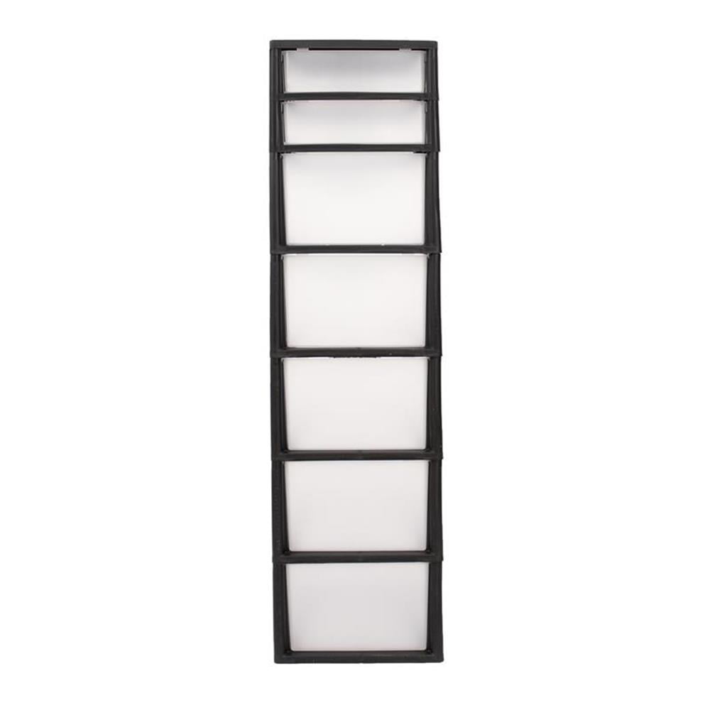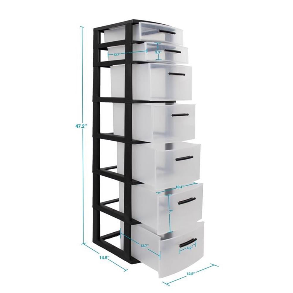 The Eclypse™ 7-Drawer Storage cabinet by MQ® is finished in clear Polypropylene (PP) resin material with a black frame. This storage cabinet includes 2 small drawers and 5 large drawers each is adorned with resin handles. This cabinet is sturdy and the drawers can be completely removed for easy cleaning. Manufacturer’s 1-year warranty. Assembly is required. Features : Keep your school, office, and crafting supplies organized with the Eclypse 7-Drawer Plastic Storage Unit Features seven (7) drawers that can be removed for easy cleaning Finished in clear Polypropylene Plastic with white frame Durable Resin handles 1-year limited warranty Assembly required Specifications : Product Dimensions : 47.2″H x 12.5″W x 14.5″D Product Weight : 13 lbs Drawer Dimensions : Small: 3.3″ H x 10.4″W x 13.7″D; Large: 7″H x 10.4″W x 13.7″D Drawer Weight Capacity : Small: 4.5 lbs; Large: 10 lbs