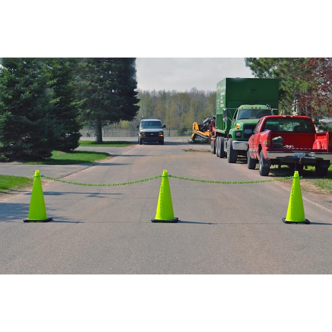 The Mr. Chain traffic cone and chain kit includes everything you need create an effective visual barrier to prevent unwanted traffic from entering specific areas. Great for pedestrian traffic zones, parking lots, constructions sites, warehouses, and more, these lightweight and portable traffic cones, cone connectors, and chains are a cost-effective barrier solution. Simply slide the cone connectors over the top of the safety cones and attach the brightly-colored plastic chain. The distinctive visual barrier allows you to block off a larger area with less cones by spacing the cones farther apart. The traffic cones are made of durable injection-molded PVC with a 14 x 14-inch base. The cone connectors and chain are constructed from high-density polyethylene with UV inhibitors to protect them from fading the sun and can be used indoors or outdoors.
