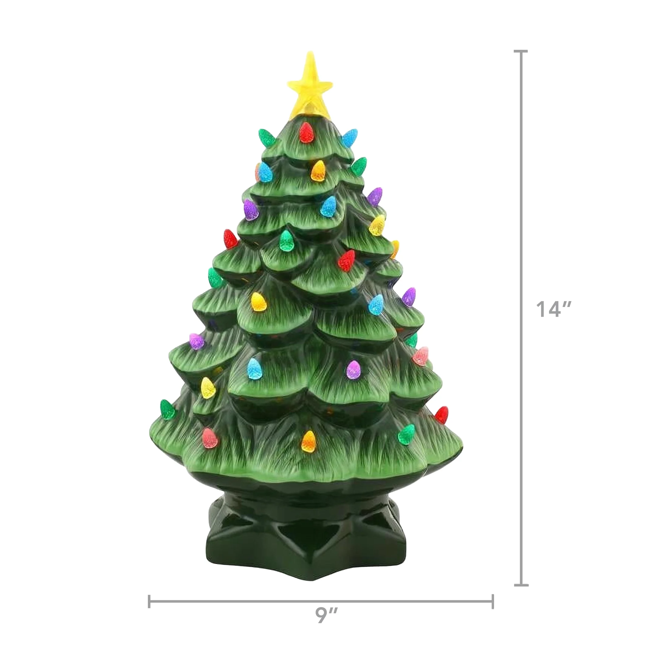 Nostalgic tree with multicolored faceted bulbs that bring back memories from Christmas past Crafted with durable ceramic construction for long-lasting use Features LED lighting and an illuminated star on top for a warm, festive glow Finished in a two-tone green color that complements any holiday decor Measures 14 inches tall, making it a perfect size for tabletops, mantels, or shelves Operates on 3 “C” batteries (not included) with a 4-hour timer for convenient use as a nightlight