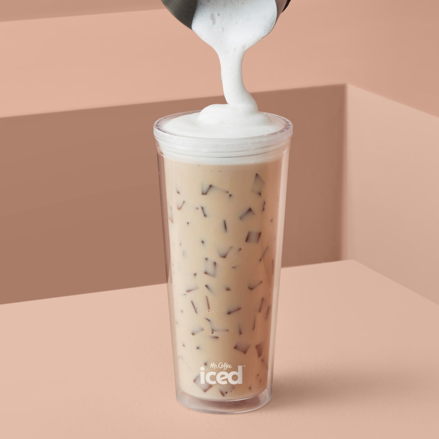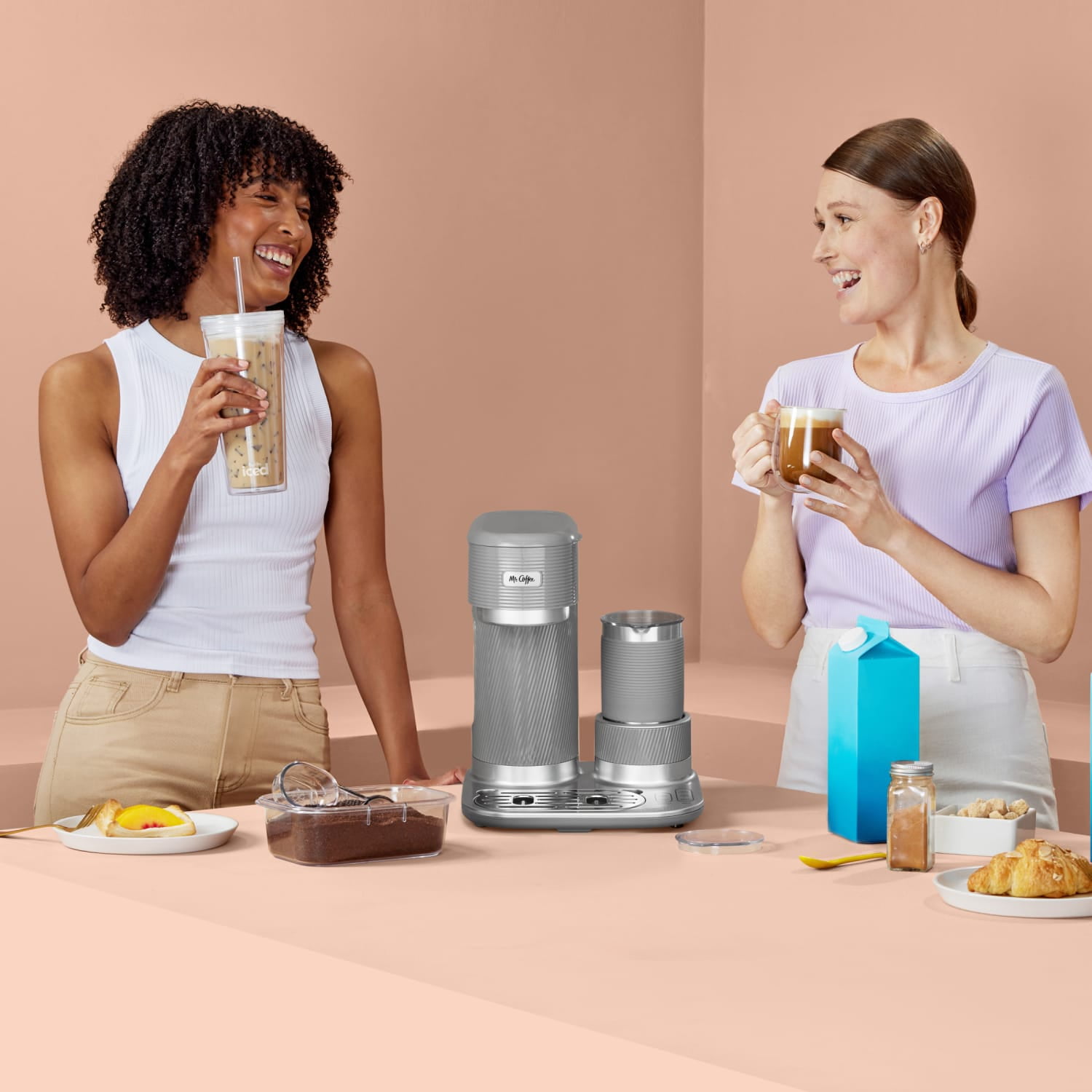 With its convenient 4-in-1 functionality—latte, cappuccino, iced, and hot coffee—the Mr. Coffee Single-Serve Latte Lux™, Iced, and Hot Coffee Maker in gray makes it easy to brew your favorite coffeehouse drinks at home. Its textured design, with chrome elements and capacitive touch panel, will elevate your kitchen. The built-in frother and preset latte and cappuccino buttons automatically adjusts frother speed to create hot or cold foam. Easy measuring system has a dual-sided scoop for consistently flavorful coffee that’s never watered down, and ideal coffee-to-milk ratios for perfect latte and cappuccino froth. Brew a concentrated shot of coffee for lattes and cappuccinos, as well as 8, 12, or 16 oz. of bold, hot coffee or single servings of refreshing iced coffee. Single-serve reusable filter delivers taste without waste. Enjoy iced coffee and lattes at home, or on the go with the double-wall insulated 22-oz. reusable tumbler. Includes recipe book for lattes, cappuccinos, and more.