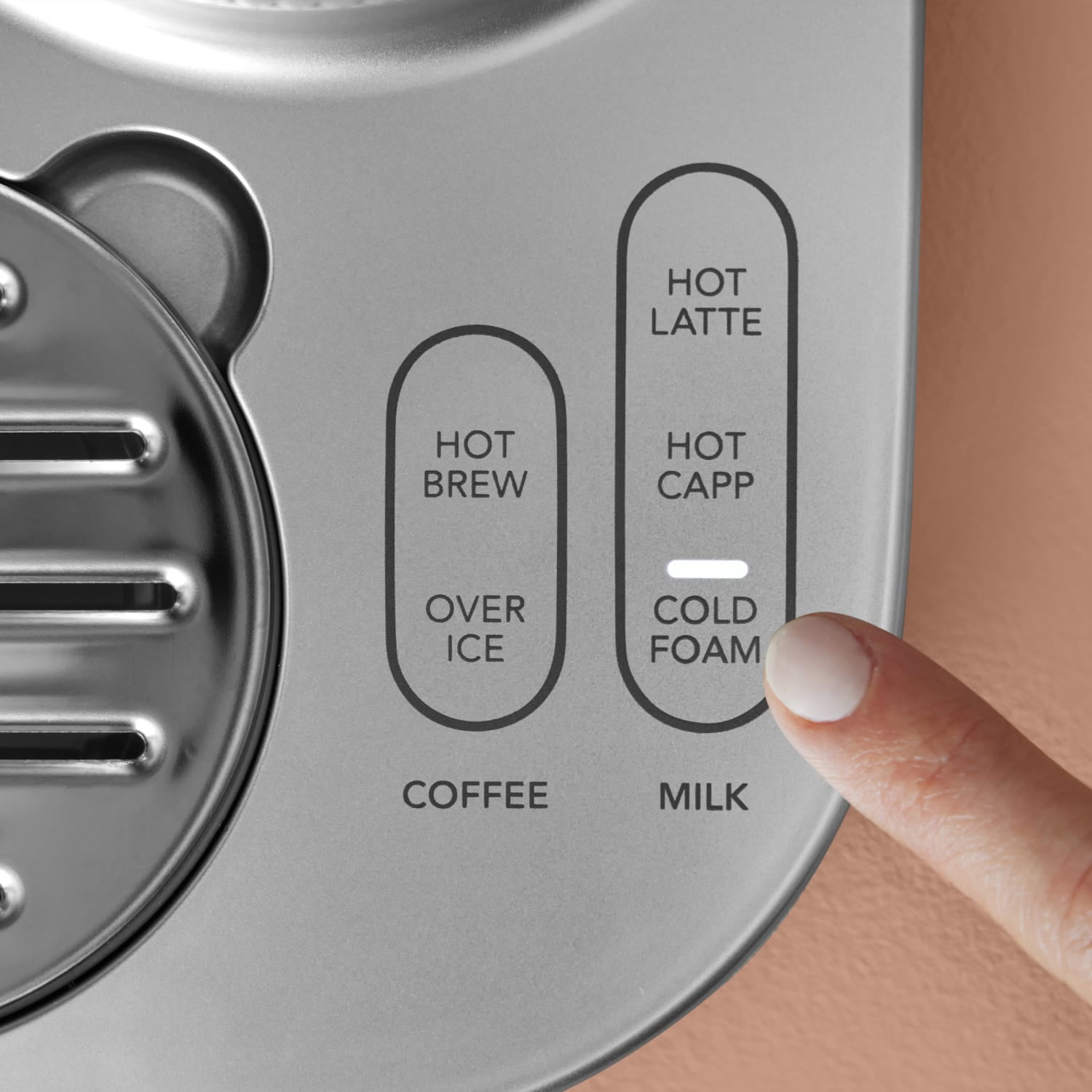 4-in-1 Functionality: The convenient 4-in-1 functionality lets you brew, froth, and create coffeehouse-style lattes, cappuccinos, iced, and hot coffee drinks, all with one personal coffee maker Integrated Automatic Milk Frother: The built-in milk frother automatically adjusts speed to create perfect hot or cold foam for coffeehouse-style lattes and cappuccinos at the touch of a button Pod-Free Brewing: Create flavorful hot or refreshing iced coffee in minutes, and concentrated coffee shots for hot or iced lattes and cappuccinos Easy Measuring System: The magic is in the measurements! The integrated measuring system makes it easy to brew the perfect amount of coffee and froth the right amount of milk for iced coffee, hot coffee, lattes, and cappuccinos Elevated Style: Capacitive touch panel and textured design with chrome elements enhances the look of your kitchen More Cup Sizes to Choose From: Multiple brew size options let you brew 8, 12, or 16 oz. of bold, hot coffee, or a single serving of refreshing iced coffee Recipe Inspiration: The included recipe book provides inspiration for making great tasting coffeehouse favorites, including iced and hot lattes, cappuccinos, iced coffee, and hot coffee Compact Size Saves Valuable Counter Space: All the features of a standard-size latte maker, in a slimmer, space-saving design Includes All the Extras: Includes a 22-oz. reusable tumbler, lid, straw, and coffee filter, plus a dual-sided coffee scoop