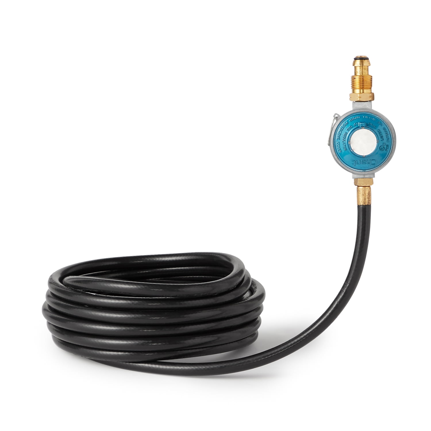 35,000 BTU per hour For use with propane gas Heats up to 875 sq ft No electricity required Tip-over switch safety shut off Operates on standard 20-lb cylinder Fully assembled and ready to use Clean burning – quiet and odorless P.O.L. connection with 12-ft hose included