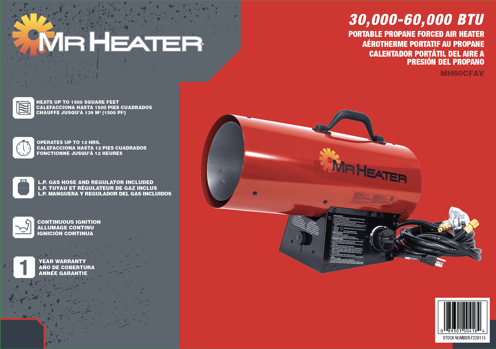 Continuous ignition Emits 30,000 – 60,000 BTU/hr Variable heat settings and adjustable output angle for greater control Runs up to 12 hours on 20-lb tank (low setting) Heats up to approximately 1,500 square feet High temperature limit switch LP gas hose and regulator included Automatic overheat safety shut off High output fan Works reliably in cold temperatures Industrial durability Outdoor use only