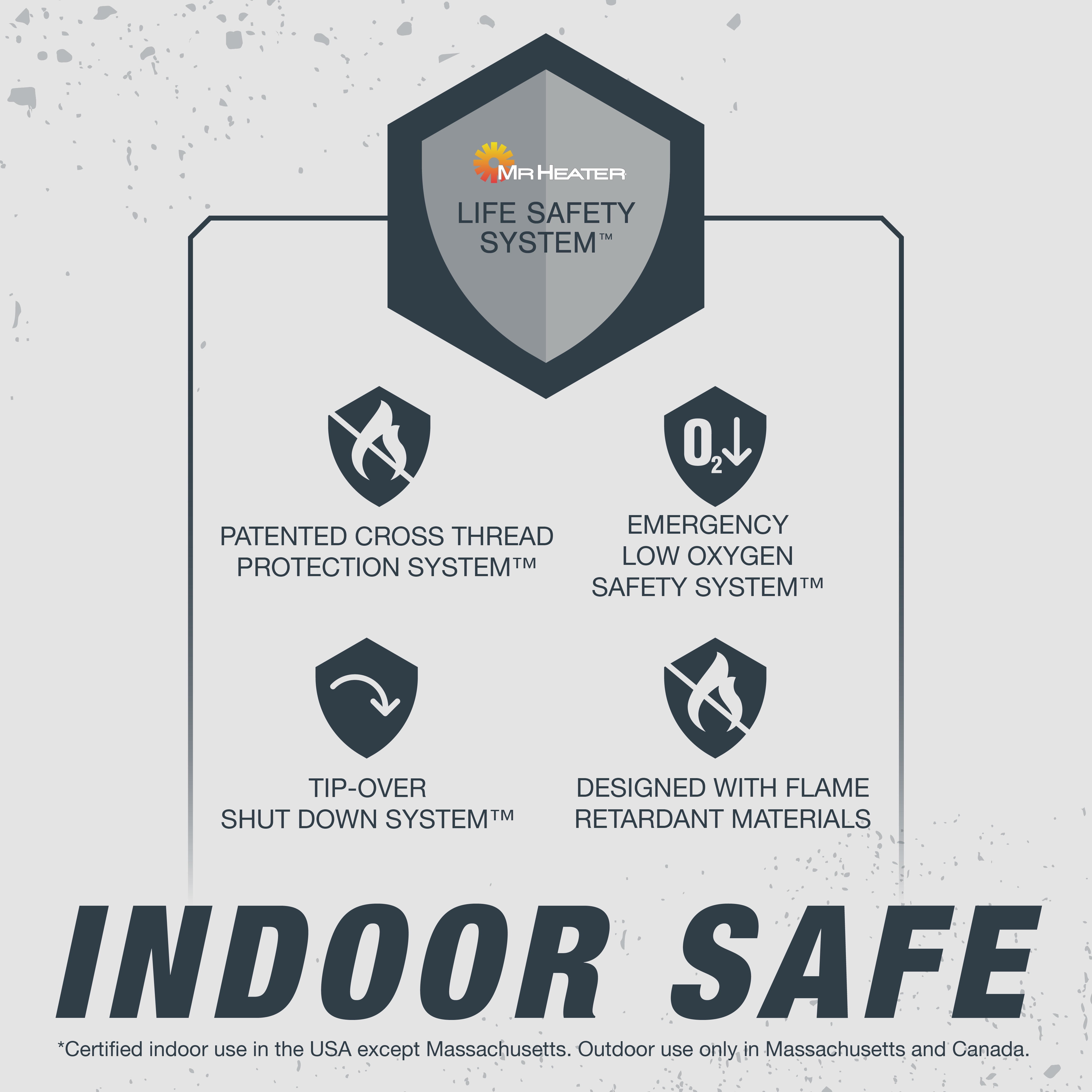 Emits 4,000 or 9,000 BTU/hr radiant heat Designed and approved for indoor and outdoor use Heats up to approximately 225 square feet Features emergency low oxygen safety system 2 temperature settings: low and high Runs 5.4 hours on low and 2.4 hours on high with 1 lb propane cylinder Equipped with accidental tip-over switch Contains single control knob start Thermal shut-down system Includes piezo igniter Features swivel regulator for easy installation of propane Directly connects to 1 lb disposable propane cylinder Connects to 20 lb cylinder with optional hose and filter Suitable for recreational or professional use Constructed with self extinguishing materials Clean burning and odor-free CSA Certified Not for sale in California or Massachusetts Model#: MH9BX
