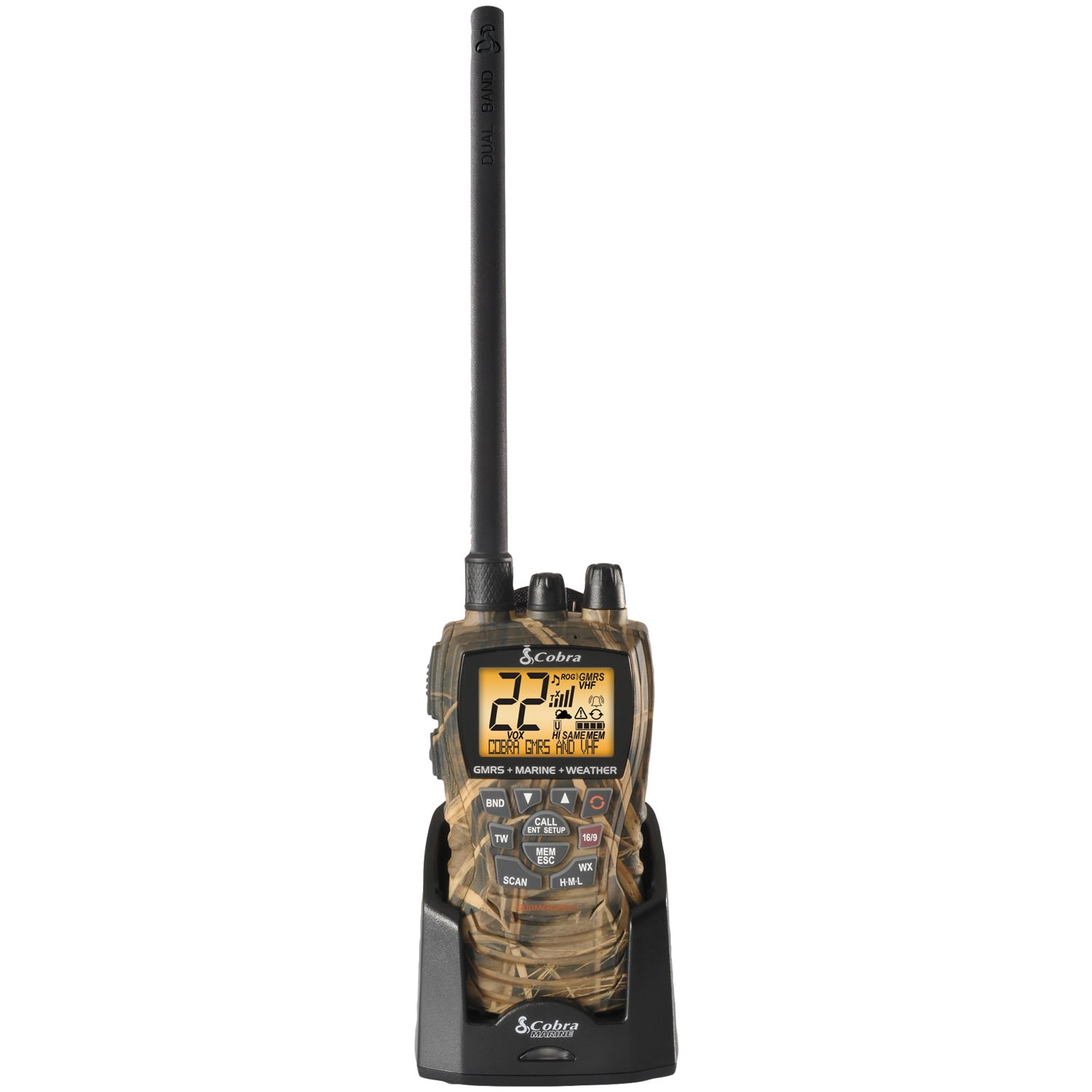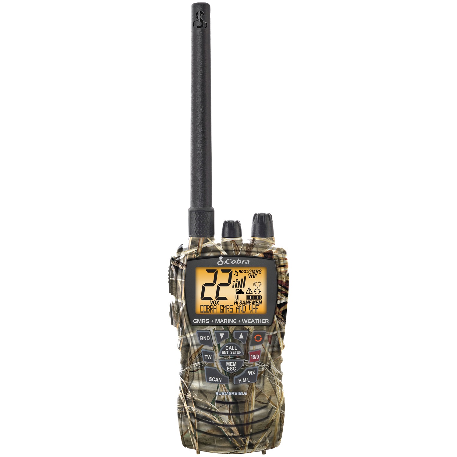 028377201721 COBRA MRHH450CAMO This unique and exciting Realtree┬« Max 4 Pattern Design All-Terrain-RadioÔäó is designed for your year round and multipurpose use! This compact floating unit has the same great VHF radio ruggedness quality and reliability Cobra is known for. In addition it has CobraÔÇÖs exclusive Rewind-Say-Again┬« feature & GMRS channel Dual-Band functionality. Other features include a long lasting Lithium Ion Polymer battery S.A.M.E. Weather Alert filtering and a rapid charger.This is a professional quality VHF radio but it is also a high power combination VHF/GMRS radio. GMRS (General Mobile Radio Service) is the modern standard in consumer grade two-way communications. It also includes all of the core features like; Noise canceling microphone NOAA weather radio Weather Alert JIS7/IPX7 rated submersible and BURP.All-Terrain-RadioÔäó: Use on boats ATVs snowmobiles roadtrips and many other usesRewind-Say-Again┬«: Replay missed VHF callsFloating: Never lose your radio. The floating design and orange core make retrieval easy if dropped overboardWeather Alert with S.A.M.E: Weather and emergency alerts only if threat is nearby6 Watt VHF and High Power GMRS: Select between Low Medium and High power for short and long range communicationCOBRA MRHH450CAMO 028377201721