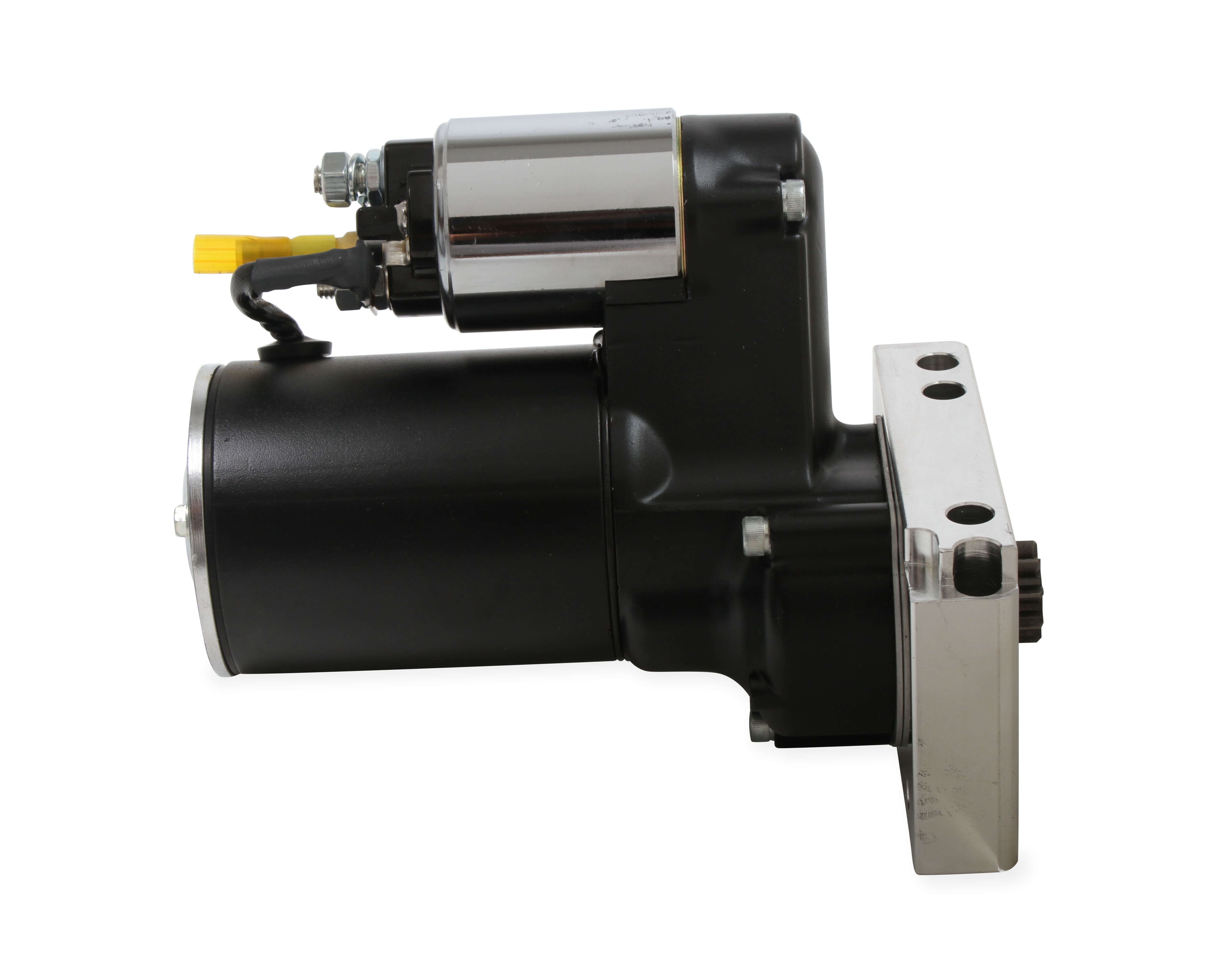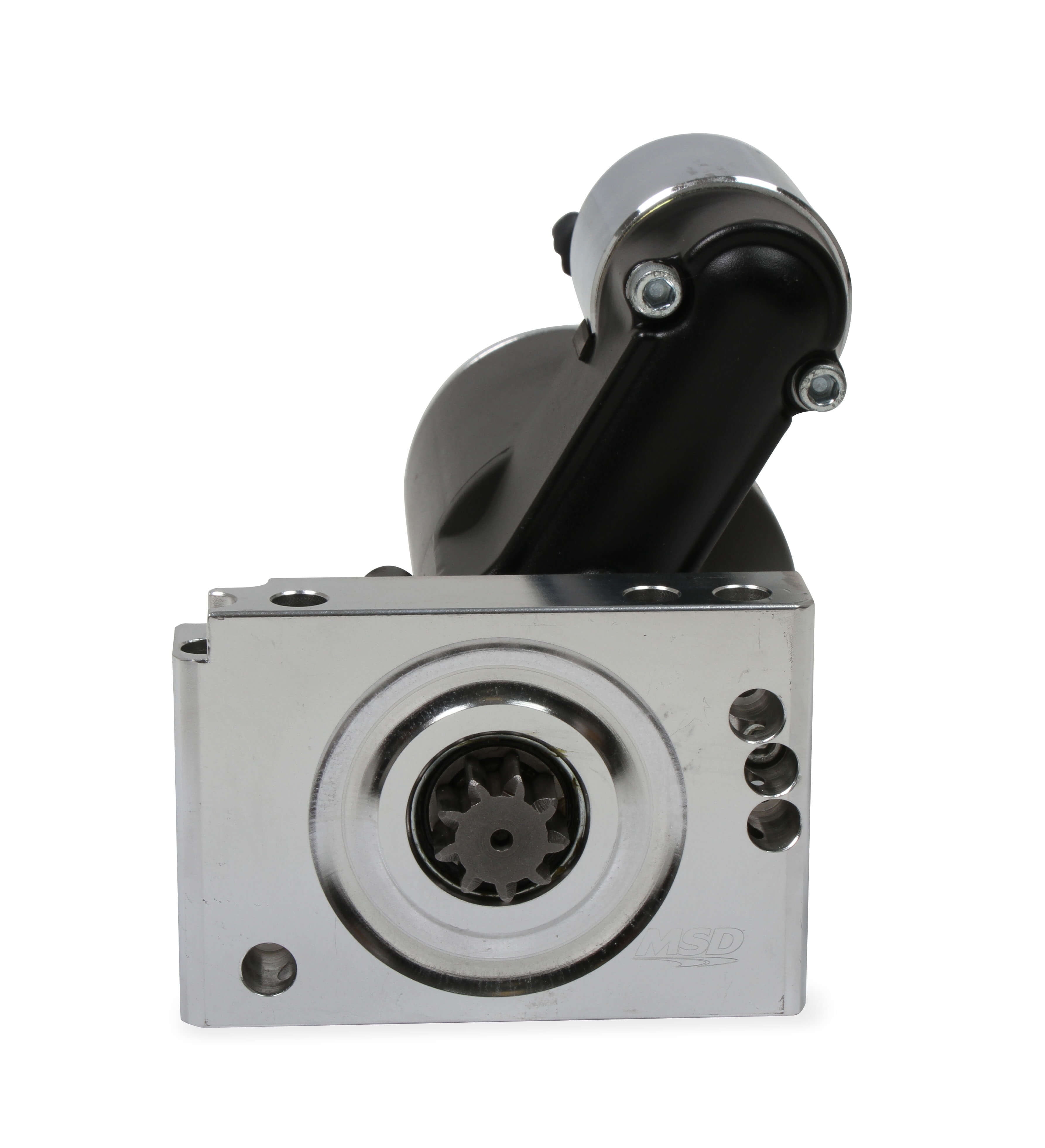 High Torque starter compatible with small block and big block Chevy® engines with STRAIGHT MOUNT starter mounting holes. This product is not created or sold by Chevy®.; MSD’s DynaForce Starters feature all new components beginning with a three horsepower motor. This power is used to crank over the reduced 4.4:1 gear set to deliver great torque to the engine’s ring gear to get the engine turning. The compact housing clears most headers and oil pans, but just in case, MSD made the billet mount so it can be clocked in different positions to help in tight applications. The assembly is powder coated black and will stay looking good, even though it’s underneath your car.;