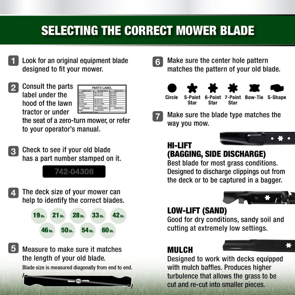 Fits Riding Mowers and RZT Mowers with a 42-inch Cutting Deck, (1997 – ) 3-in-1 blades can mulch, bag or side discharge grass clippings For Troy-Bilt, MTD, Craftsman, MTD Gold, Bolens, White Outdoor, Yard Machines, Yard Man and Huskee. Refer to the parts list label under the rider hood or under the zero-turn seat mounting bracket for original equipment parts Fits Cub Cadet XT1 LT42 C, LT42 EFI, LT42 KH and XT2 LX42 EFI, LX42 KH and LX42 KW Fits Cub Cadet RZT42, RZT-L42 KH, RZT-L 42, RZTS 42 and RZT-SX 42 KH, ZT-1 42KH Fits Huskee LT 4200 Fits Troy-Bilt Super Bronco 42 Hydro, TB42, Pony 42X, Pony 42T, Pony 42, Bronco 42 Auto, TB1942, Pony, Bronco, TB42 Hydro, TB2142, Colt XP, Mustang XP 42, Range Rider, RZT 42 Fits Craftsman PYT9000, T1100,T7800, T1000, T1200, T1300, T1400, T1800, T2100, T8000, T105, T110, T130, T210, T2100, T3000, Z6000, ZTL7000, LT1500, LT2000 Fits White Outdoor LT-135, LT-2000,LT-15, LT-155,FST-16, LT-16, Lt-17, LT-165, LT-175, LT-1500, LT-1500, LT-1650, LT-1855, LT-1855H, LT-542G, LT-542H, LT-942G, ZT-42, ZT-4200, ZTT-1850 Fits murray M155-42, M15542, M175-42, M1642, MZ2142, RZT-42, MZ210-42, M195-42