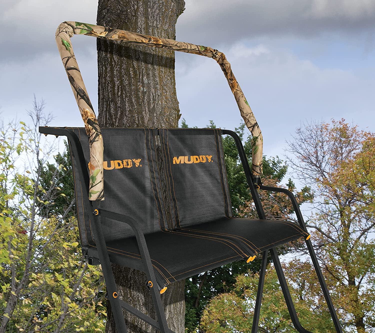 MUDDY MAXIM TWO-MAN LADDER STAND – Wait as long as you need from the Muddy Skyrise 2-person ladder stand alone or with someone with enhanced performance needed for fruitful results 2-PERSON SEAT AND PLATFORM – The 38″W x 18″T Flex-Tek bench seat and 38″W x 17″D foot platform are sized to accommodate one or two people; the system includes a padded, adjustable shooting rail that flips out of the way SPACIOUS & COMFORTABLE STAND – This all-steel 17’H stand offers the space and comfort needed for hardcore dawn-to-dusk; lightweight yet sturdy, it gives you a stable, open position from which to take your trophy shot PADDED SHOOTING RAIL – This stand comes feature packed with a padded shooting rail, which provides a steady shot as well as holds the ability to flip up and out of the way for a clear shooting lane DESIGNED WITH HUNTERS IN MIND – Easy to install; this ladder stand is perfect for use on trees with a minimum 9″ diameter; includes a support bar, 1″ ratchet strap, two 1″ stabilizer straps, and 2 full-body harnesses