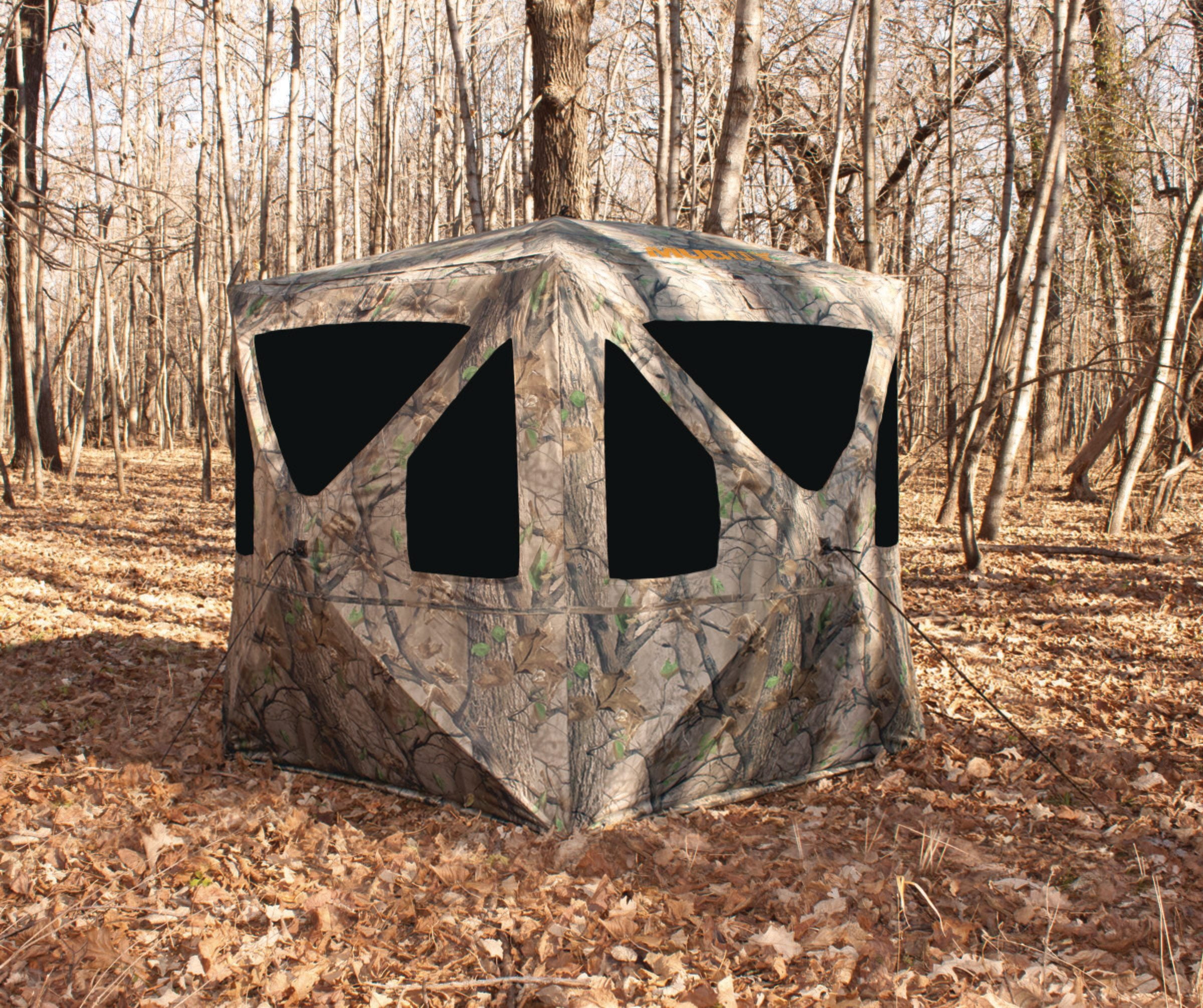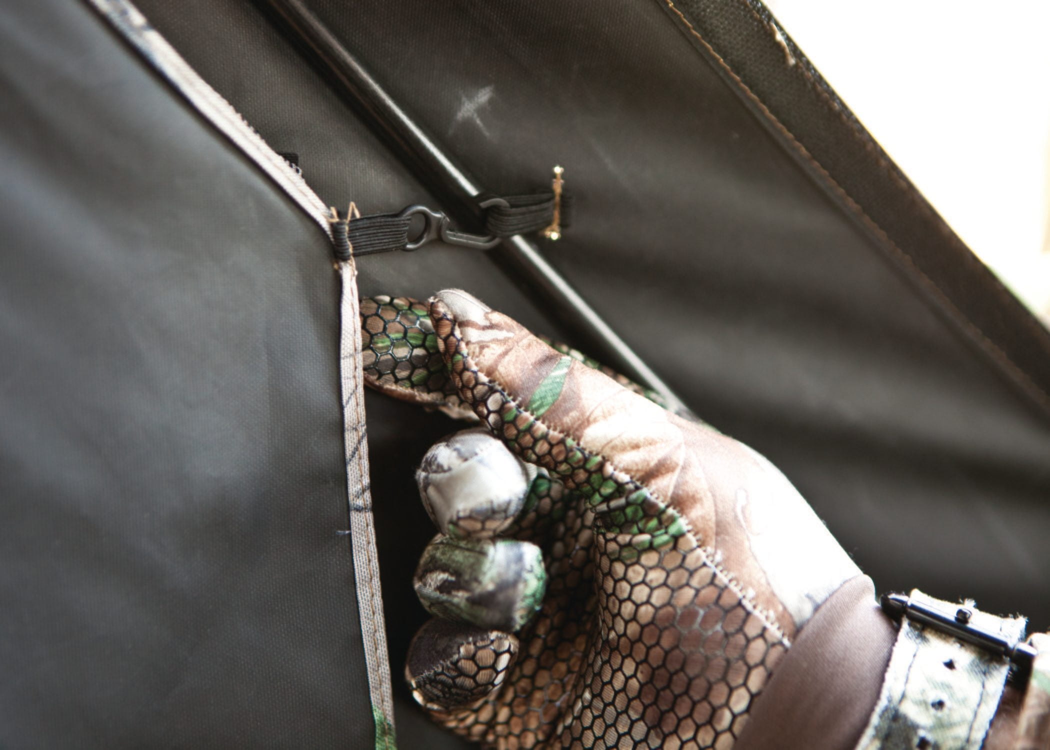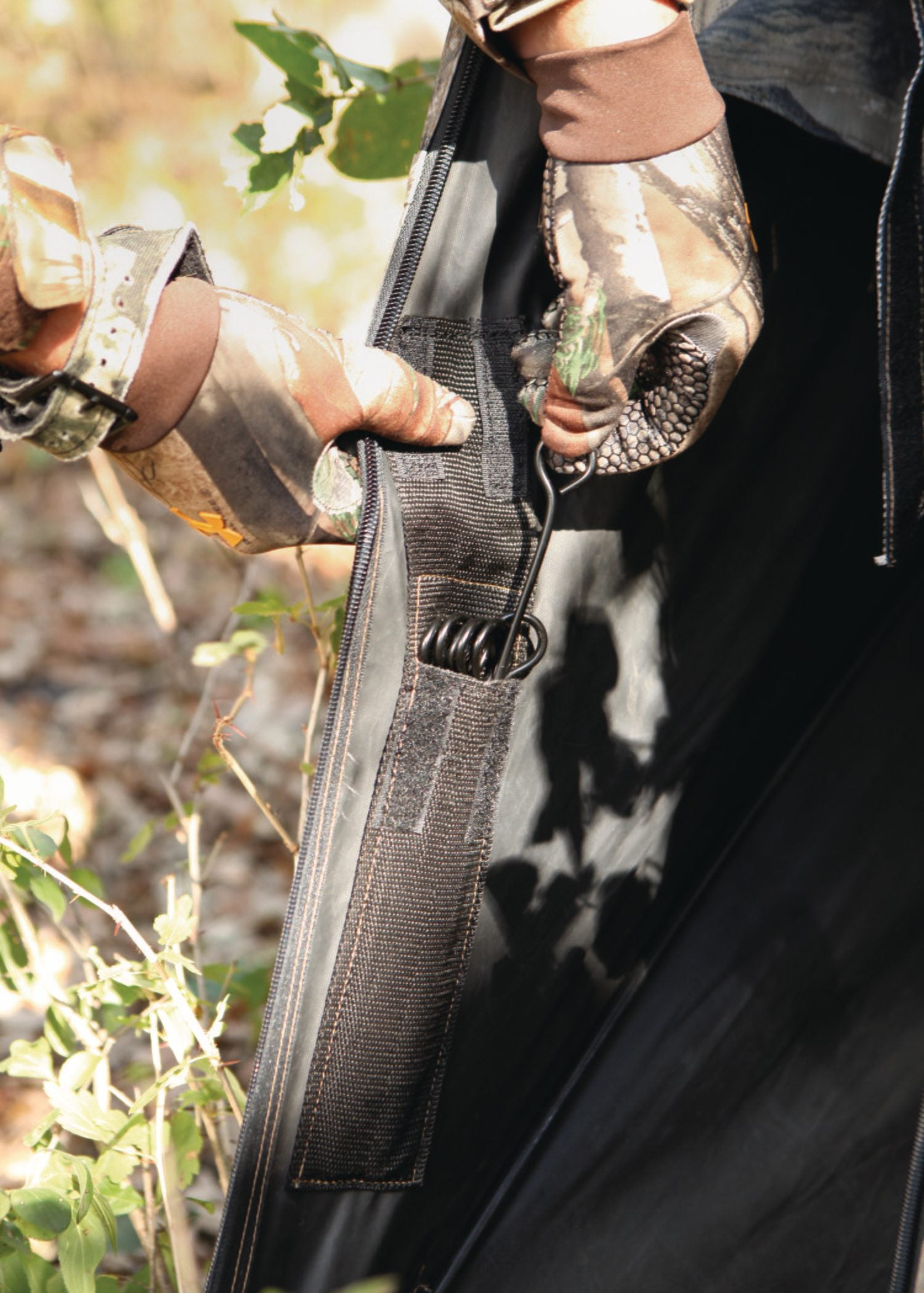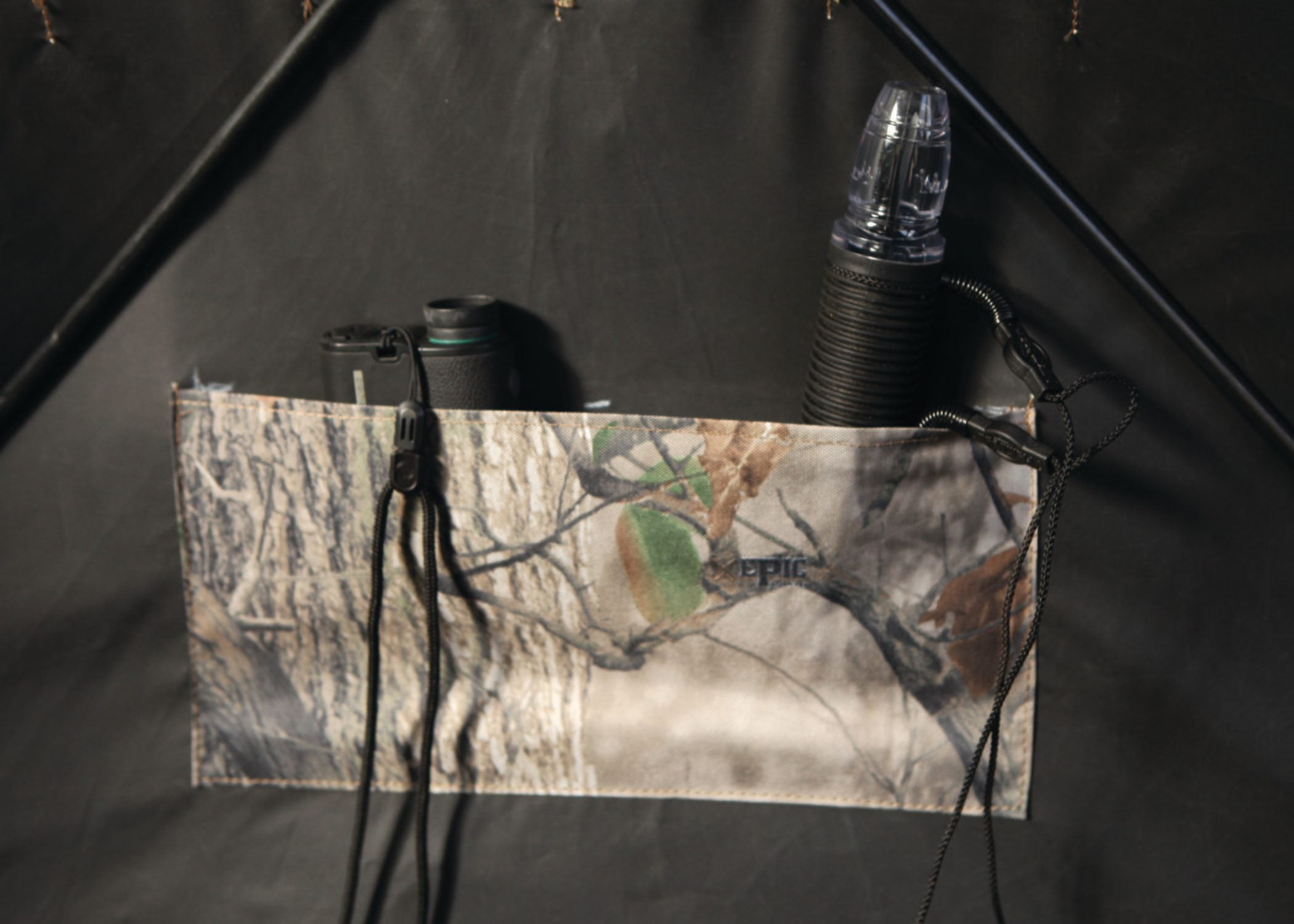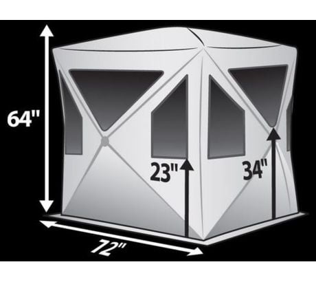 CONSTRUCTION: Black Backed, Water Resistant Fabric in Epic Camo;DIMENSIONS: 72” Shooting Width x 64” Standing Height;HEIGHT TO BOTTOM OF WINDOWS: Corner Windows – 23”, Center Windows – 34”;CARRYING BAG: Standard Carry Bag with Backpack Straps;STAKES: 9 Steel Stakes Included in Stake Pocket;DOOR: Easy Access Door with Full-Length Zipper;WINDOW SECURING: Removable Shoot-Through Mesh with Silent One Hand Release Hooks to Adjust & Lower;BRUSH STRIPS: Lower Strips Included for Easy Adaption to Your Location;OTHER FEATURES: 4 Tie-Down Ropes to Secure Against Wind;WEIGHT: 16.8LBS