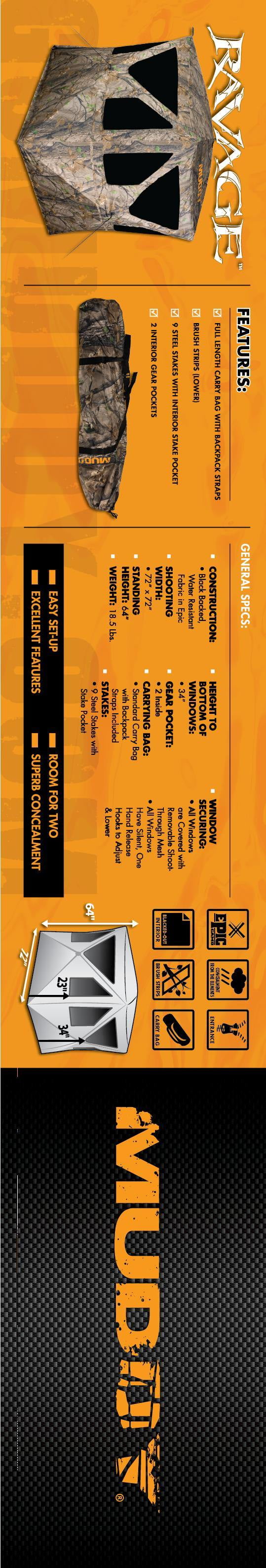 The Muddy Ravage three person pop-up groung blind is a great option when looking for a quick to set up blind. This blind sets up in seconds! Features completely blacked-out interior to help conceal you while in the blind. It has silent, one-hand release hooks for window adjustment. Includes 9 steel stakes with an interior stake pocket and 2 Interior Gear Pockets. Comes with the standard carry bag for storage.