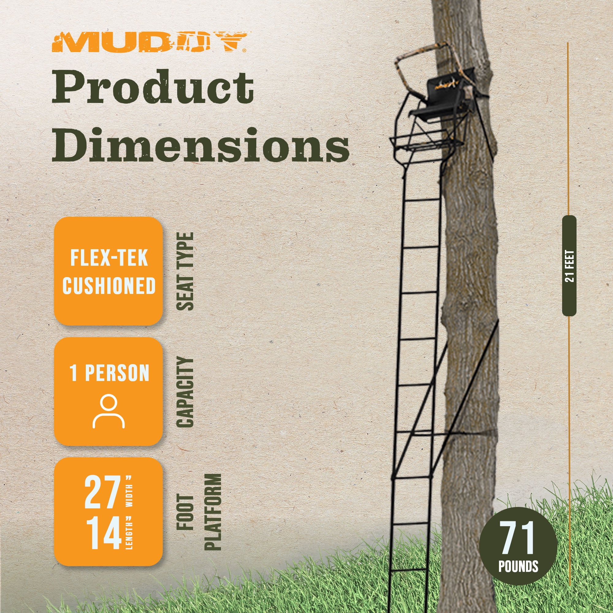 Scope out hunting spots and hunt securely from this 1-person ladder tree stand with included safety harness 21-foot-tall ladder stand lets you stay out of sight of deer and other game Large, waterproof lumbar-style cushioned seat and padded shooting rest offer all-day comfort Features silence technology throughout the stand so there’s no noise due to metal-on-metal contact Constructed from heavy-duty, DXT oval tubing that’s strong, sturdy, and easy to grip Fiber-Guard coating provides resistance to weather and a no-slip grip Adjustable support bar and 4 single-rail bolted ladder sections create a solid foundation Platform with D-Force 3-inch expanded metal grates supports up to 300 pounds Height: 21 feet Seat Dimensions (W x D X H): 26 x 18 x 24 inches Foot Platform Dimensions (W x D): 27 x 14 inches Weight: 71 pounds
