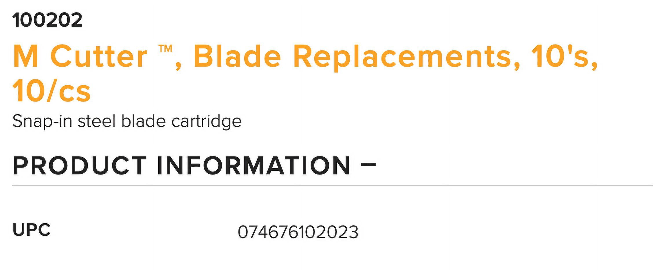 The Mueller® M Cutter ? Athletic Tape Cutter stainless steel blade replacements easily snap-in to the M Cutter ?. Use them to safely slice through stiff athletic-tape wraps. These blades come ins package of 10.