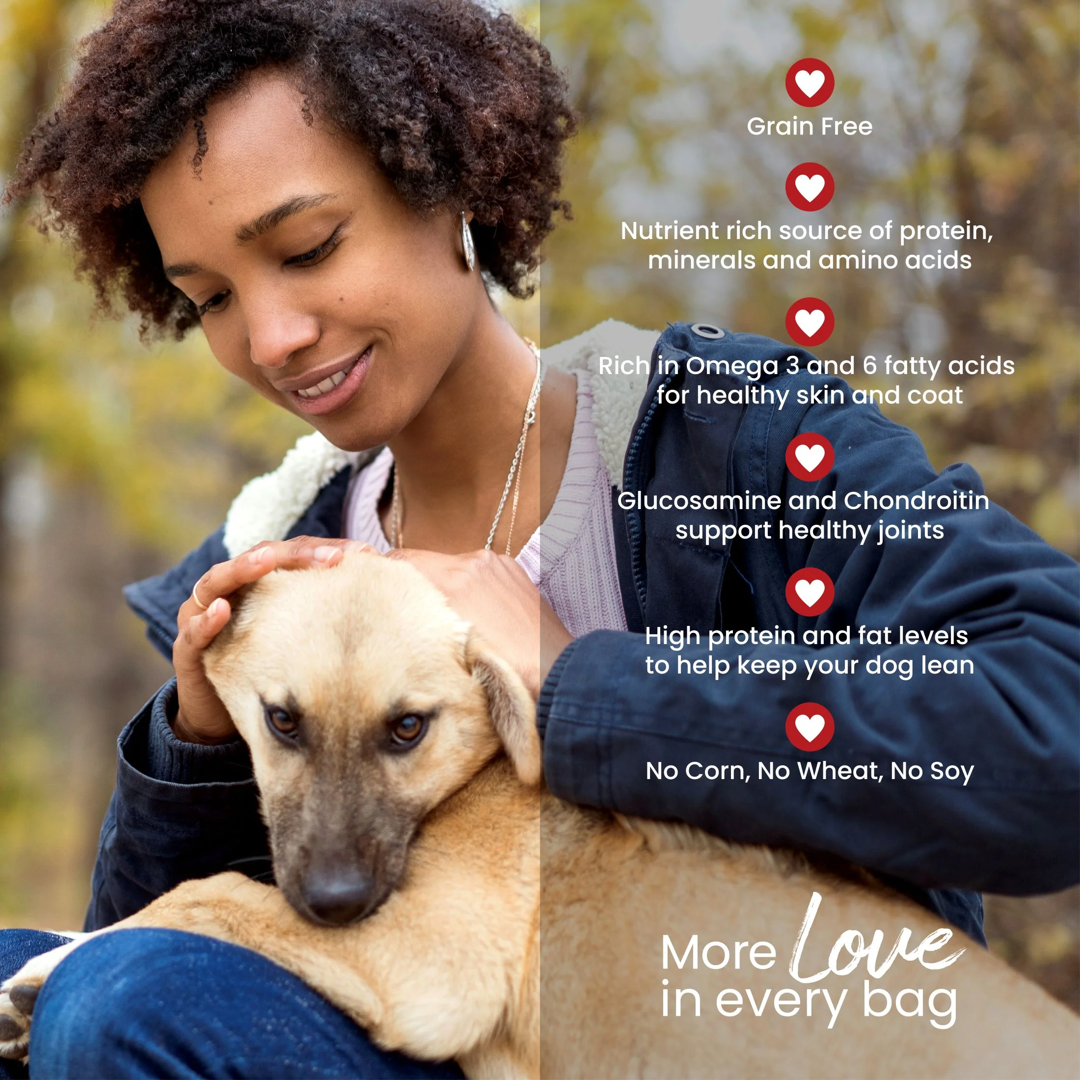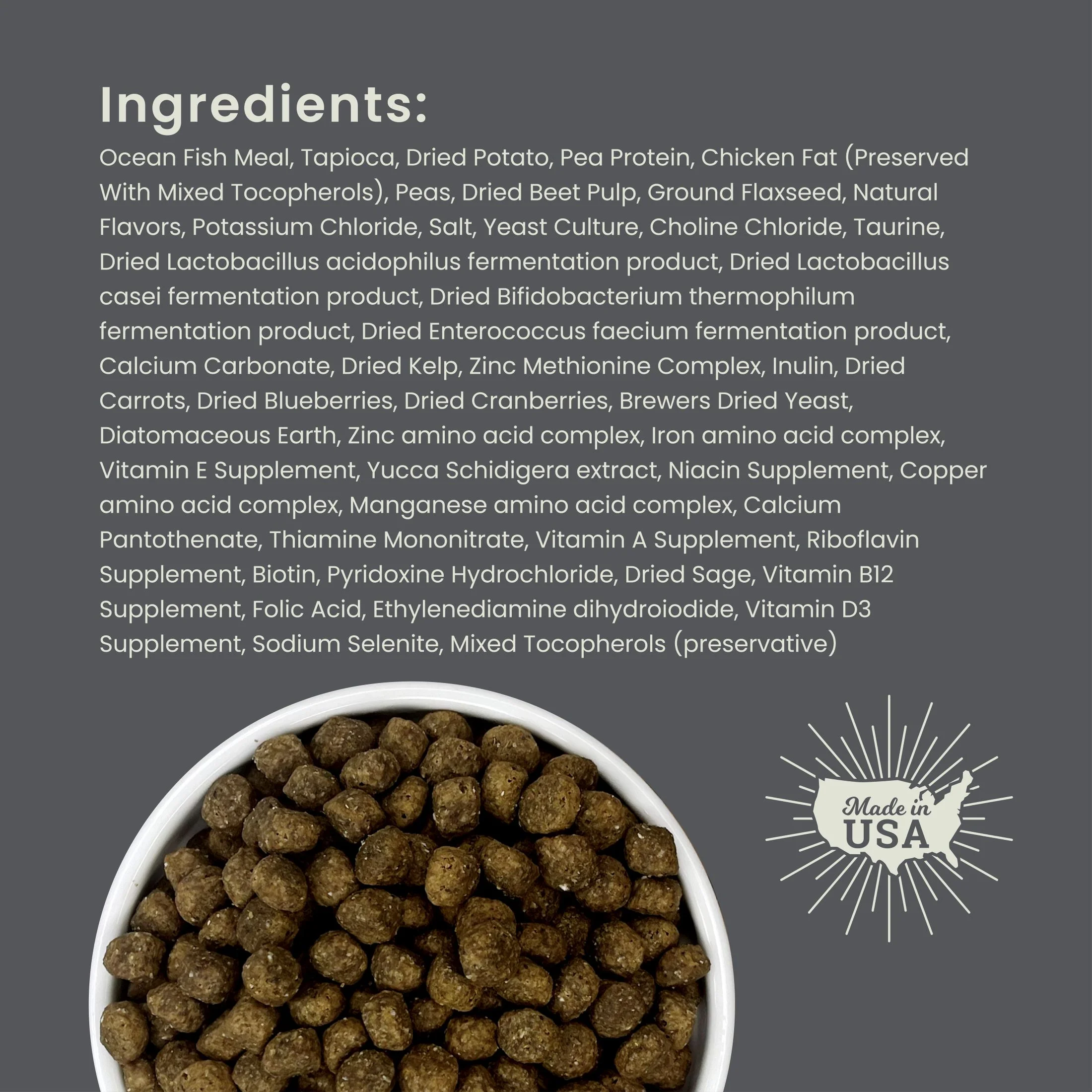 High Protein and Fat levels minimum of 26% protein and 15% fat Ocean Fish Meal – a very lean source of protein Prebiotics and Diamond V Yeast to improve digestion Grain free without Corn, Wheat or Soy Suitable for all breeds, sizes and lifestages Fruits and vegetables plus kelp provide vitamins and trace minerals naturally With four strains of probiotics to support a healthy gut 513 kcal/cup please see feeding instructions for specific needs of your dog.