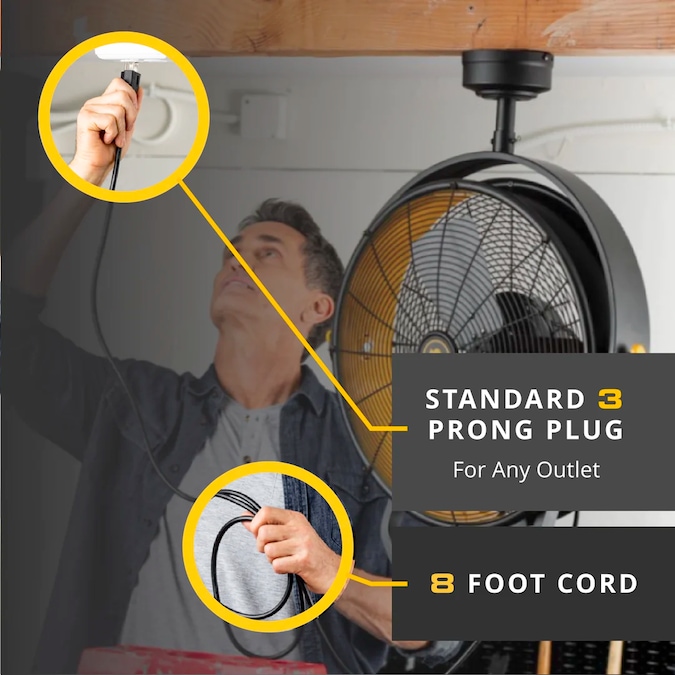 - Easy Installation, No Hard Wiring: With the standard 3-prong plug, our fan effortlessly connects to any wall or ceiling outlet; most garages have a spare plug near the garage door opener, making it the ideal spot for our garage fan; utilize the 96-inch cord to reach the most suitable outlet available.