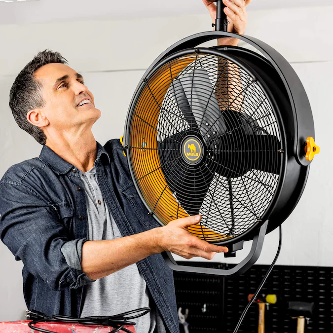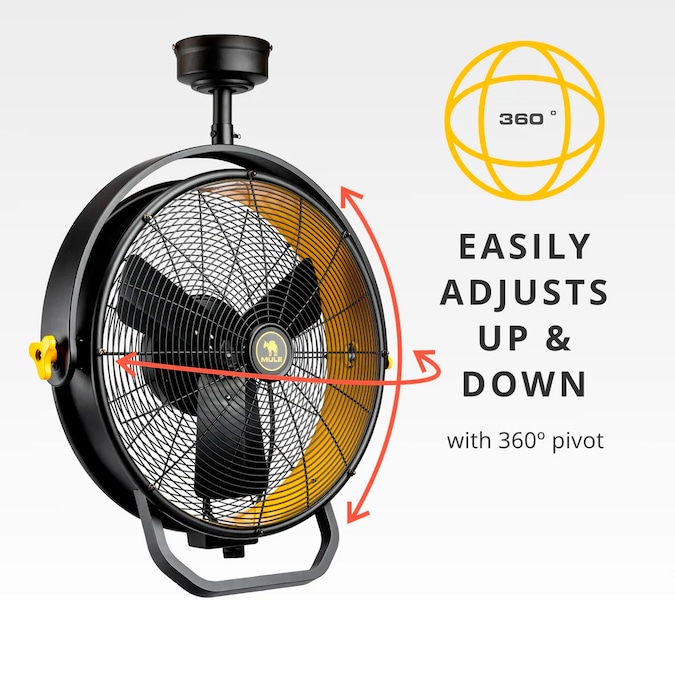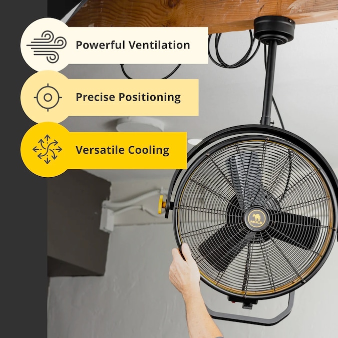 The MULE Garage Fan is the ultimate upgrade for your garage or workspace. Say goodbye to stifling heat, and experience exceptional airflow and lasting comfort throughout every season. With its effortless installation, the Garage Fan features a universal mounting bracket and standard 3-prong plug, allowing you to easily position it exactly where you need it. No junction box installation is required. With its 360-degree swivel and easy-to-use adjustment knobs, you have full control over directing the airflow. Whether you need a targeted breeze or widespread circulation, the MULE Garage Fan delivers. Need flexibility? The MULE Garage Fan can be installed wherever you require it. Easily set it up in your preferred spot without any hassle. Just screw two wood screws into a joist to securely hang the fan. Plus, you have the option to choose between a 6-inch or 12-inch downrod for customized mounting height. Designed specifically for garages and workshops, the MULE Garage Fan ensures you never have to deal with stagnant air again. Its powerful 3-speed functionality boasts an impressive 3000 CFM on high speed, effectively moving all the air you need to stay comfortable while tackling your projects. At MULE, we’re dedicated to developing top-notch solutions for everyone from everyday DIYers to professionals. Our products are designed to meet the highest standards of performance and durability. The MULE Garage Fan is the ultimate upgrade for your garage or workspace. With its effortless installation, the Garage Fan features a universal mounting bracket and standard 3-prong plug, allowing you to easily position it exactly where you need it. No junction box installation is required. With its 360-degree swivel and easy-to-use adjustment knobs, you have full control over directing the airflow. Whether you need a targeted breeze or widespread circulation, the MULE Garage Fan delivers.