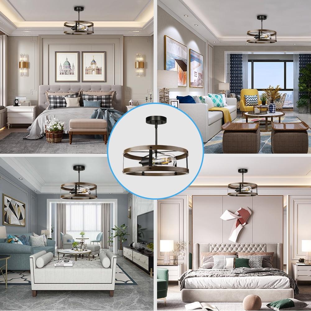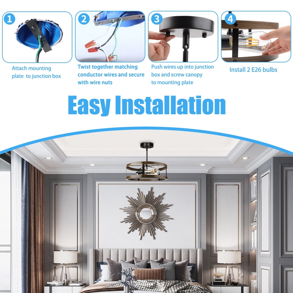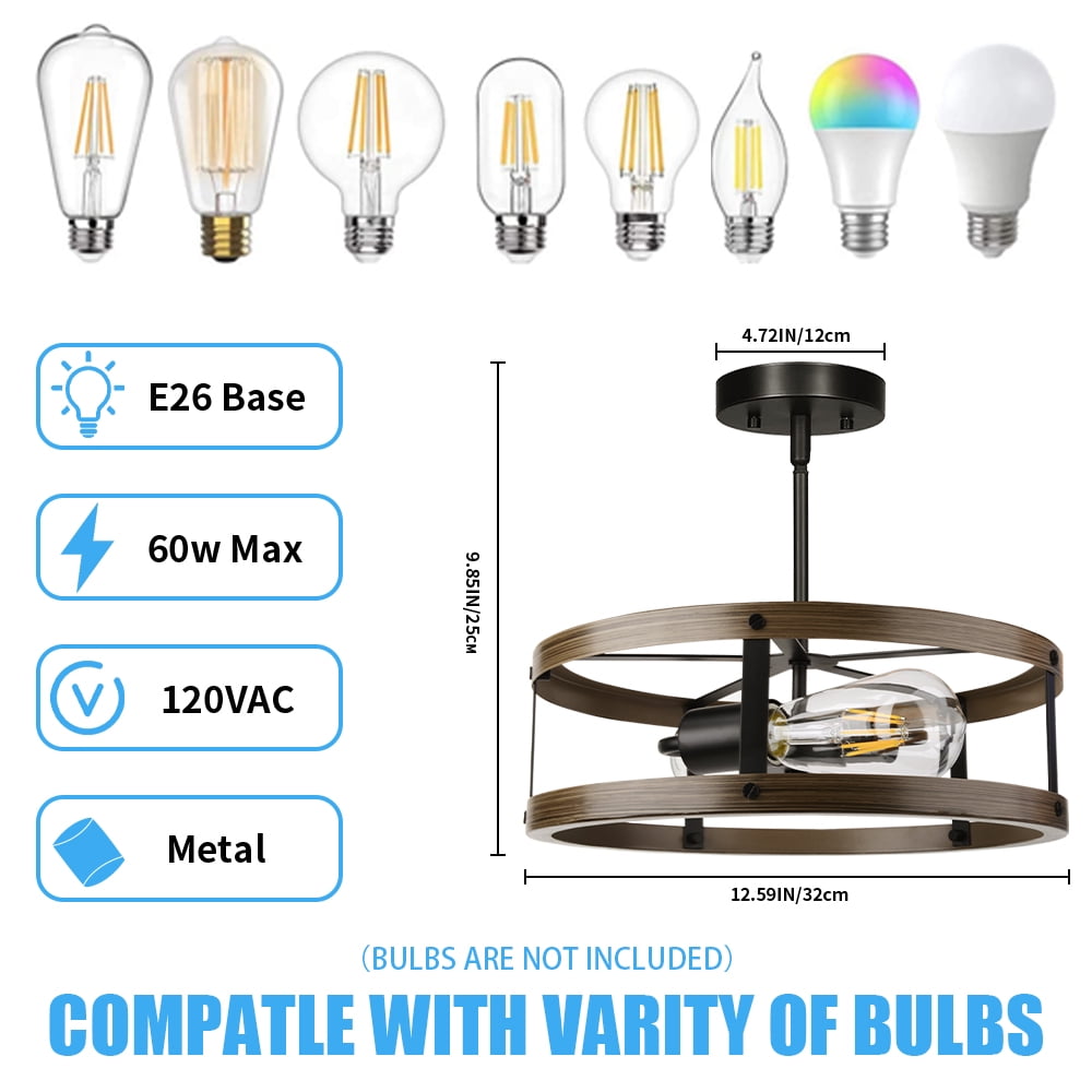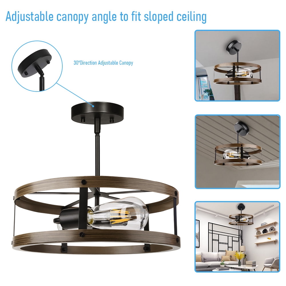 1.Vintage Farmhouse Ceiling Light: These ceiling flush mount fixtures bring industrial and vintage style with their wire cage design and exposed light bulbs. This round ceiling light fixtures feature classic black and woot grain rustic metal frame creating an attractive vintage retro industrial charm. 2.Sloped Ceiling Fitted: This semi-flush mount ceiling light fixture can adjust the angle of the canopy. It is compatible with mounting on slanted or sloped ceilings. Whether your ceiling is sloped or flat, it can fit perfectly. 3.Wide Application: The flush mount ceiling light is perfect for the Bathroom, Hallway, Entry, Porch, Kitchen Island, Closet, Kids Room, Nursery, Dining Room, Bedroom, Living Room, Hotel and Restaurant. Create a cozy and comfortable home atmosphere 4.Bulb Requirements: 2x60W (MAX) E26 bulbs, ( bulb not included ), compatible with LED, Incandescent, Compact Fluorescent, Halogen Bulb. 2 light sources bring enough light to illuminate the space. Compatible with dimmer switch if use dimmable bulbs 5.Anti-Rust & Durable Material: The This industrial drum shade kitchen chandelier is made of high-quality iron, with a strong frame and rust-proof black finish. The classic black paint finish also keeps the light fixture from rusting and remains shiny and new. The cage frame features an open-frame design and is suspended from the ceiling, which makes it easier to clean and replace the bulb.