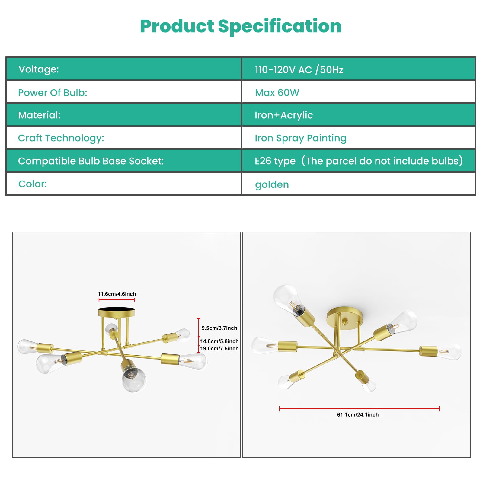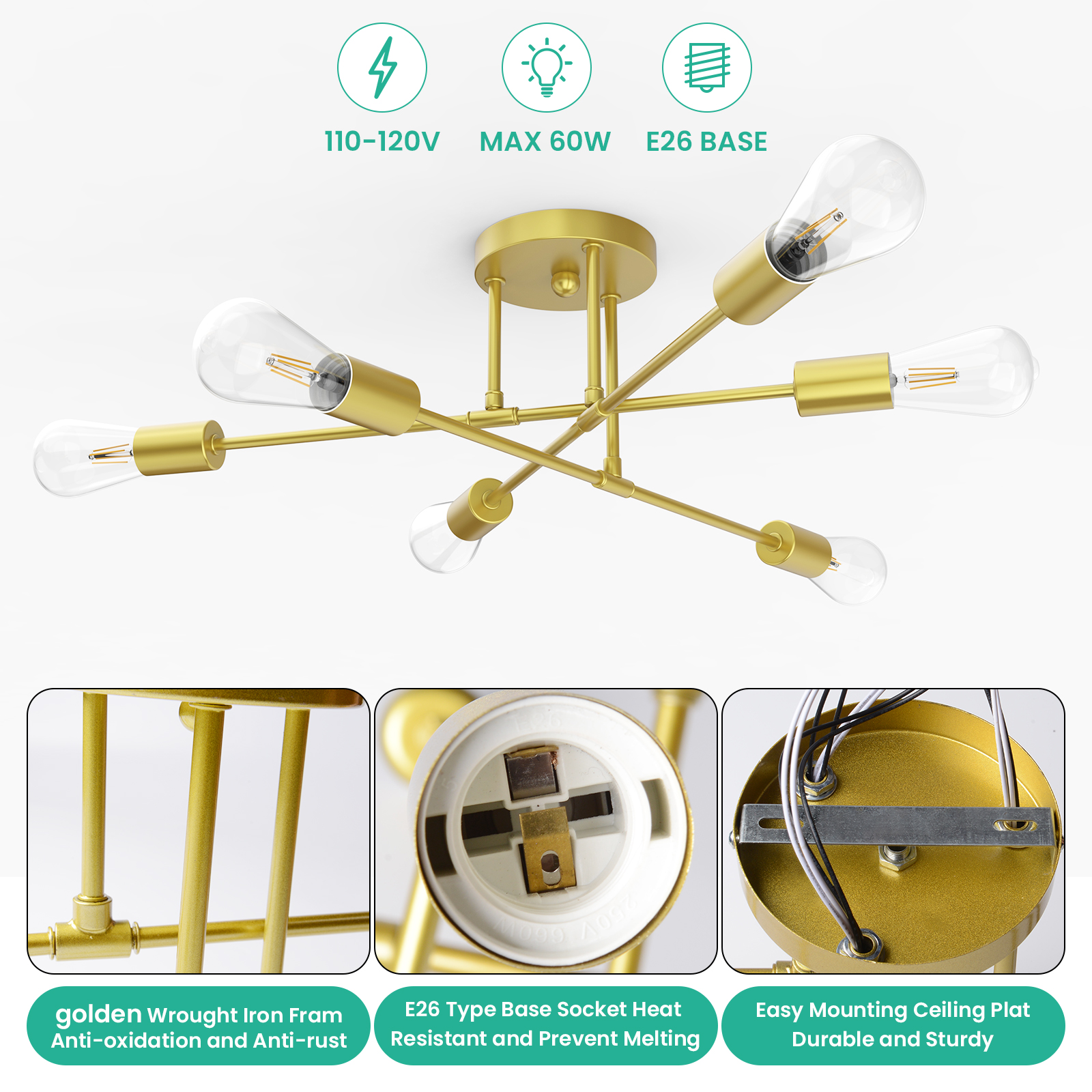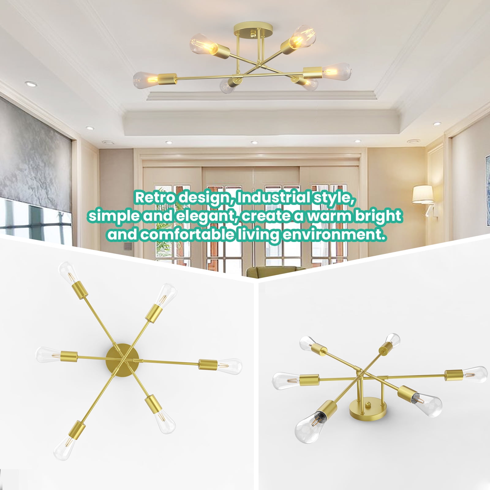Semi Flush Mount Ceiling Light: This semi flush mount light fixture with elegant and rustic look, not only a farmhouse lighting, but also a modern beautiful decoration. Indoor ceiling fixtures flush mount design creates a comfortable and modern ambiance to your rooms and works well in a variety of settings from industrial to contemporary Vintage Farmhouse Light Design: This gold finish sputnik chandelier has a modern body with an elegant, gold base and multi-directional bulbs that let the light shine through to illuminate your space. Match a variety of styles whether industrial, farmhouse, country or moderm house. And fit all spaces like bedroom, living room, bathroom, kitchen island, hallway, foyer. Added a lot of characters to your rooms Easy Installation: Just semi flush mounting. Put legs on the small plate. Connect wires with the main cable. Through the main cable to the canopy. Fix the mounting plate to ceiling. Connect the wires. Fix the canopy to plate with screws. Install 6 E26 bulbs. Refresh your home’s hallway, bathroom, vanity, powder room, bedroom, kitchen, foyer or living room, this fixture will help you distinguish your style Bulb Requirement: The farmhouse light fixtures feature E26 based socket which is compatible with a variety of bulb types: LED, INCANDESCENT, CFL.For energy efficiency, LED Edison style bulb is recommended. The industrial light fixtures are dimmable when the bulbs with compatible dimmer switch. ( Bulbs and dimmer are not included ) Reliable Customer Service: This close to ceiling light is hardwired installation, coming with unassembled parts, you should put them together, but easy to assemble. If you meet any problems when installing this light fixture, please feel free to contact us. We can provide professional guidance