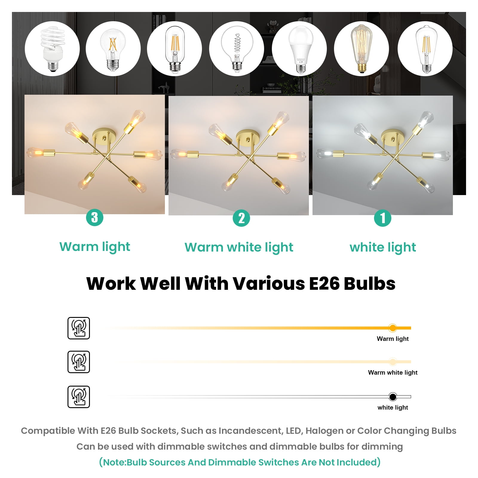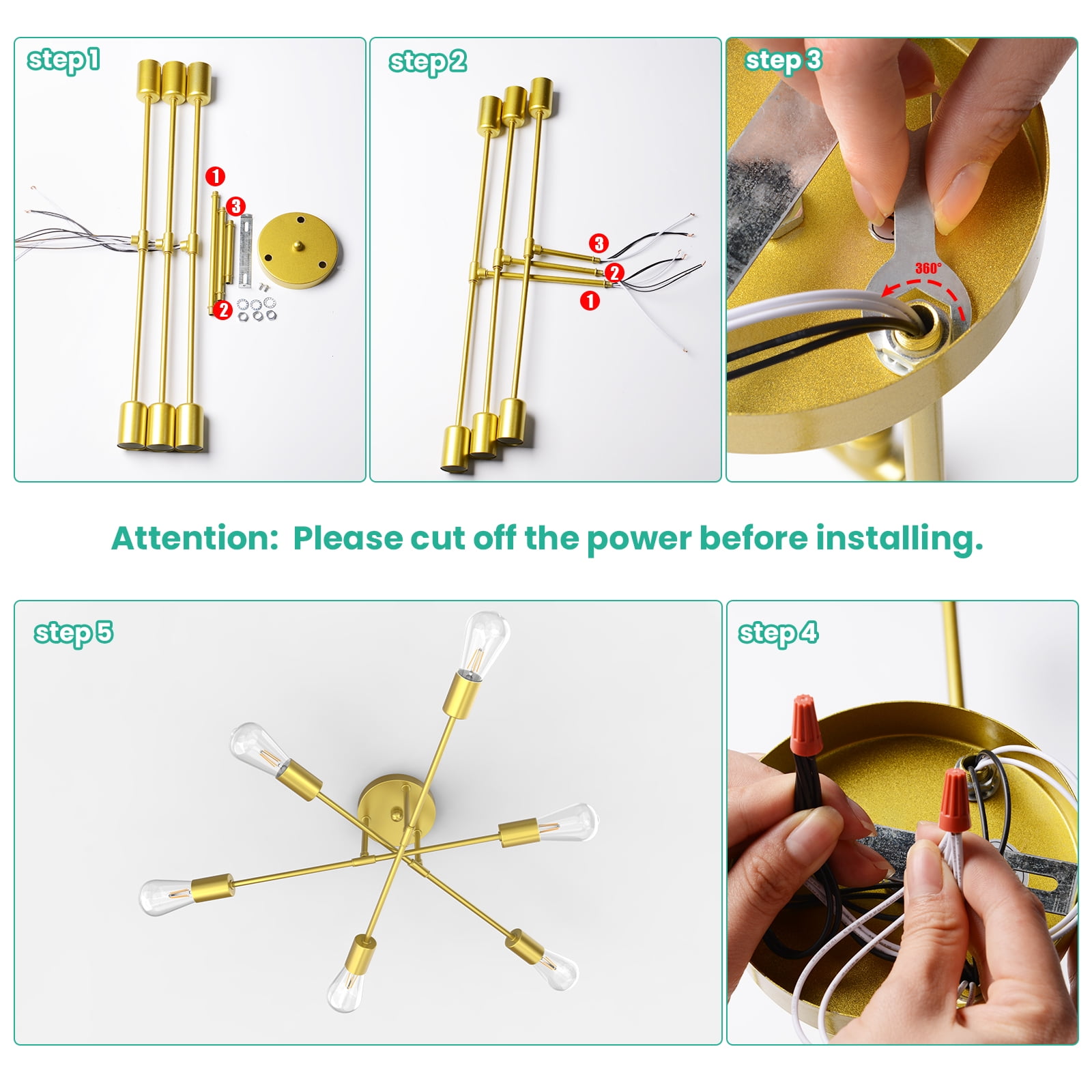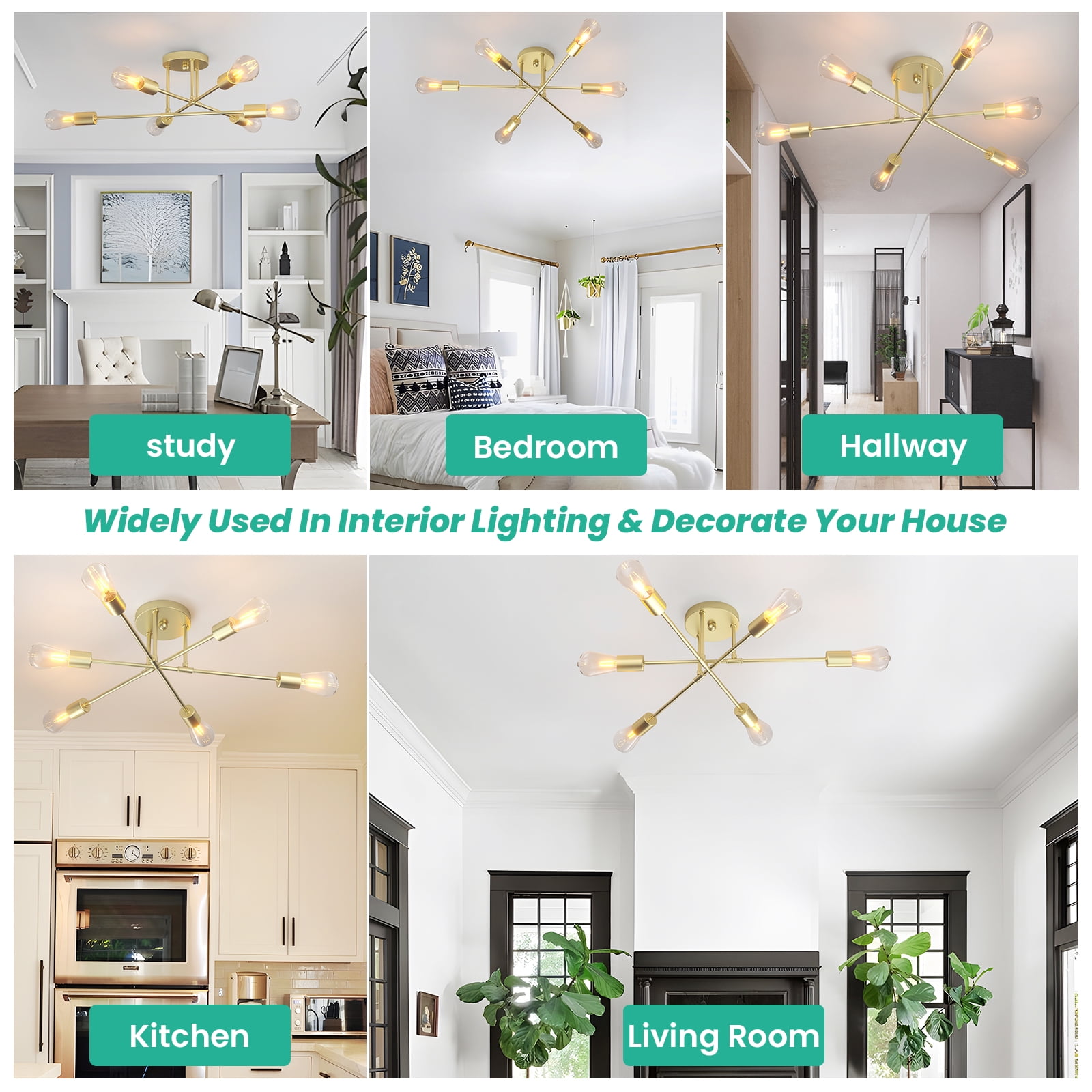 Semi Flush Mount Ceiling Light: This semi flush mount light fixture with elegant and rustic look, not only a farmhouse lighting, but also a modern beautiful decoration. Indoor ceiling fixtures flush mount design creates a comfortable and modern ambiance to your rooms and works well in a variety of settings from industrial to contemporary Vintage Farmhouse Light Design: This gold finish sputnik chandelier has a modern body with an elegant, gold base and multi-directional bulbs that let the light shine through to illuminate your space. Match a variety of styles whether industrial, farmhouse, country or moderm house. And fit all spaces like bedroom, living room, bathroom, kitchen island, hallway, foyer. Added a lot of characters to your rooms Easy Installation: Just semi flush mounting. Put legs on the small plate. Connect wires with the main cable. Through the main cable to the canopy. Fix the mounting plate to ceiling. Connect the wires. Fix the canopy to plate with screws. Install 6 E26 bulbs. Refresh your home’s hallway, bathroom, vanity, powder room, bedroom, kitchen, foyer or living room, this fixture will help you distinguish your style Bulb Requirement: The farmhouse light fixtures feature E26 based socket which is compatible with a variety of bulb types: LED, INCANDESCENT, CFL.For energy efficiency, LED Edison style bulb is recommended. The industrial light fixtures are dimmable when the bulbs with compatible dimmer switch. ( Bulbs and dimmer are not included ) Reliable Customer Service: This close to ceiling light is hardwired installation, coming with unassembled parts, you should put them together, but easy to assemble. If you meet any problems when installing this light fixture, please feel free to contact us. We can provide professional guidance