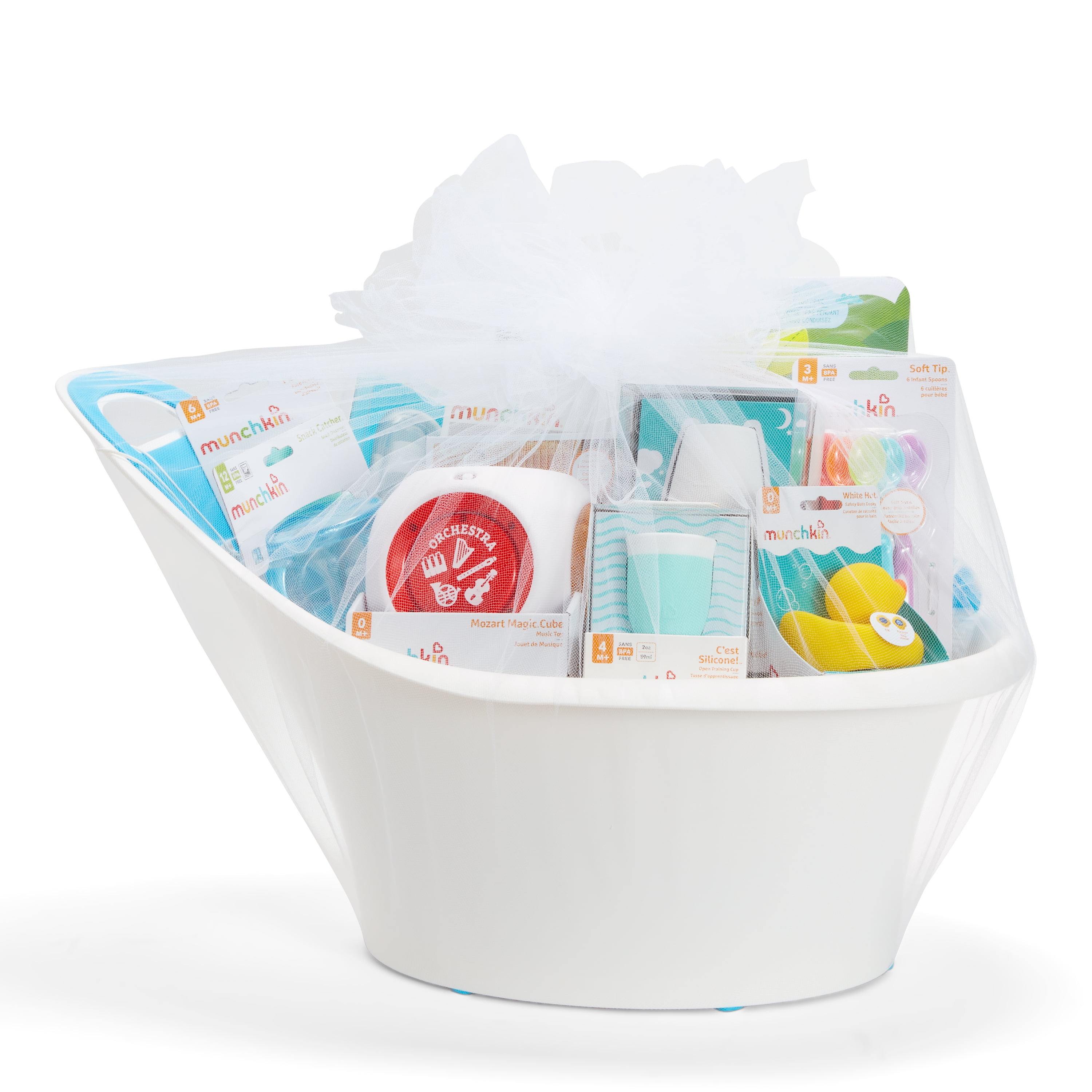 Think outside the baby shower registry and stock up their nursery all at once with the My Munchkin Gift Basket! We’ve filled our small but mighty Sit & Soak™ bathtub with 15 of our bestselling baby products to make the entry into parenthood – and the prospect of baby gift shopping – less intimidating and more fun. Whether you’re shopping for a baby shower, baby sprinkle or welcome baby party, the My Munchkin gift basket has newborn and toddler essentials they didn’t know they needed – until now. A great way to introduce families to the Munchkin brand, this gift basket includes tried and true products for the infant stage and beyond. From nursery must-haves like our nasal aspirator, sleep sound machine, and Fresh Feeder to our Miracle® trainer cup, infant spoons, bottle brush and drying rack, the list is practically endless – and endlessly practical! There’s also an award-winning musical toy, a rubber ducky that senses when water’s too hot for baby’s sensitive skin, and more. Our favorite part? It’s all adorably housed in our Sit & Soak™ transition tub, which holds baby comfortably upright in a safe seated position — and makes a splash as one truly thoughtful gift. The My Munchkin Gift Basket comes with the following baby products: Bath: White Hot® Ducky, Sit & Soak™ Dual-Stage Tub Bottles: Fold™ Bottle Drying Rack, Bristle™ Bottle Brush Feeding: Soft Tip Infant Spoons (6 Pack), Stay Put™ Suction Bowls (3 Pack), Snack Catcher®, Fresh Food Feeder, C’est Silicone!™ Open Training Cup, Miracle® 360° Trainer Cup – 7oz Health: ClearNose™ Nasal Aspirator, The Medicator™ Nursery: Shhh…™ Portable Sound Machine Toys: Mozart Magic® Cube Safety: Brica® Swing!™ Baby In-Sight® Car Mirror