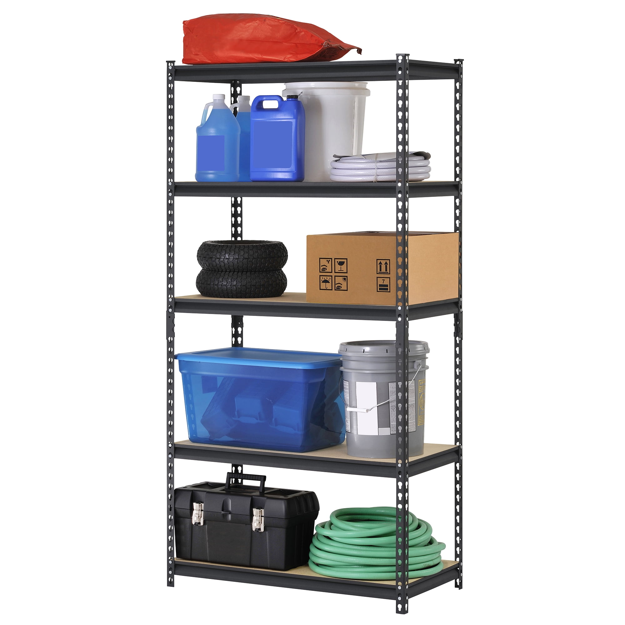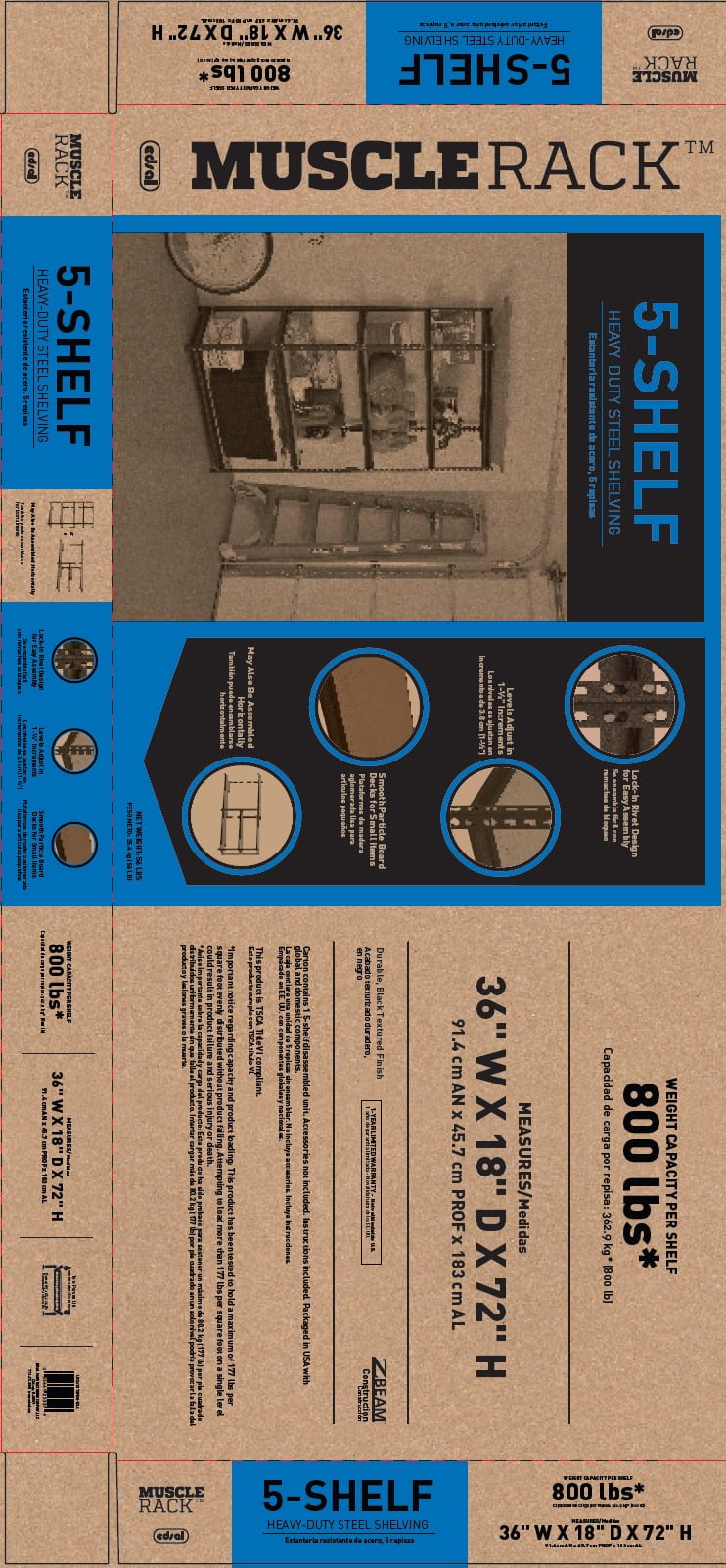 5 adjustable particle board shelves Shelves adjust in 1 1/2″ increments Easy rivet-lock assembly; no nuts or bolts Assembles vertically or horizontally Black powder-coat finish for durability Particleboard shelves provide sturdy and solid storage space Assembles in just minutes with no nuts or bolts Specification Shelves: 5 Capacity Per Shelf: 800 lbs. (evenly distributed) Finish: Black Powder-Coat Finish Dimensions: 36″ W x 18″ D x 72″ H