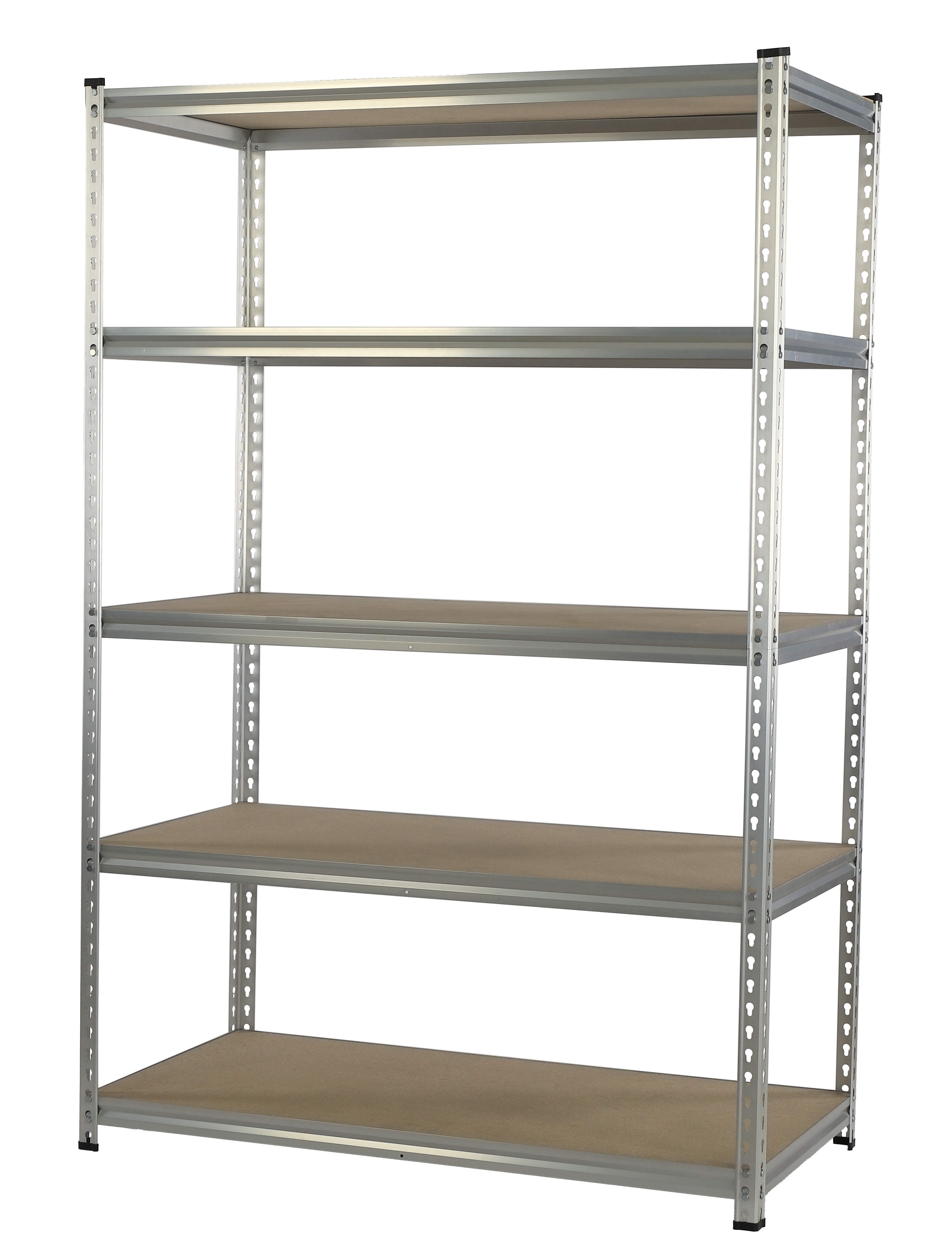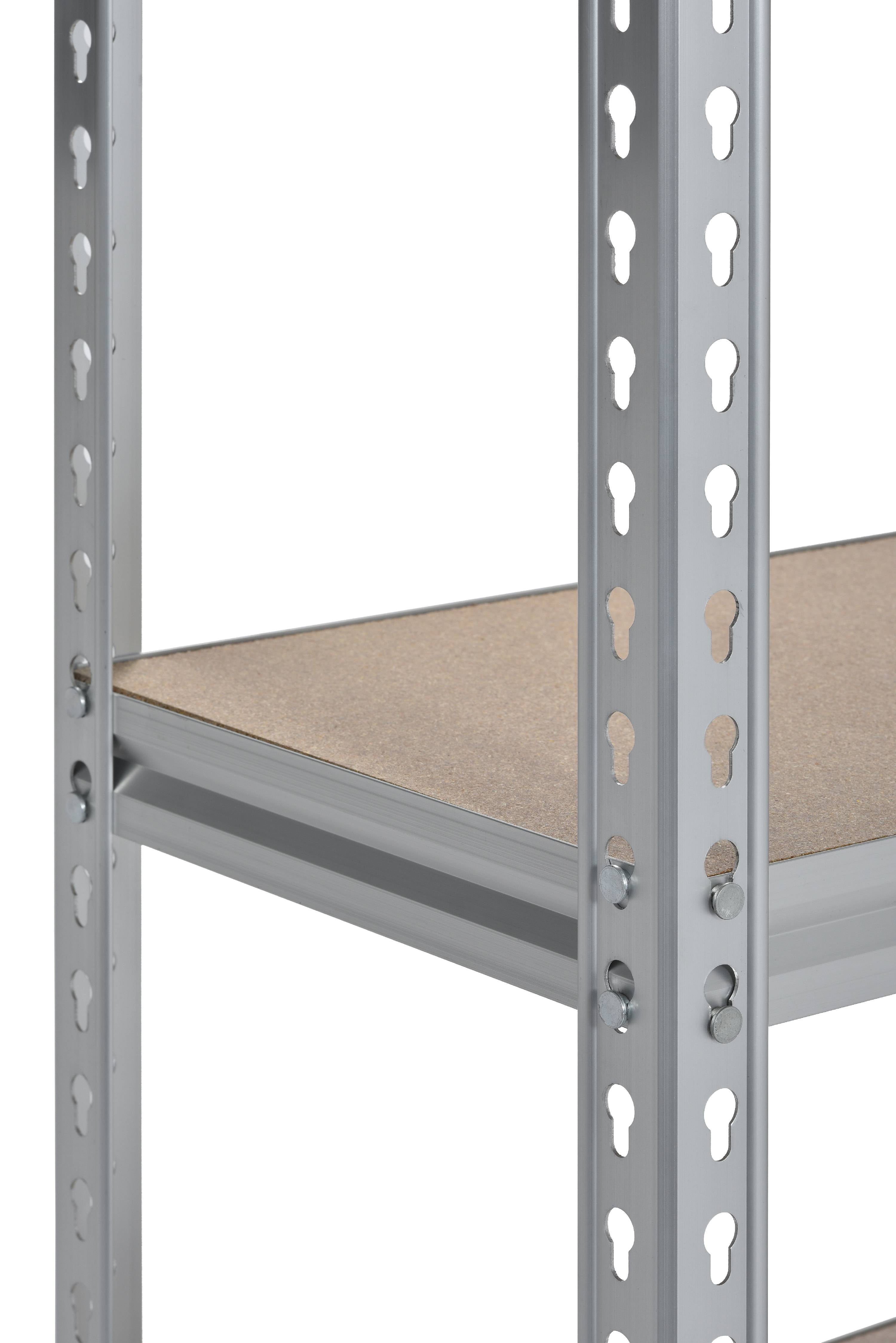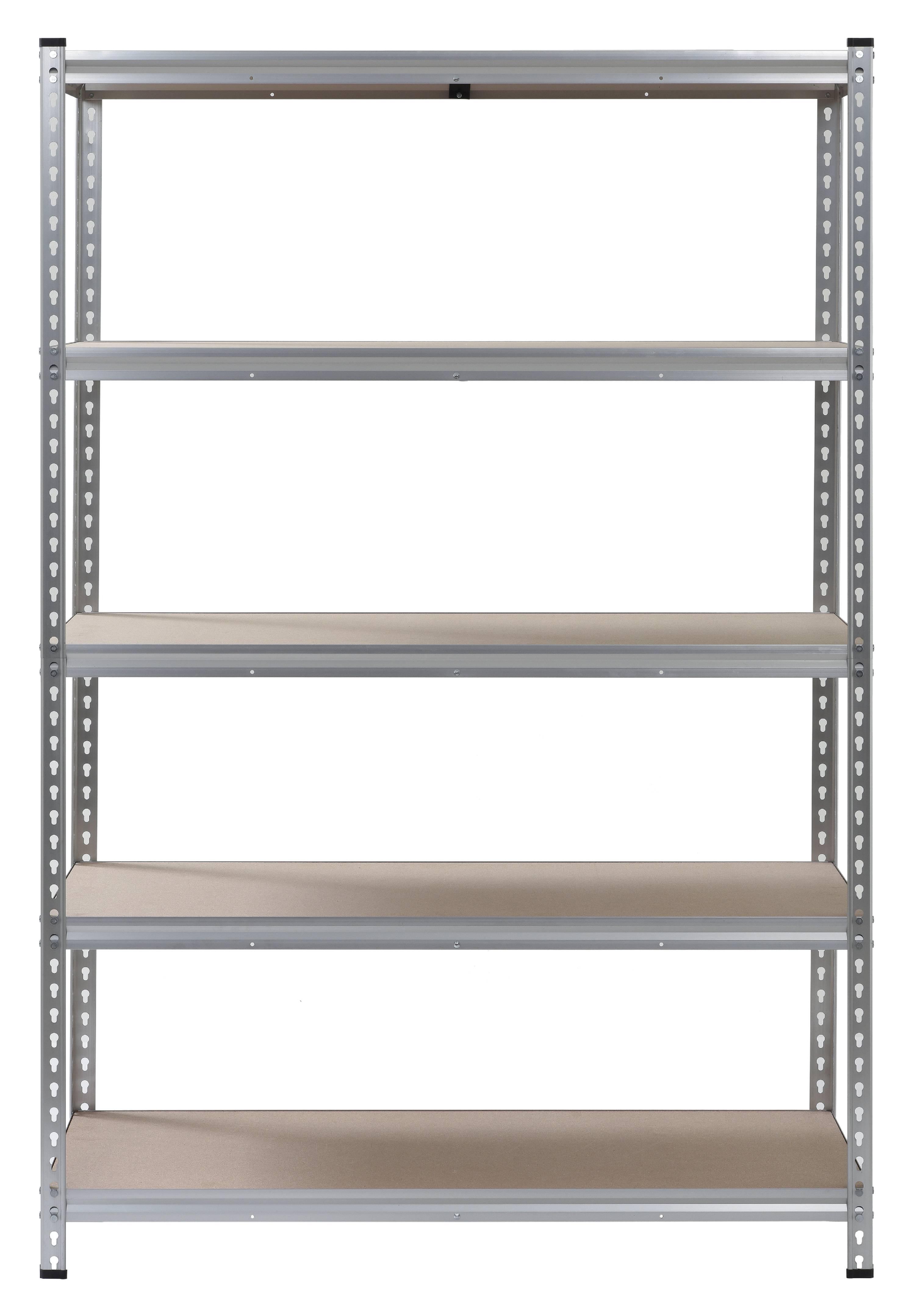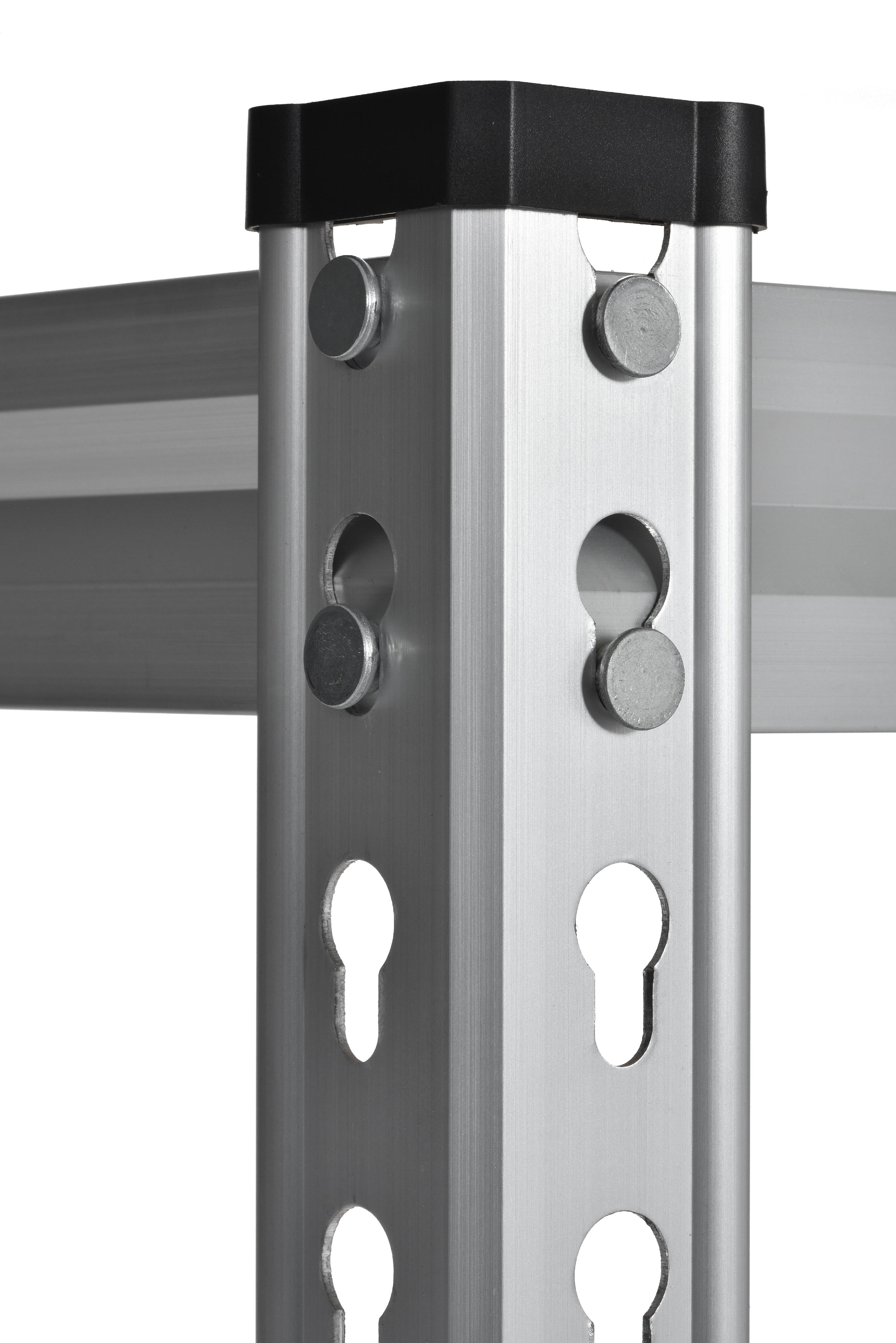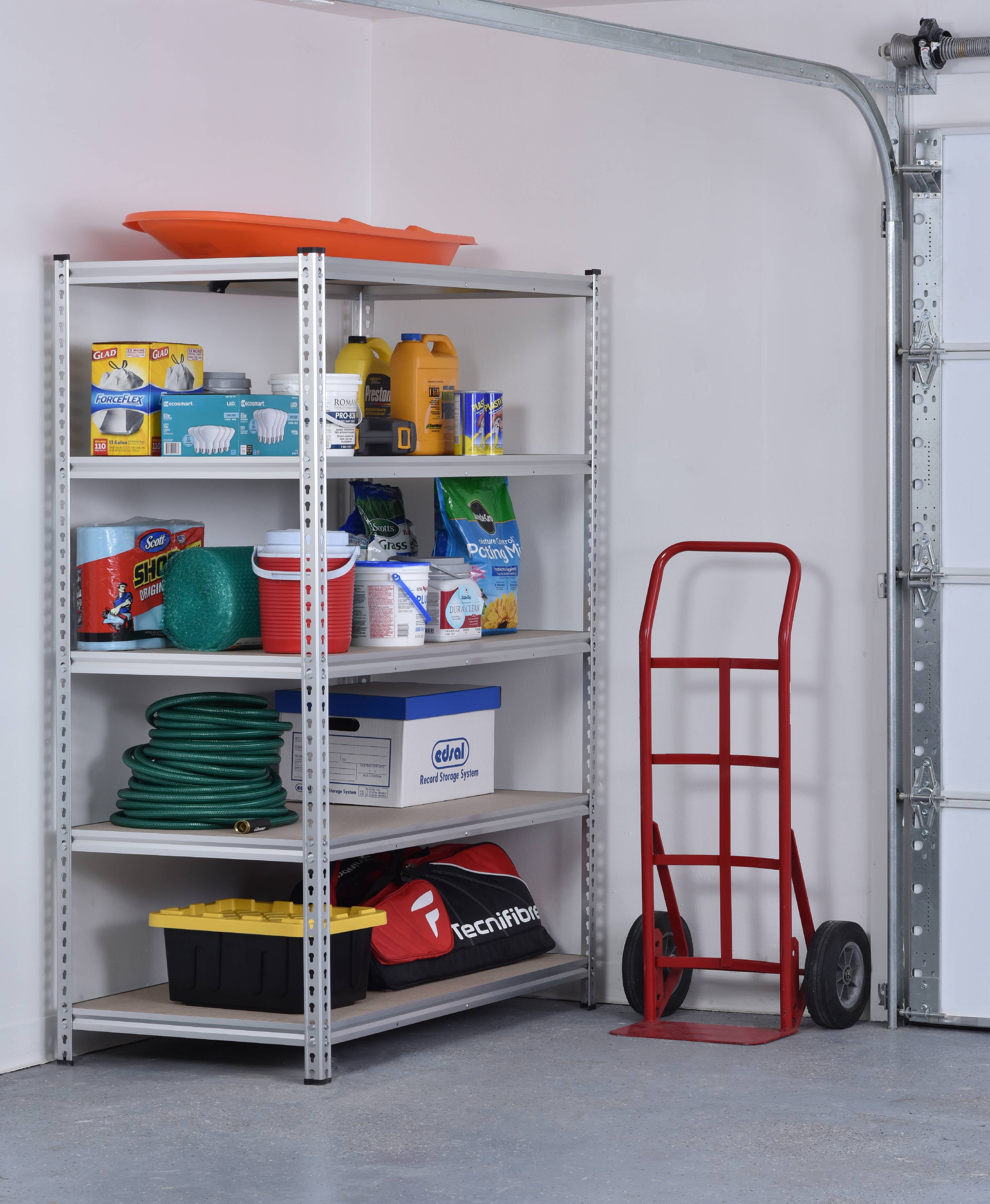 5-shelf rivet-lock storage rack for your garage, basement, workshop, or workplace. Exceptionally durable anodized aluminum finish. Crossbar supports reinforce the particleboard shelving. Each shelf supports up to 370 lb. of evenly distributed weight. Shelves adjust in 1.5″ increments. Anti-tipping hardware included. Includes 8 post caps. Tools required for assembly (not included)