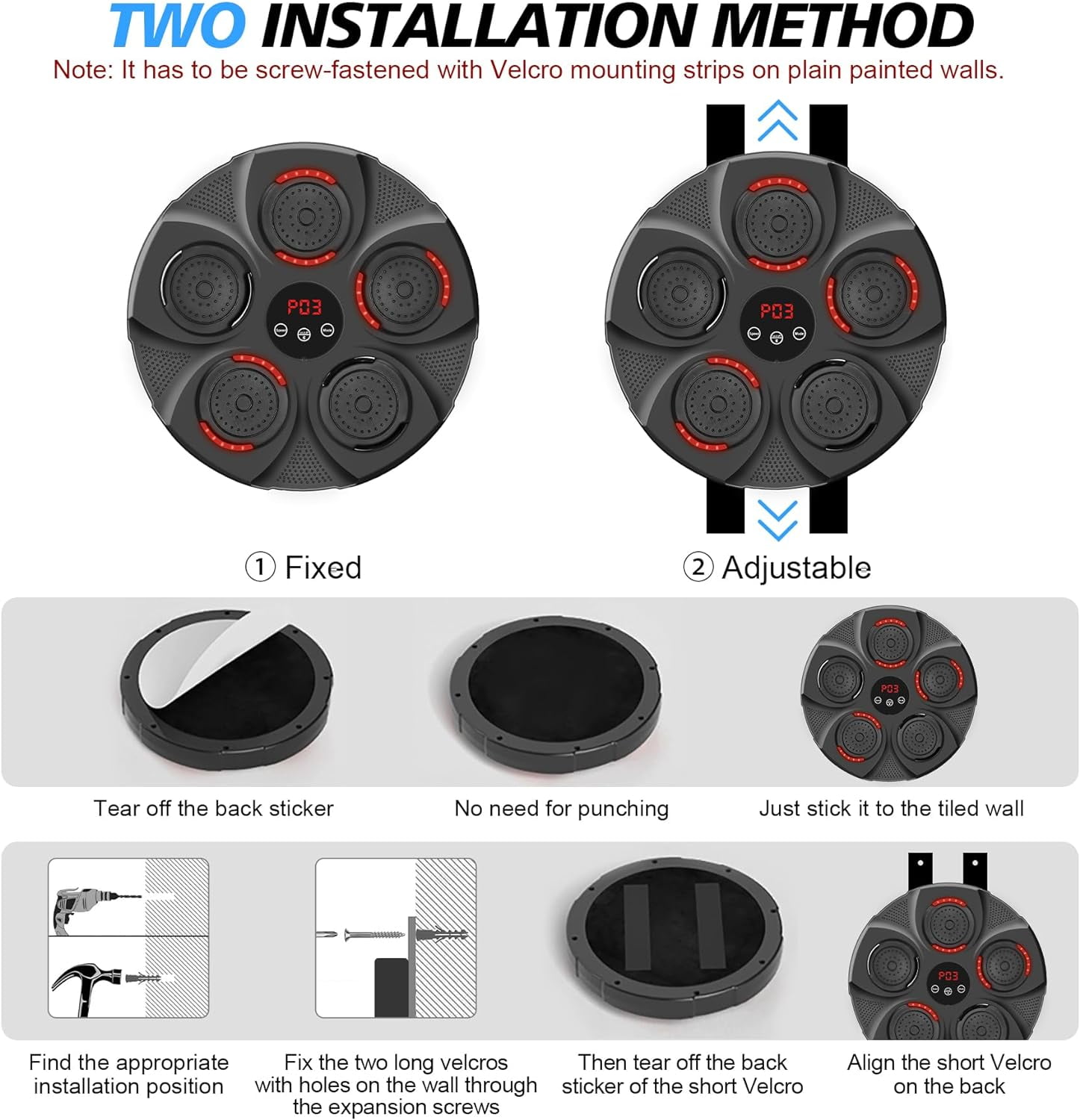 【Realistic Boxing Experience】Customize your workout intensity with 9 punching modes and 9 strike speeds. Suitable for beginners and experienced professionals, this machine provides instant feedback through its realistic target pad, improving accuracy and speed. 【Comprehensive Exercise Options】The smart music boxing machine enhances endurance, agility, coordination, and overall fitness. Enjoy a full-body workout targeting different muscle groups without the need for a sparring partner. It is an essential tool for weight loss, fitness, and sculpting, and also offers family entertainment during holidays. 【Integrated Interactive Music】Connect the machine to the app via smart Bluetooth and enjoy your favorite music by its built-in speaker. Practice boxing while following the rhythm, increasing flexibility, coordination, and reaction time. Relieve stress and make your workout dynamic and energizing. 【Premium & Durable】This boxing equipment is made with featuring advanced pressure sensors, EVA cushioning pads, sturdy PC panels, and ABS alloy materials. Withstand weights up to 880 pounds. Unlike traditional fitness equipment, our music boxing machine blended sports with leisure, creating a harmonious fusion that led to the discovery of new and exhilarating experiences. 【Space-saving and Easy Installation】The boxing wall target is compact, durable, and can be easily installed on the wall using screws and adhesive tapes. Exercise anywhere, anytime. It is adjustable and suitable for wall types such as wood, brick, ceramic tiles. With this innovative home fitness solution, you can complete a week’s worth of fat-burning exercises in the comfort of your own space.