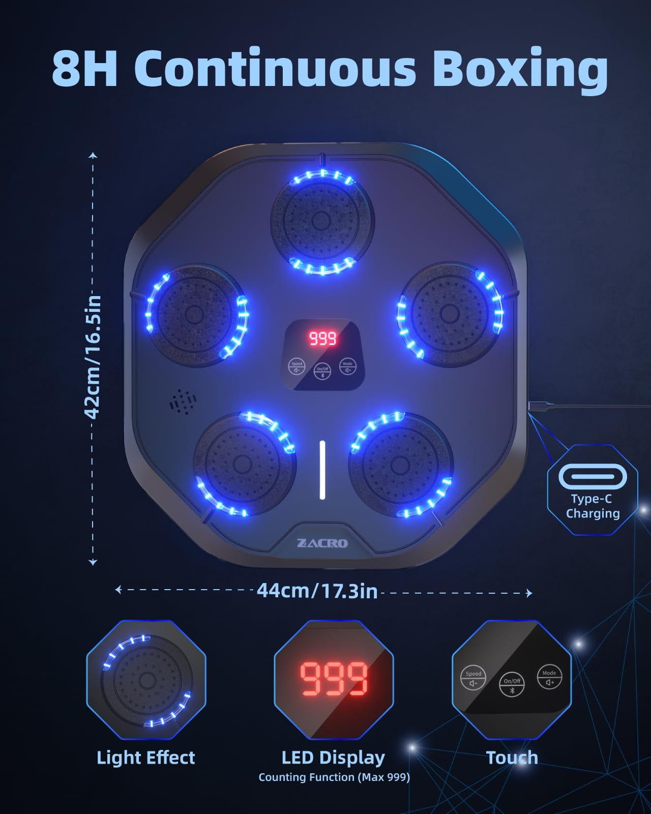 Specification: Item Type: Music Boxing Machine Recommended Age: 8 years and above Material: PVC Color: Black Size: 43.94 x 41.91 x 13.72 cm/17.3 x 16.5 x 5.4 inches Battery: built-in 2000mAh rechargeable lithium battery INTERACTIVE FITNESS FUN: Our boxing machine wall mounted music can be connected to a personalised playlist via Bluetooth to enjoy a music-filled boxing workout. Surround sound and dynamic lighting create an immersive training experience, and every boxing move is accompanied by a subtle and beautiful musical rhythm that releases stress and motivates you to box your way to fitness. VERSATILE TRAINING MODES: With 9 training modes and speeds to suit all fitness levels, this musical boxing machine helps you create a professional workout in the comfort of your own home.LED indicators and digital counters track your training progress and improve your reaction speed and coordination with every punch. It is the perfect professional training and daily workout tool for adults, as professional boxers, fitness professionals, dieters, kids, teens, office workers and more. NEW PERSONALIZED EXPERIENCE: This electronic boxing machine reacts to your punching blows, providing a realistic experience. Customisable sound adjustments and memory functions to keep your workout focused. The included gloves and headband enhance comfort and safety, allowing you to focus on your training without distractions and have more fun than ever before. STURDY & SAFE DESIGN: The intelligent wall mounted music punching machine features an advanced pressure sensor for high speed response. The punch target is made of high-density foam for optimal flexibility and shock absorption, ensuring hands are protected during intense exercise. The sleek exterior not only adds style, but also simplifies cleaning after use. Our wall boxing machine combines sports and leisure perfectly, allowing you to discover new exciting experiences. SPACE SAVING & EASY TO INSTALL: Our onepunch boxing machine wall mounted machine can be easily installed with double sided tape or hook and loop to save space and time, suitable for all kinds of wall surfaces such as wood, brickwork, tiles and so on. Allow you to have a gym level workout at home, say goodbye to expensive gym memberships and say hello to a convenient and effective fitness solution. Package List: 1* Intelligent music boxing machine 1* Pair Boxing gloves 1* Headband 2* Vel-cro 4* Hook & Loop Straps 1* Type-C USB cable