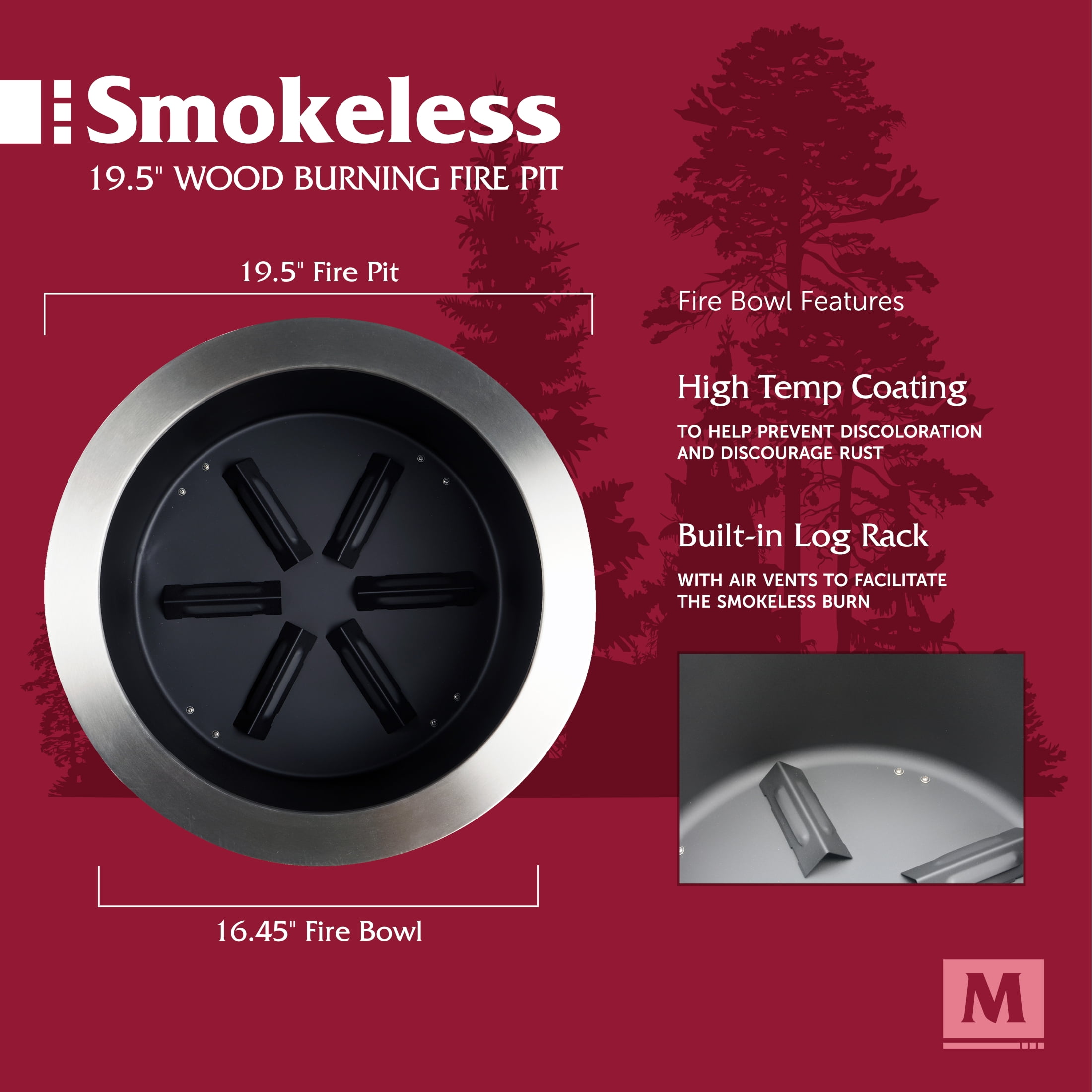 Produces 70% less smoke than traditional wood burning fire pits Made from durable and corrosion resistant stainless steel Black high temperature paint coated burn bowl to prevent rust and discoloration Easy to assemble in less than 5 minutes Portable, raised design for use on a fire-safe surface Includes 400D PVC cover to protect from dirt and scratches