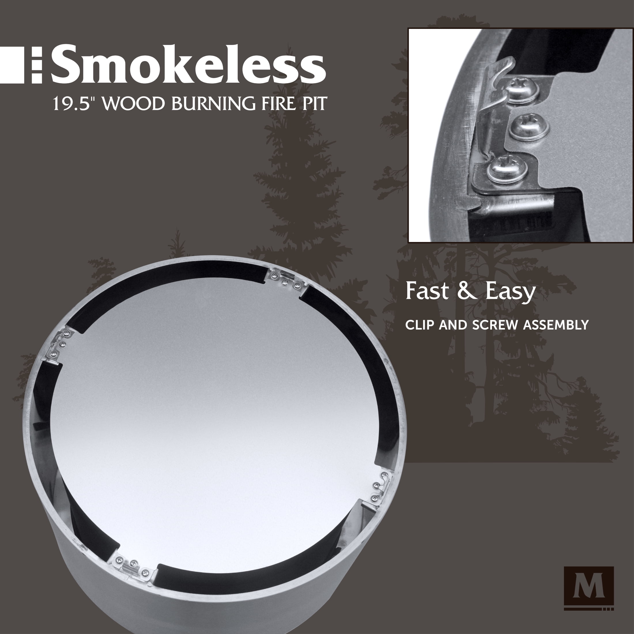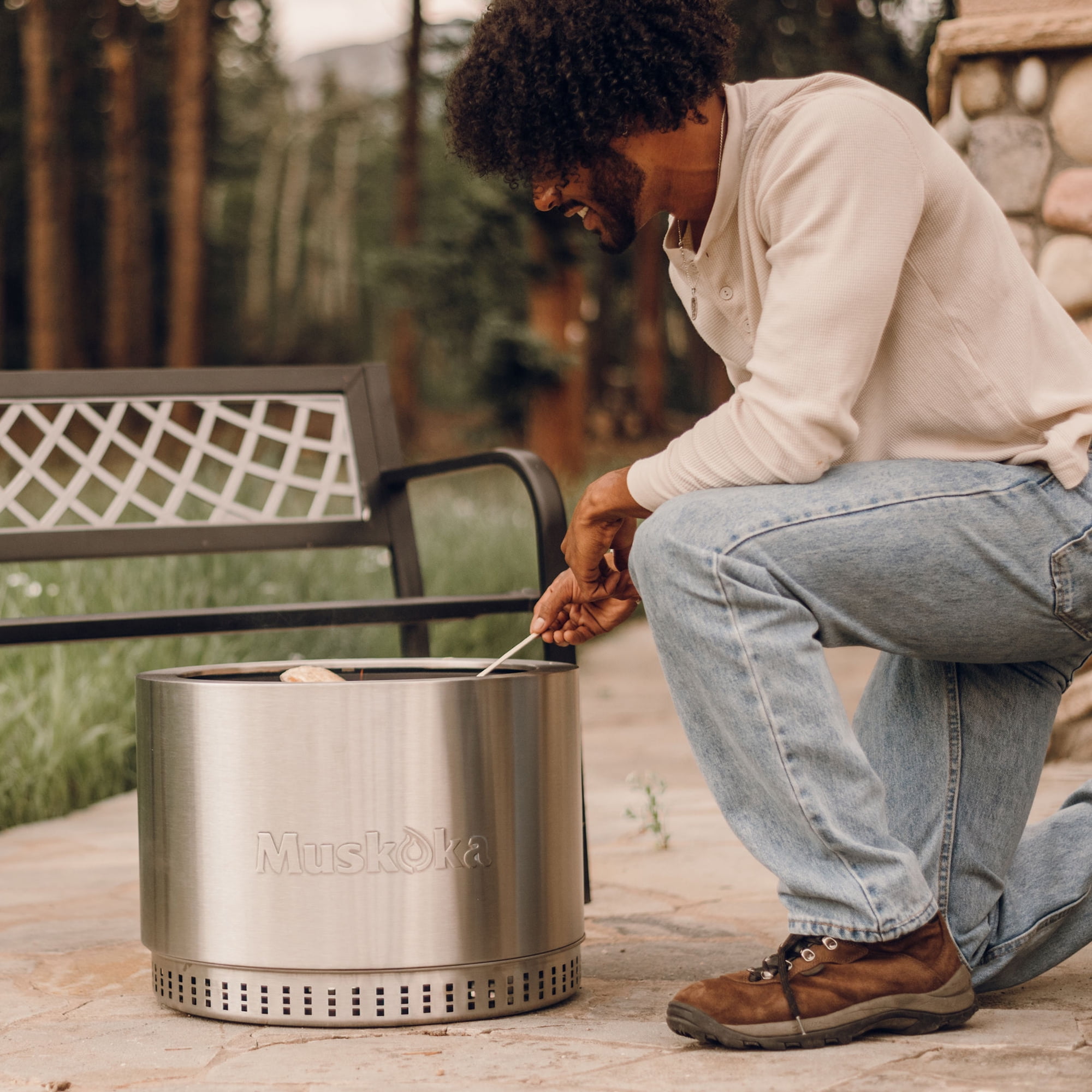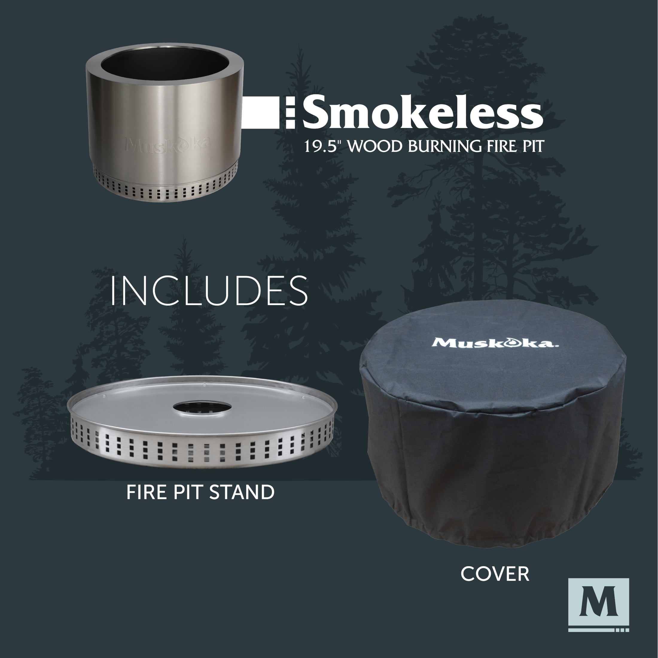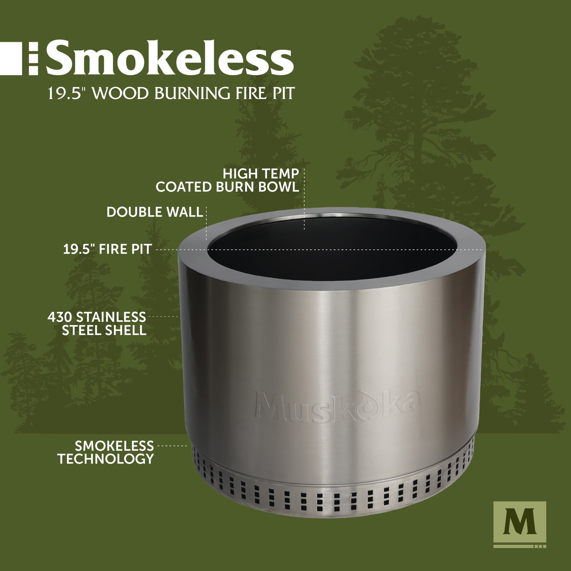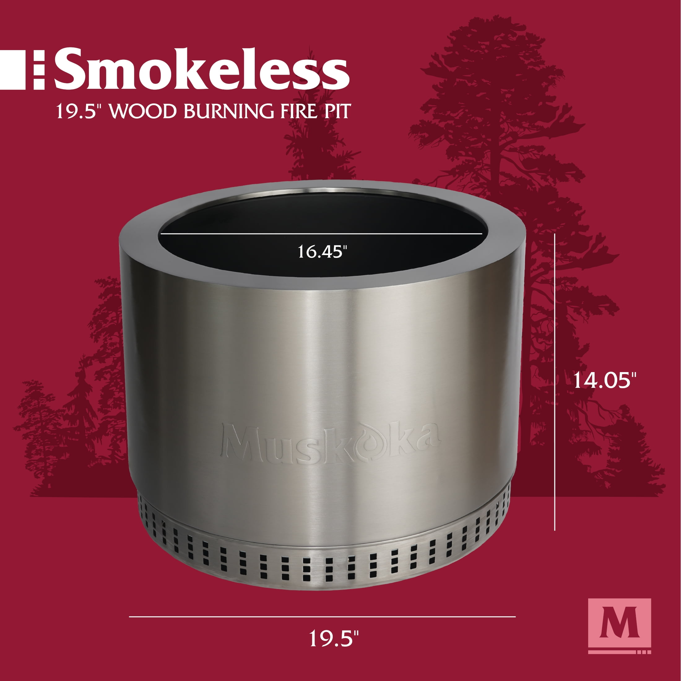The smokeless, stainless steel Muskoka 19.5″ Wood-Burning Fire Pit with Cover brings the essence of ‘Cottage Country’ to your outdoor adventure. With its easy-to-assemble, 18.9 lb. portable design, you can gather around it with loved ones in the backyard or on the lake in less than 5 minutes. The fire pit also comes with a protective PVC cover to keep debris out of the unit and preserve its appearance. Enjoy a nearly smoke free experience with CleanAir Smokeless Technology, which reduces up to 70% of the smoke generated (compared to traditional style wood burning fire pits) when the wood level is below the top edge. This advanced outdoor fire pit design uses intake vents in the double-insulated walls and base to super-heat the air. That heated air is then circulated back into the fire bowl, feeding the flames again to create a fire that burns hotter. This air circulation process burns off would-be smoke particulates come from the fire, and feeds more oxygen to your firepit for a more efficient burn. Take advantage of the easy clean up, with very little ash left behind after each use.