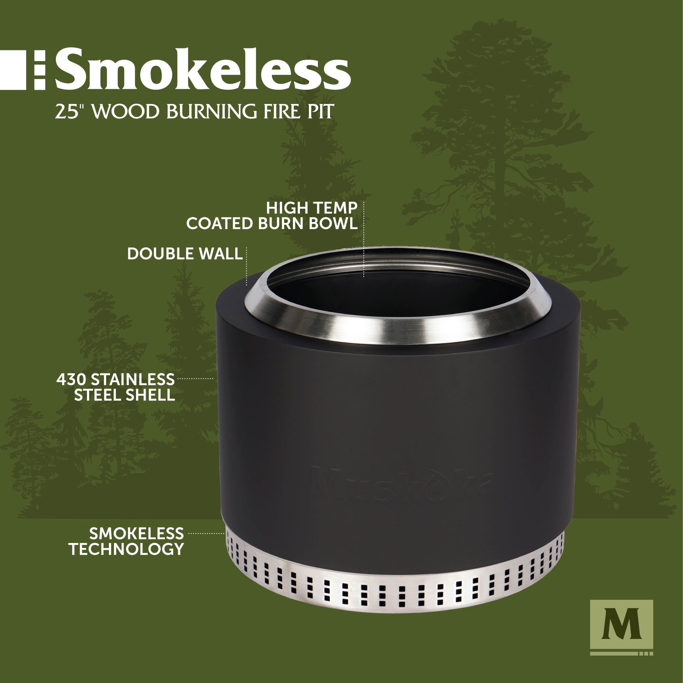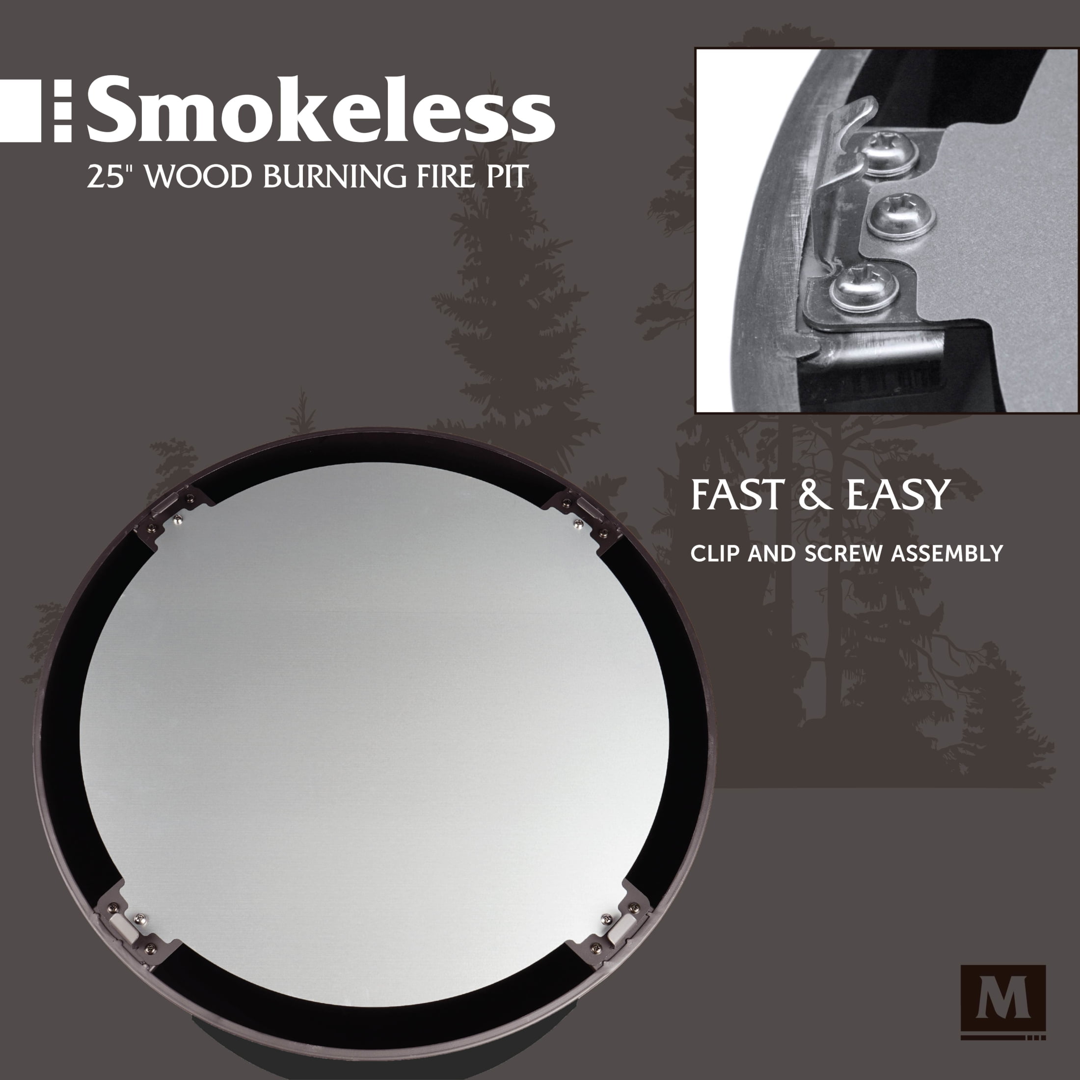 Produces 70% less smoke than traditional wood burning fire pits Top rim and base made from durable and corrosion resistant stainless steel Black high temperature paint coated burn bowl interior and exterior prevents rust and discoloration Easy to assemble in less than 5 minutes Raised design for use on a fire-safe surface Black powder coated steel lid provides a flat surface and keeps debris out of the unit Includes steel poker and 400D PE coated protective cover 25″ Diam x 18.4″ H, 40 lbs