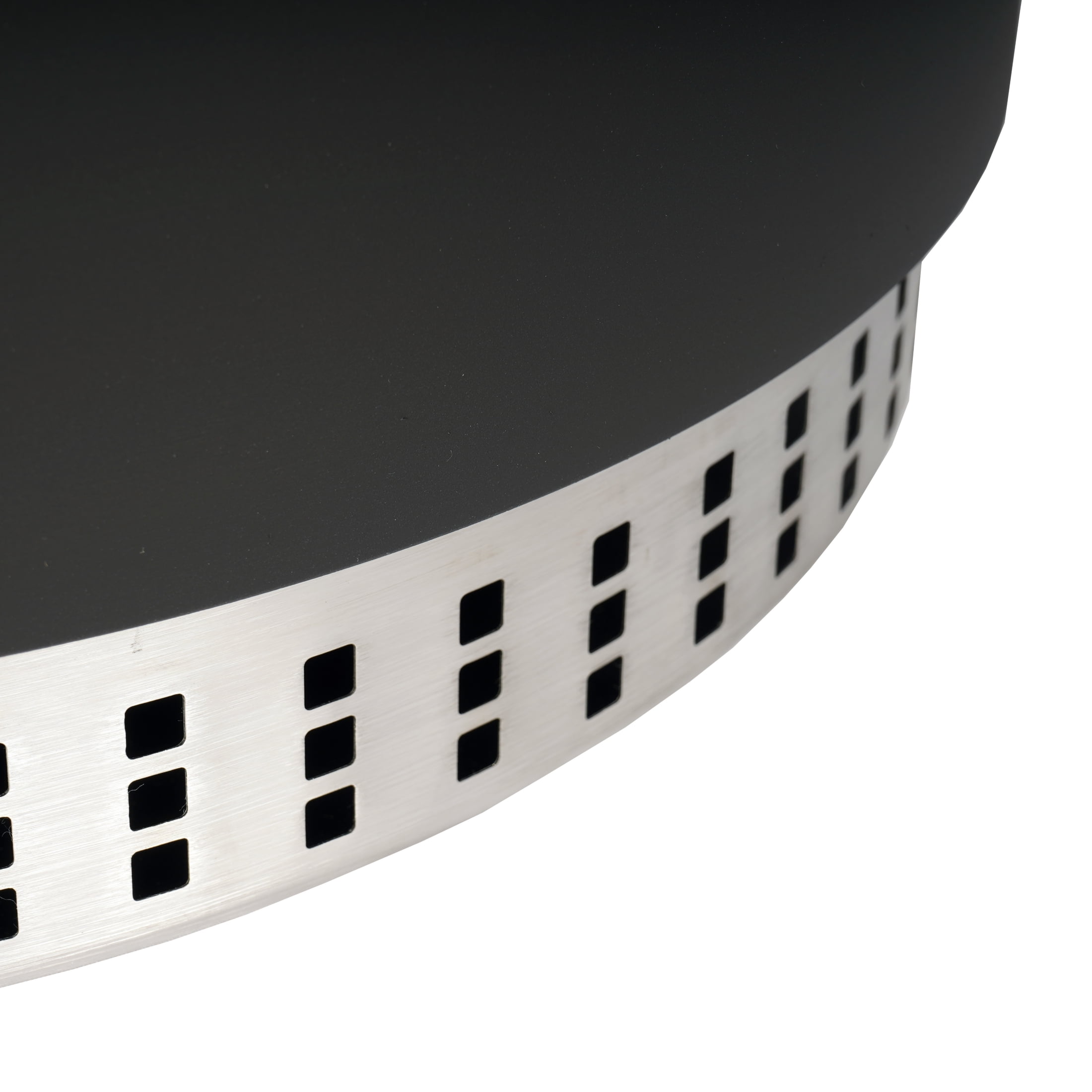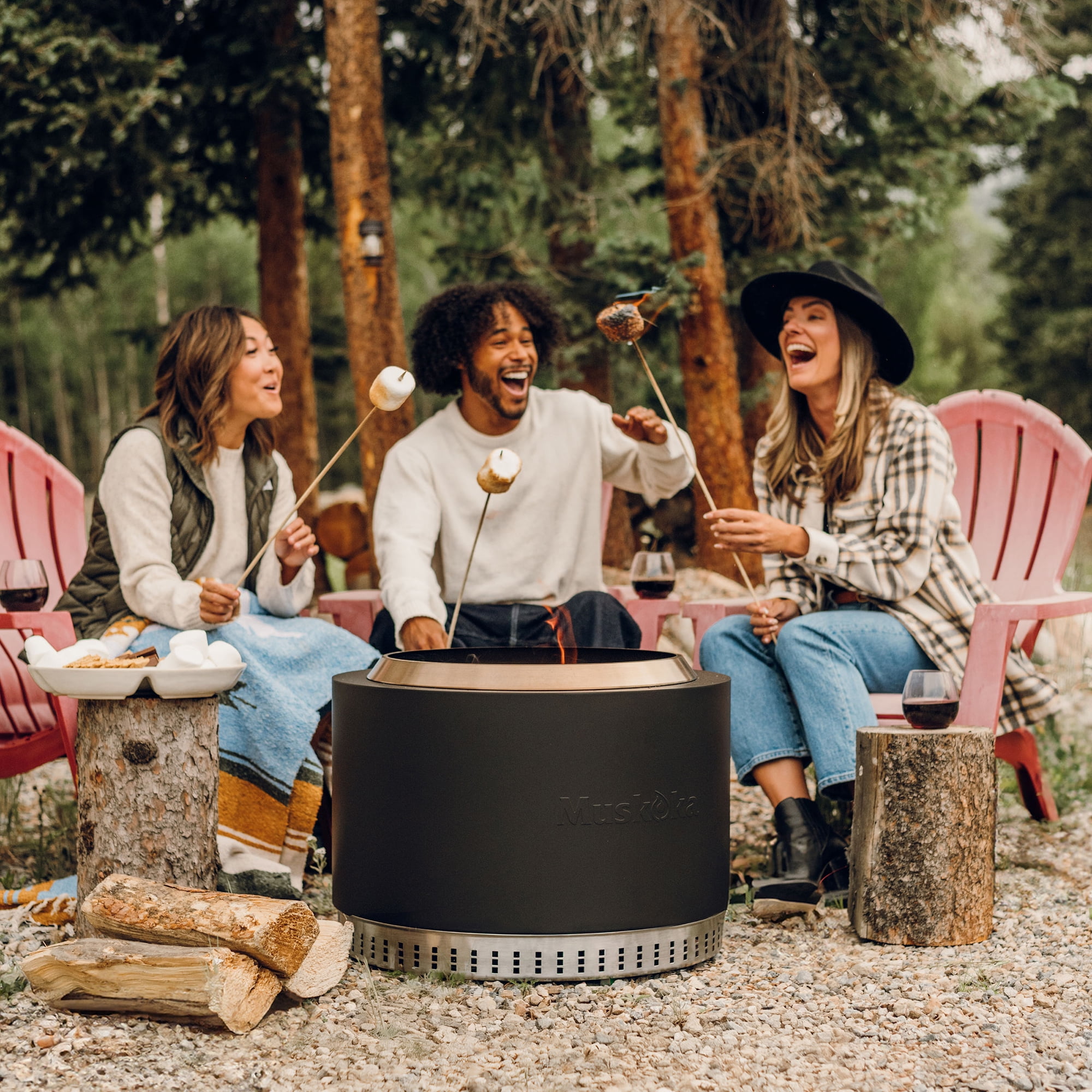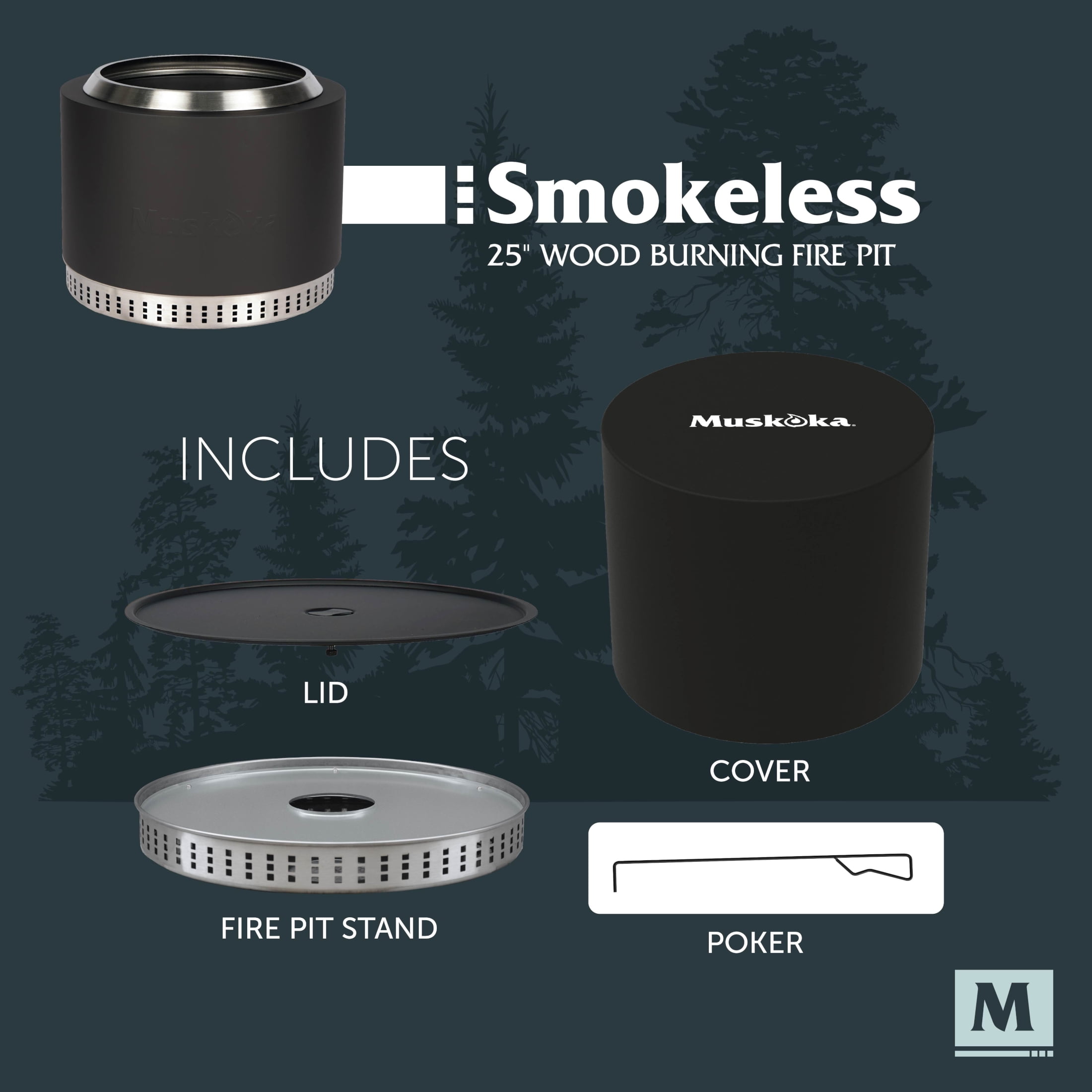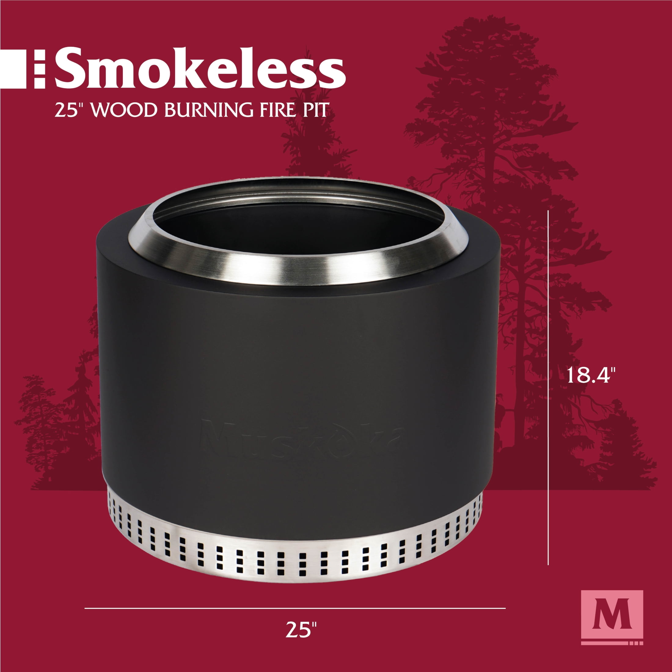 The smokeless, Muskoka 25″ Black Steel/Stainless Steel Wood-Burning Fire Pit brings the essence of ‘Cottage Country’ to your outdoor adventure. With its easy-to-assemble, 40 lb. durable design, you can gather around it with loved ones in the backyard or patio in less than 5 minutes. The fire pit comes with a PE coated fabric cover to protect the unit from the elements and preserve its appearance. The included steel lid also keeps debris out of the unit and creates a flat useable surface. Enjoy a nearly smoke free experience with CleanAir Smokeless Technology, which reduces up to 70% of the smoke generated (compared to traditional style wood burning fire pits) when the wood level is below the top edge. This advanced outdoor fire pit design uses intake vents in the double-insulated walls and base to super-heat the air. That heated air is then circulated back into the fire bowl, feeding the flames again to create a fire that burns hotter. This air circulation process burns off would-be smoke particulates come from the fire, and feeds more oxygen to your firepit for a more efficient burn. Take advantage of the easy clean up, with very little ash left behind after each use.