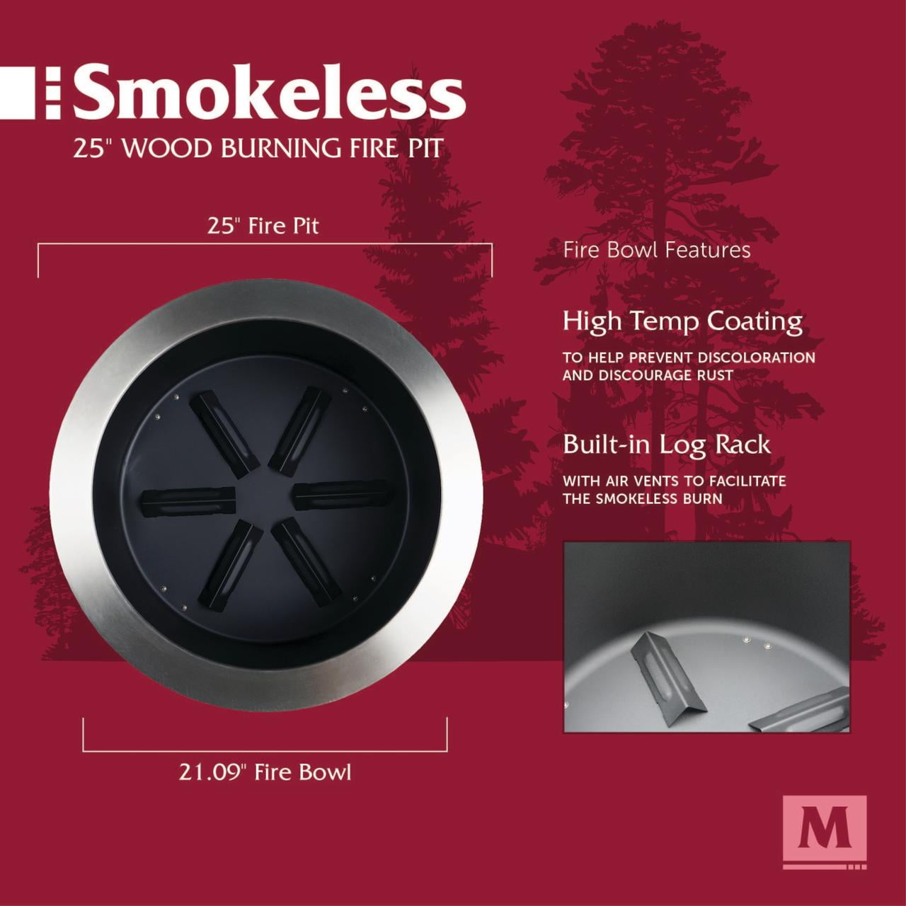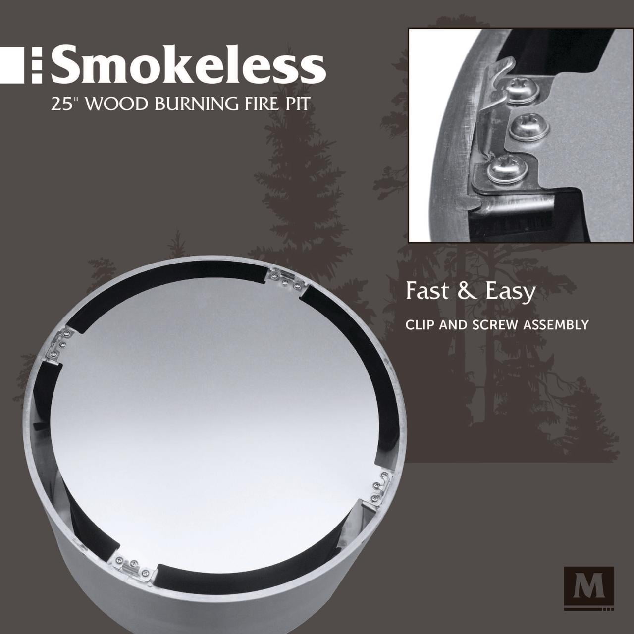 Produces 70% less smoke than traditional wood burning fire pits Made from durable and corrosion resistant stainless steel Black high temperature paint coated burn bowl to prevent rust and discoloration Easy to assemble in less than 5 minutes Raised design for use on a fire-safe surface Includes 400D PVC protective cover to protect from debris and scratches 25″ Diam x 17″ H, 35 lbs