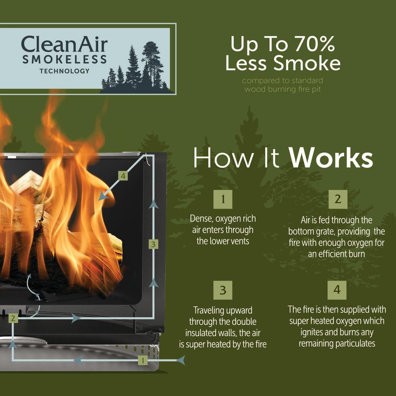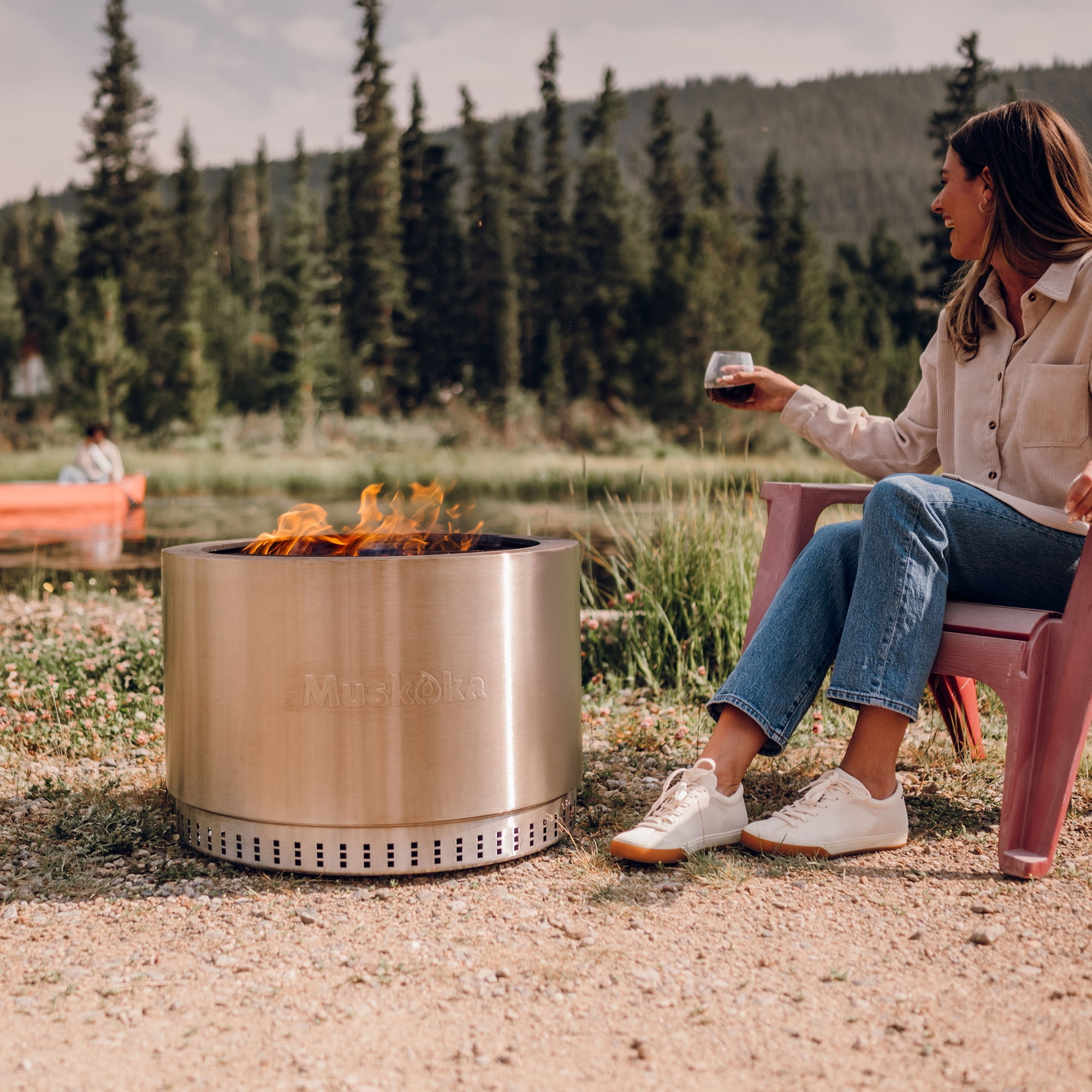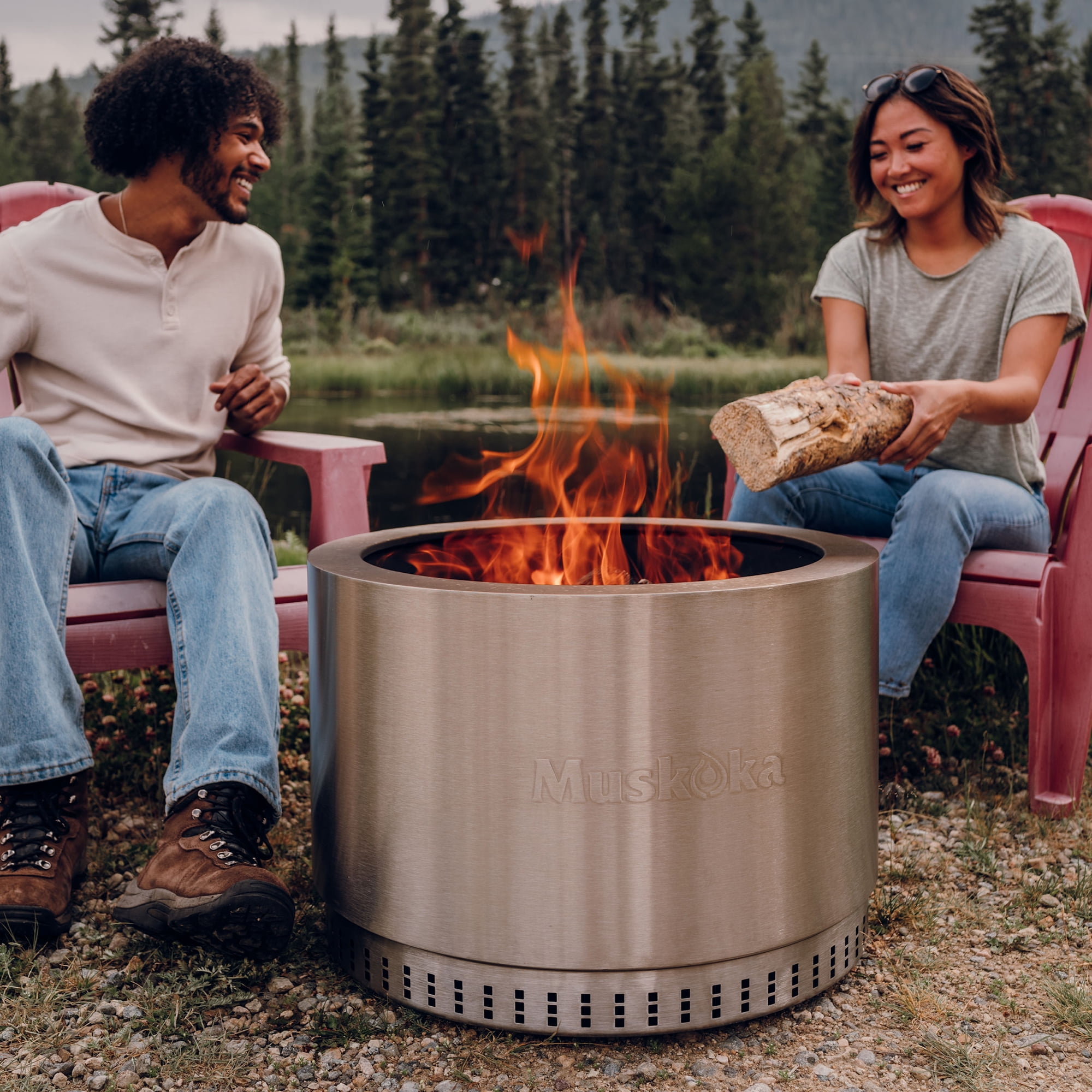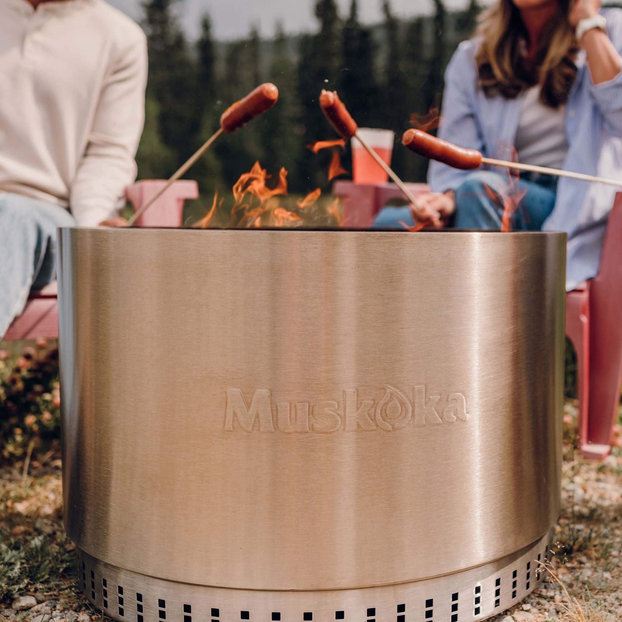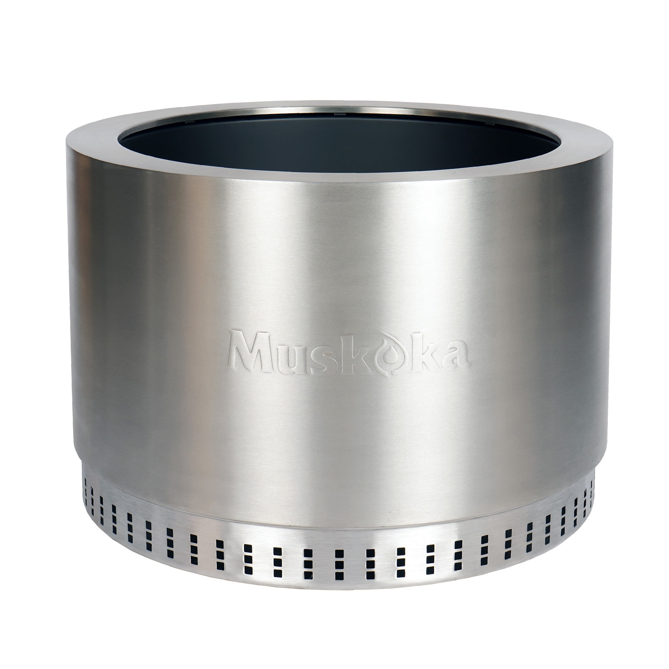 The smokeless, stainless steel Muskoka 25″ Wood-Burning Fire Pit with Cover brings the essence of ‘Cottage Country’ to your outdoor adventure. With its easy-to-assemble, 35 lb. durable design, you can gather around it with loved ones in the backyard or patio in less than 5 minutes. The fire pit also comes with a protective PVC cover to keep debris out of the unit and preserve its appearance. Enjoy a nearly smoke free experience with CleanAir Smokeless Technology, which reduces up to 70% of the smoke generated (compared to traditional style wood burning fire pits) when the wood level is below the top edge. This advanced outdoor fire pit design uses intake vents in the double-insulated walls and base to super-heat the air. That heated air is then circulated back into the fire bowl, feeding the flames again to create a fire that burns hotter. This air circulation process burns off would-be smoke particulates coming from the fire, and feeds more oxygen to your firepit for a more efficient burn. Take advantage of the easy clean up, with very little ash left behind after each use.