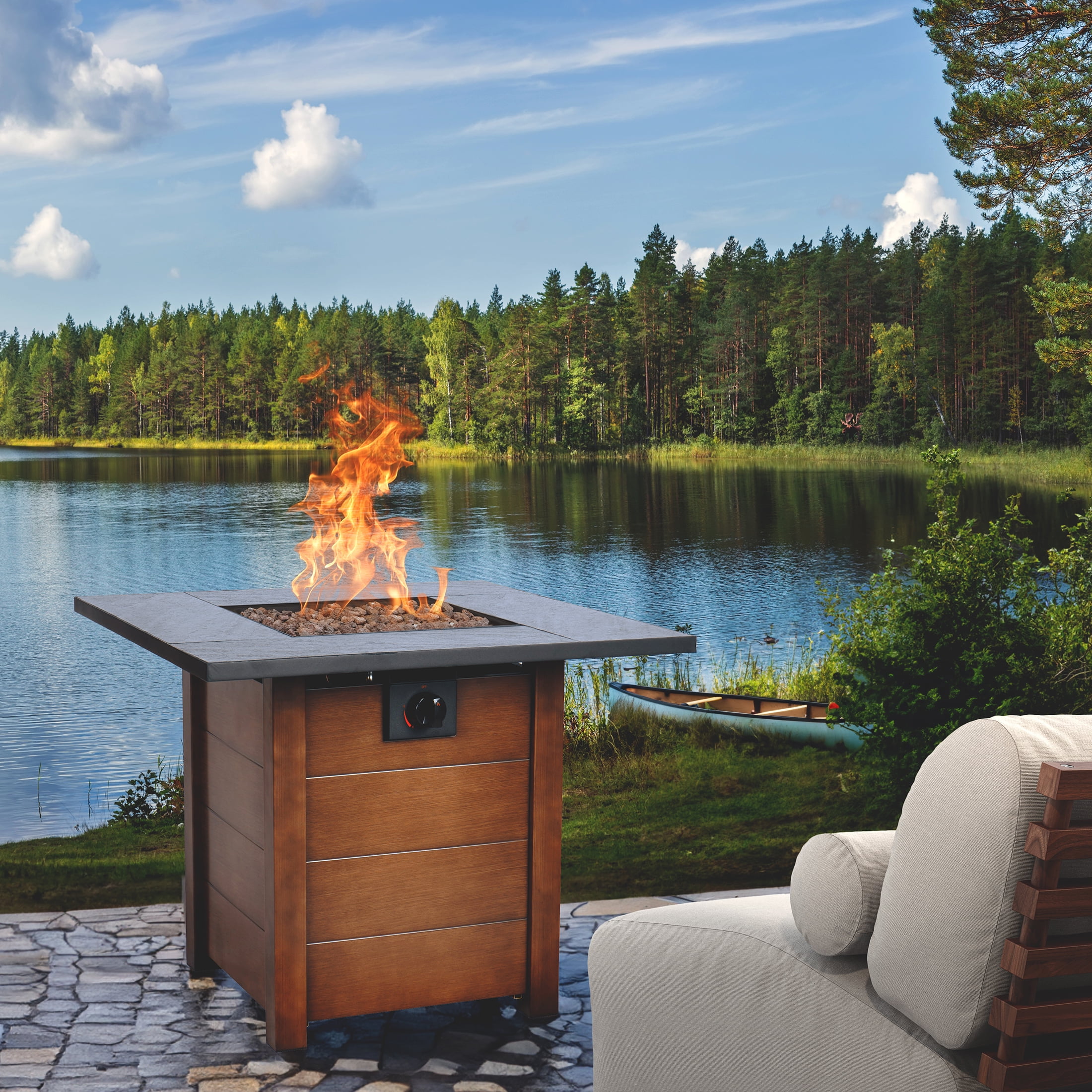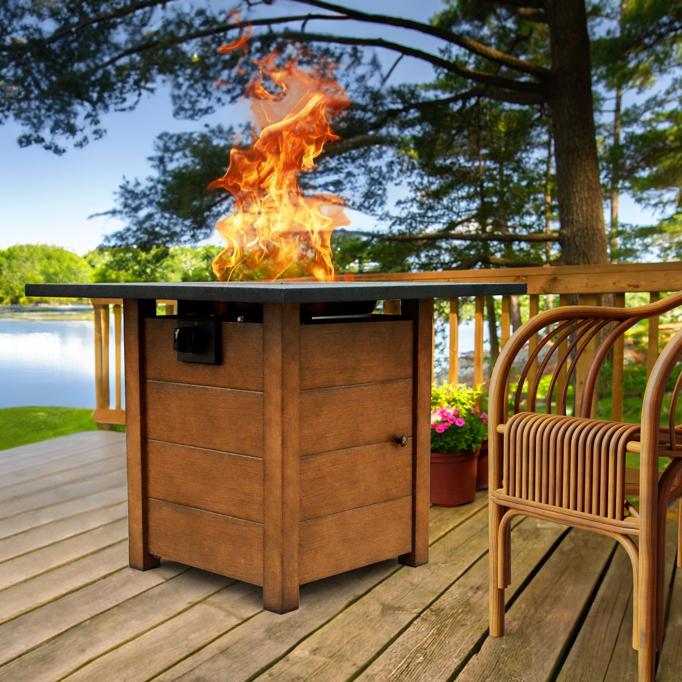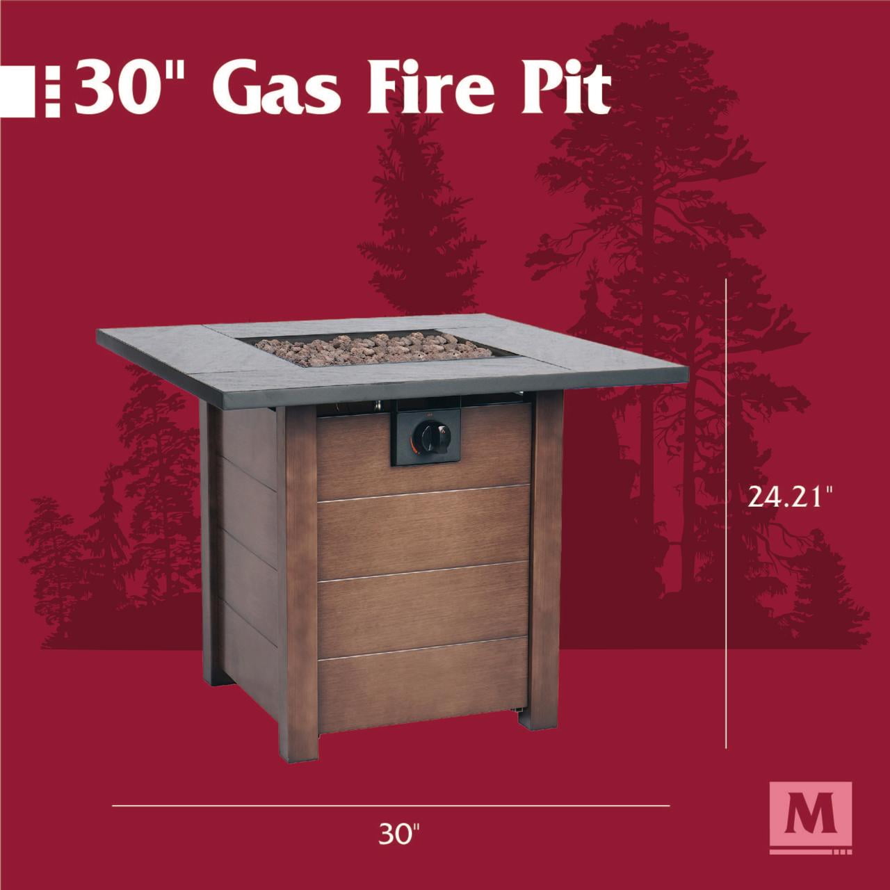 Provides 50,000 BTUs of heat with convenient push-button ignition Integrated control knob to easily adjust the intensity of the flames Durable steel and porcelain construction with a unique faux wood finish Includes lava rocks, protective cover, and steel burner lid to convert to a side table when not in use Uses a 20lb internal propane tank (sold separately) Some assembly required 30″ L x 30″ W x 24.2″ H, and 57.2lbs