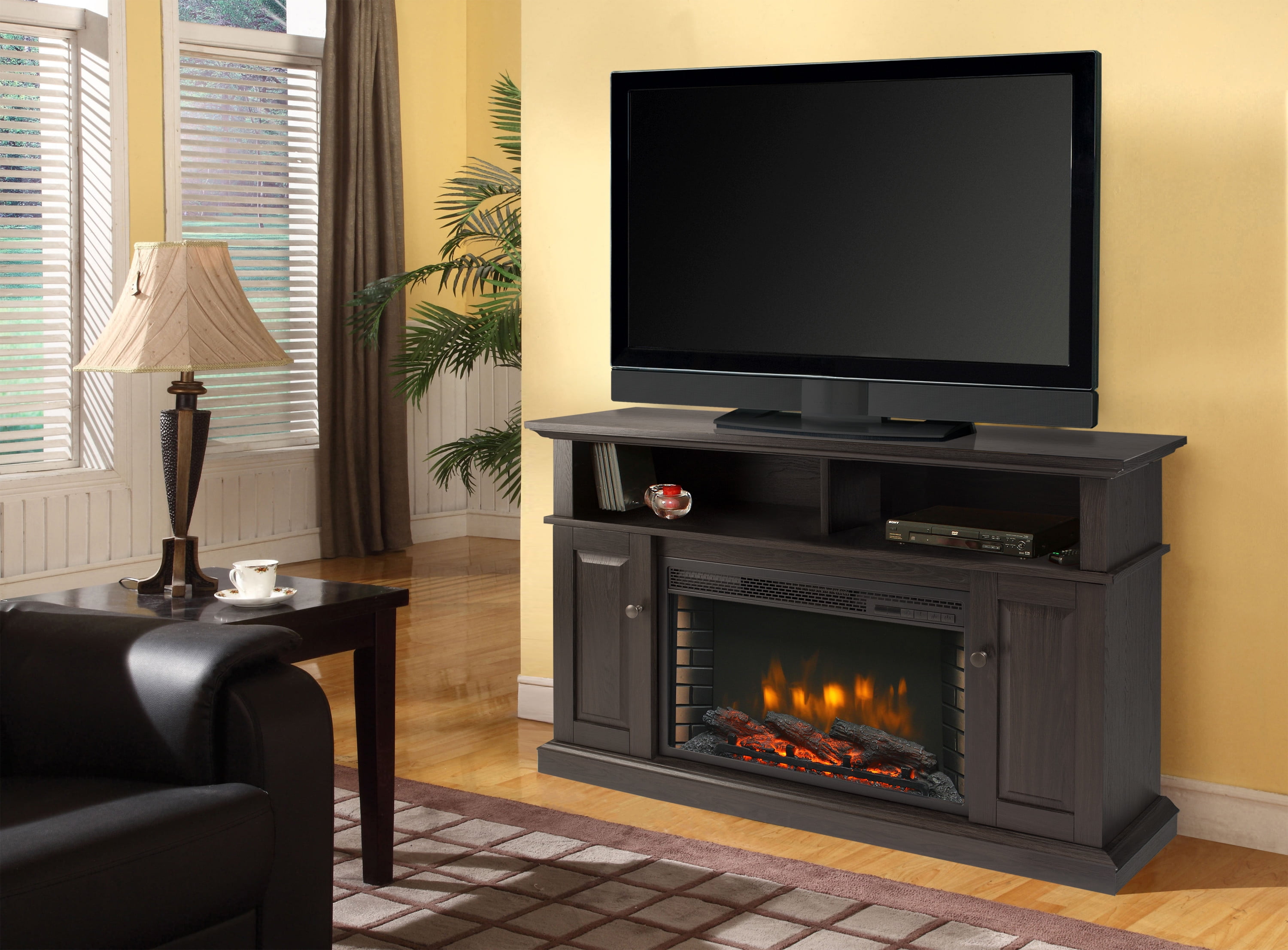 Delaney 48-in Media Fireplace in Rustic Brown Completely vent free – just plug it in and turn it on Realistic flame and randomly glowing ember bed effect 4600 BTU fan forced air heater warms up to 400 square feet Separate 3 brightness levels flame, 13 stage thermostatic temperature controls, and 8 Stage Timer Use with heater or without for ambiance LCD Display-Viewable display confirms settings, fades away after 10 seconds Includes multi-functional remote control Accommodates TV’s up to 55-in as well as DVD players and other media components Made of Glass, Metal and Wood Dimensions: 47.75 x 15.75 x 31 Inches