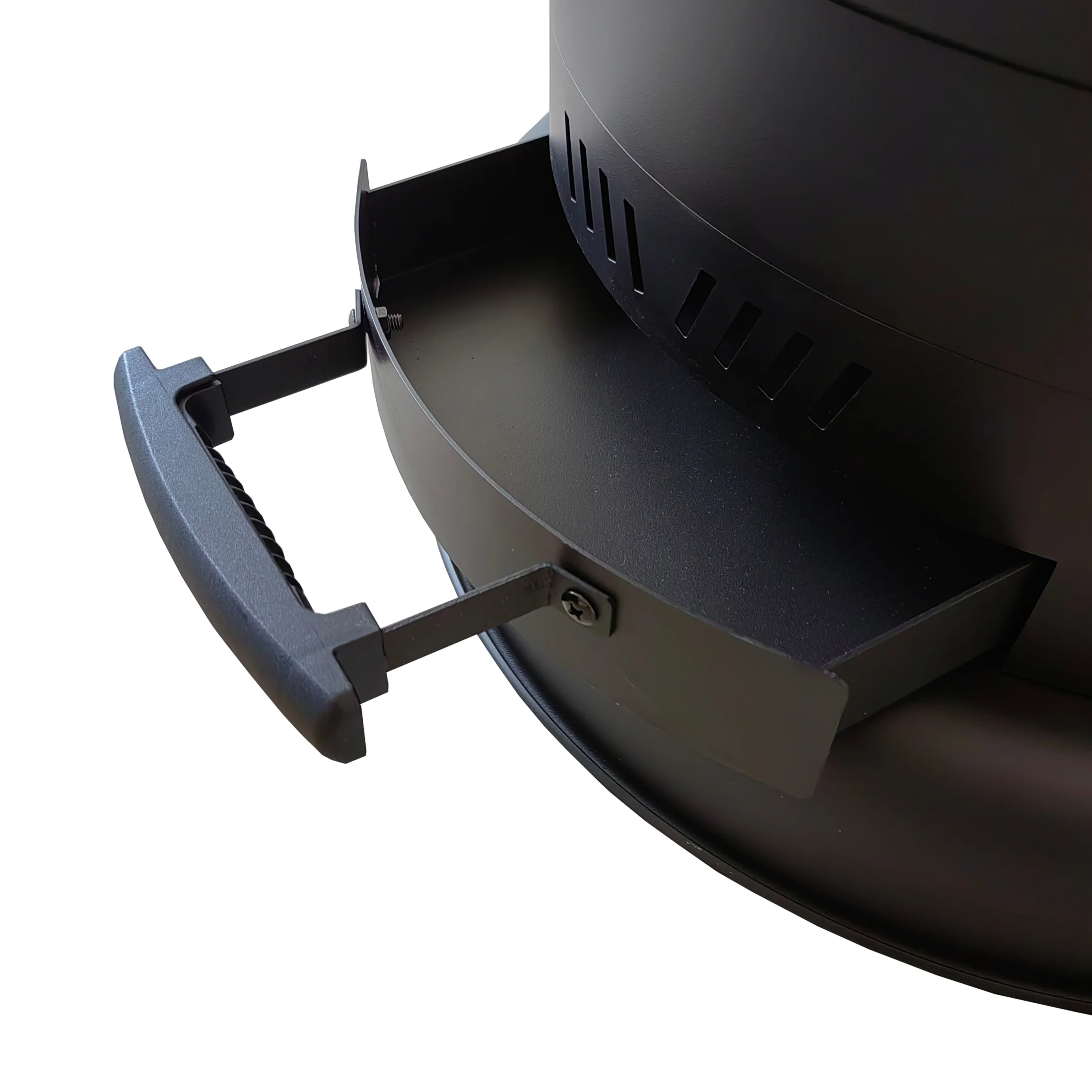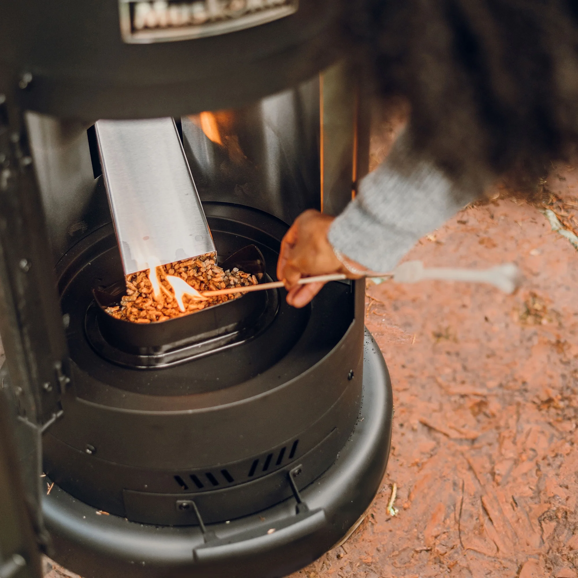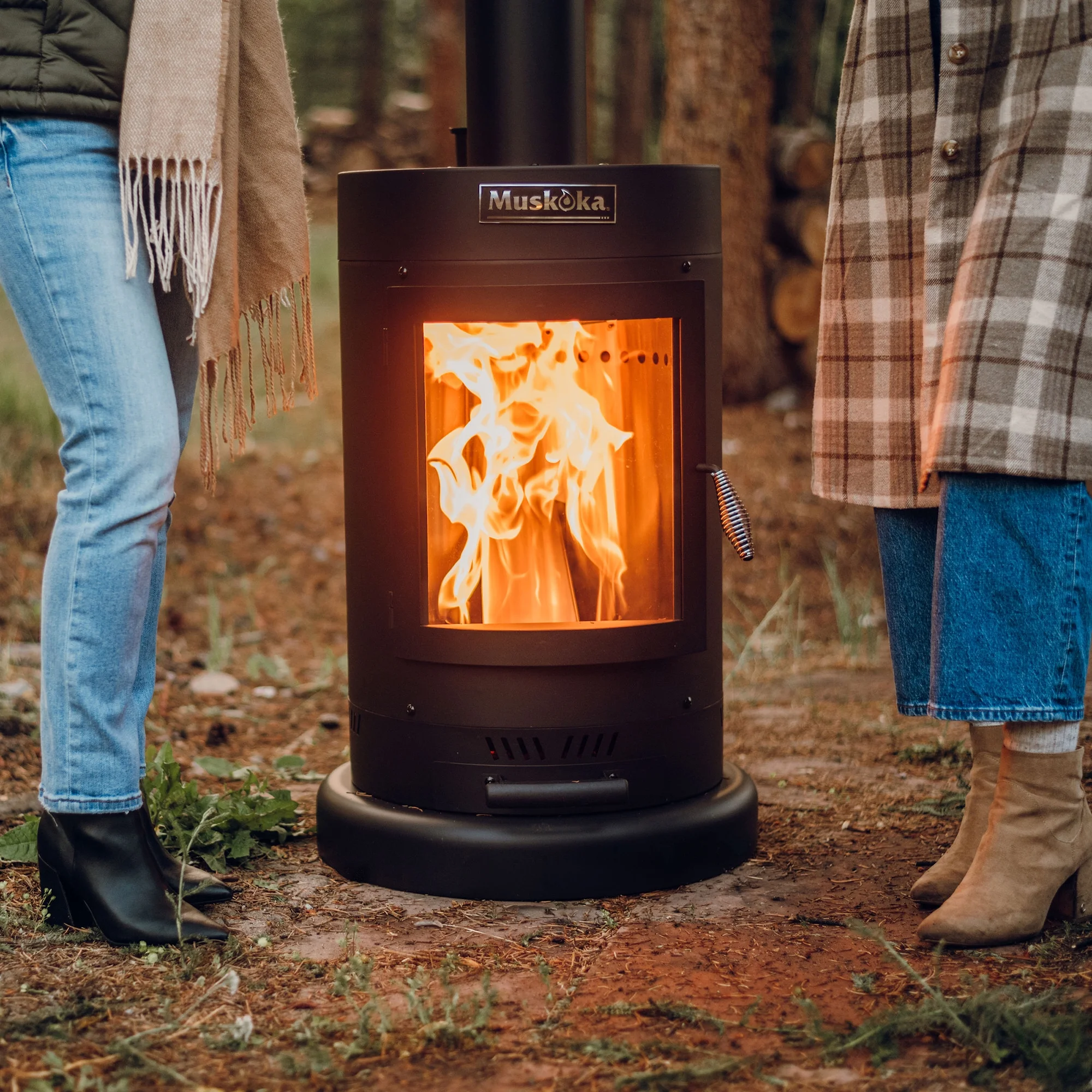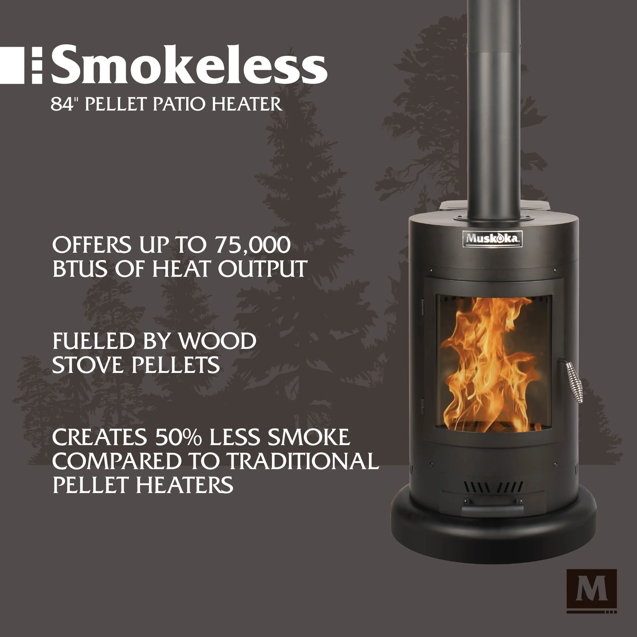 Experience nature under the warmth of the Muskoka 84″ High 75,000 BTU Black Steel Wood Pellet Patio Heater. This durable steel outdoor heater creates 50% less smoke compared to traditional pellet heaters, providing air quality-enhancing technology allowing you to enjoy an evening under the stars. Load the 20 lb. hopper with wood pellets to quickly heat your outdoor space. The gravity-automatic feeding system on the heater allows you to savor up to 5 hours of warmth. Invite a loved one into the heater’s 120 sq. ft. heat radius, and gaze at the flames through the glass window. Assembly required.