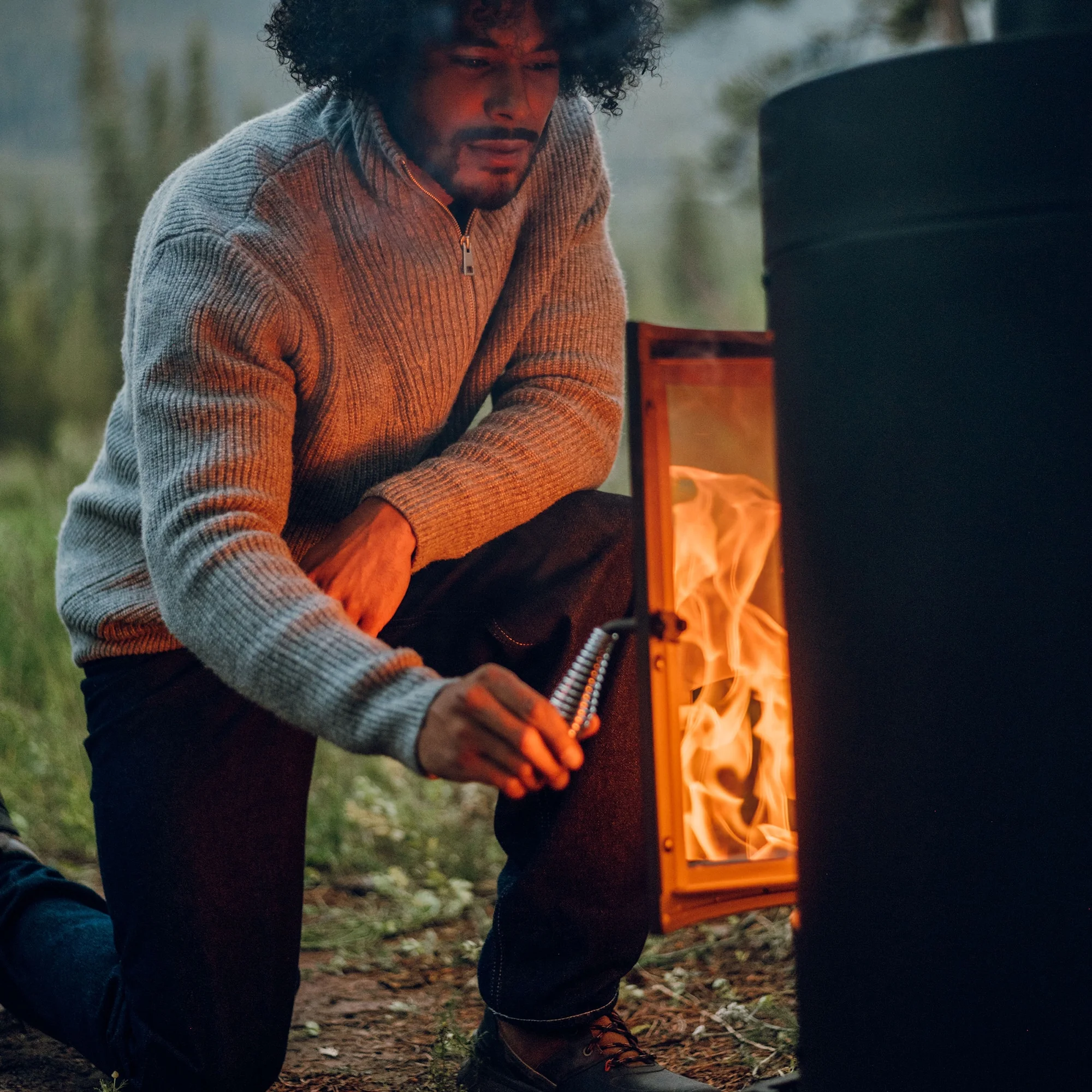 Durable, 100% steel design 75,000 BTUs max heat output over a 120 sq. ft. radius Provides 4.5-5 hours of burn time on a full hopper Creates 50% less smoke compared to traditional pellet heaters Max hopper capacity is 20 lbs. Gravity-automatic, continuous feeding into firepot for uninterrupted burning Large glass window in door for viewing the flames Easy to reposition using the integrated wheel kit Includes removable ashtray for easy clean-up Uses wood pellets (sold separately) Must light manually with long-stemmed match or lighter Assembly Required FOR OUTDOOR USE ONLY 30” L x 21” W x 84” H, 74.8 lbs.