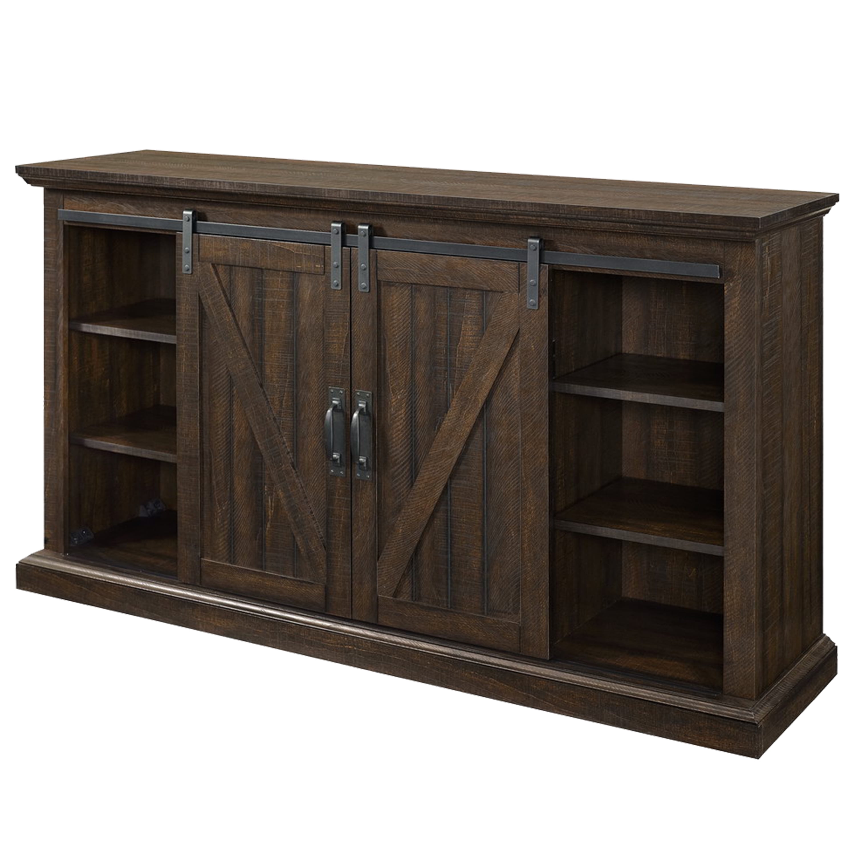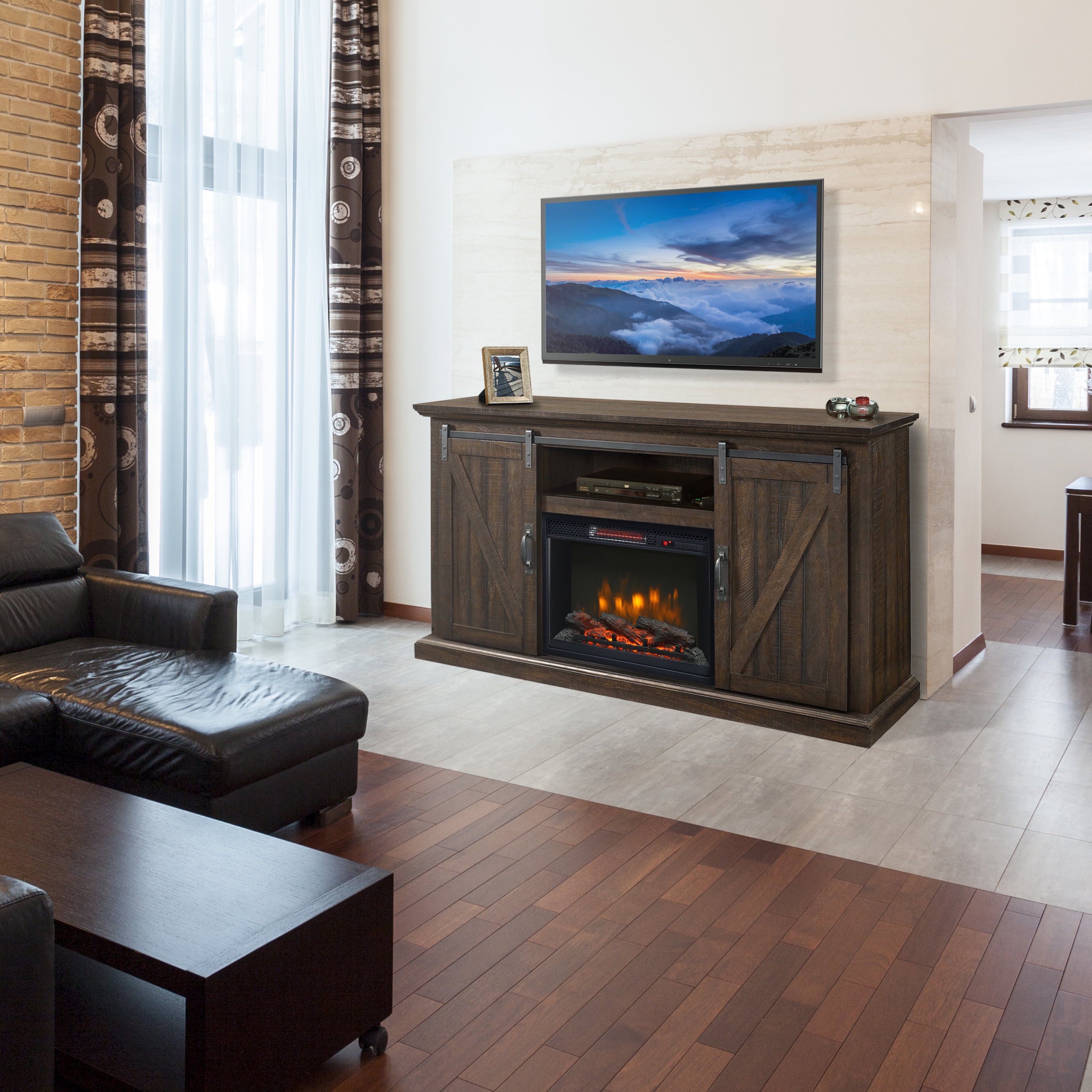 Bring rustic charm and warmth to your living space with the Muskoka Woodbury 58-in infrared media electric fireplace. This customizable electric fireplace allows you to enjoy the ambiance of a fire in every season. Easily adjust the flame brightness and temperature with the multi-function remote control. The 1350 watt heater will heat a room up to 1000 square feet, and the mantle will house your TV up to 58-in wide with a built-in compartment for your media playing devices. The rustic brown finish, barn-door-style panels and industrial-style rivets add an upscale farmhouse feel to any space. So liven up your living room with the Langdon infrared media electric fireplace from Muskoka.