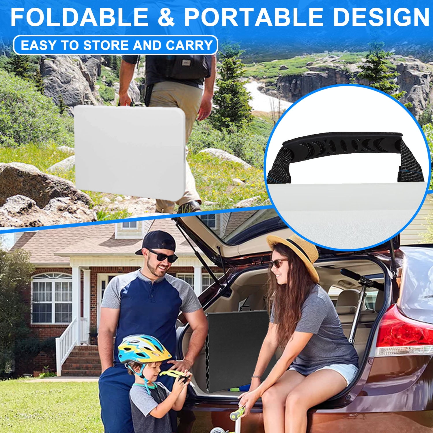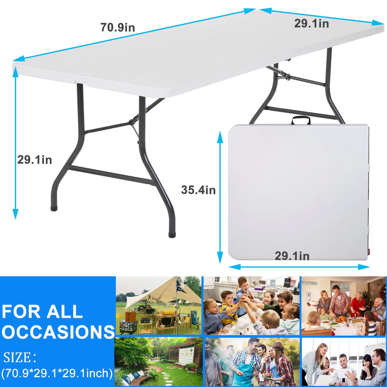 ???? Secure Lock – Keeps table closed when transporting ???? Comfort Handle – Comfortable to carry when folded and locked. ???? All Season Table Top – Indoor and Outdoor Use ???? Lightweight – 25.5 pounds, makes this table easy to carr ???? Spacious Gathering: 70.8″ x 29.1″ x 29.1″. ???? Folded Dimensions of 36.5″(L) x 29.6″(D) x 3″(H) – Makes for easy transportation and storage when not in use. The durable high density resin table top is easy to clean and weather resistant.