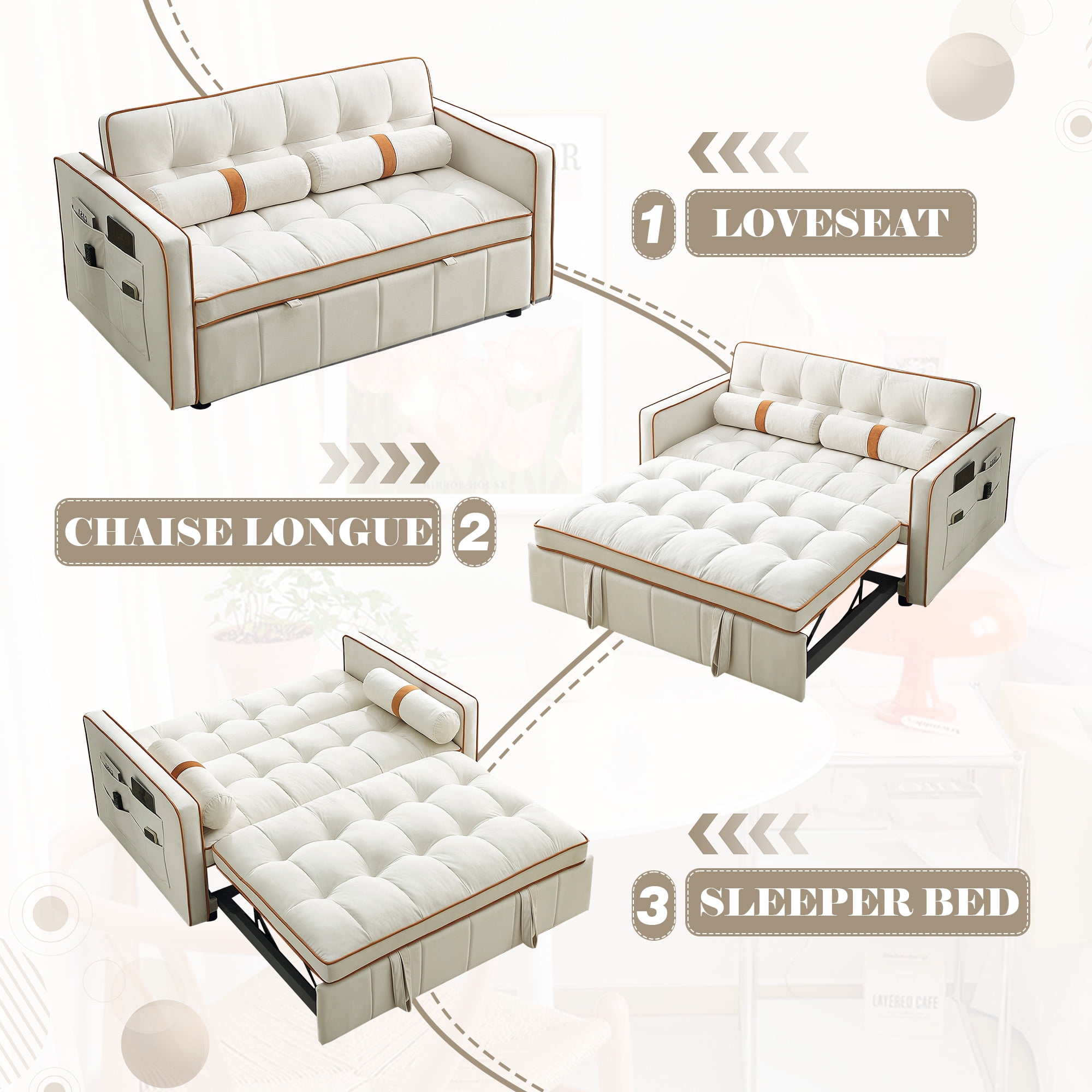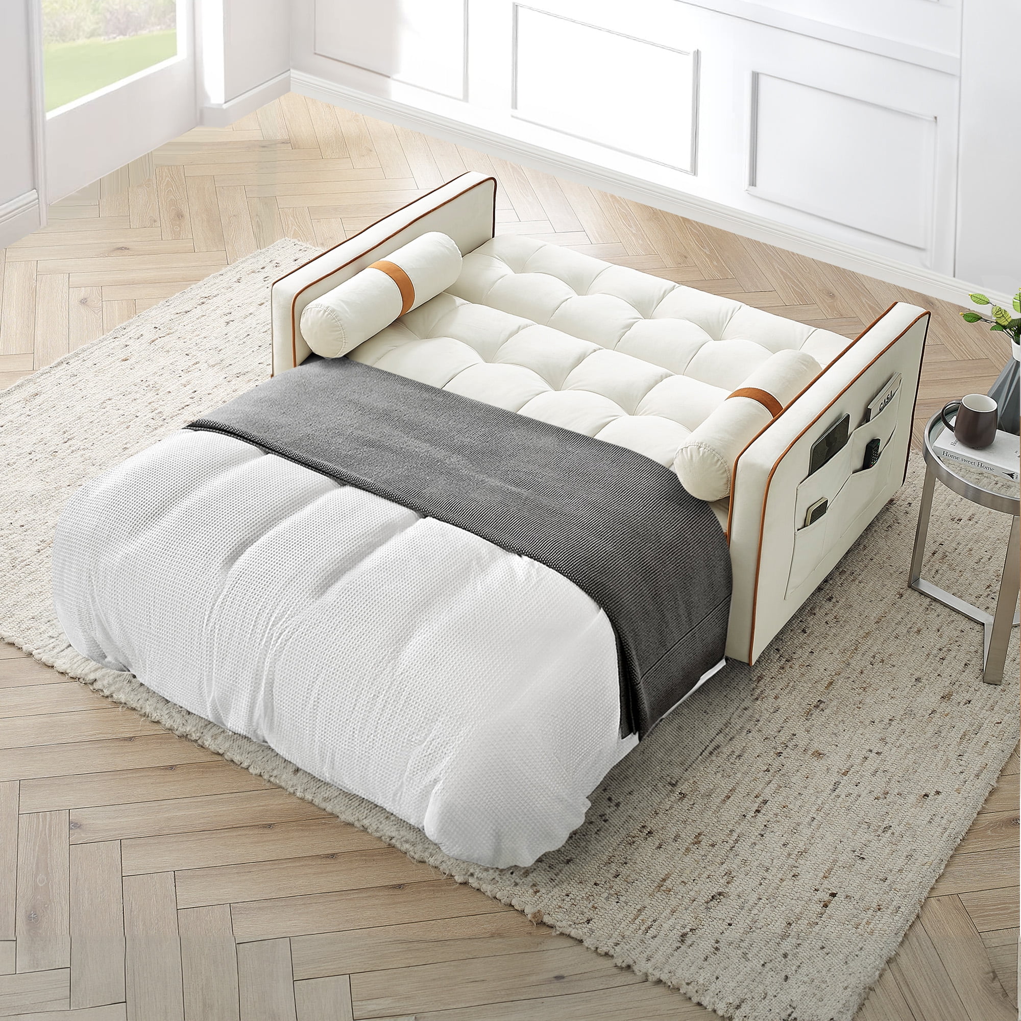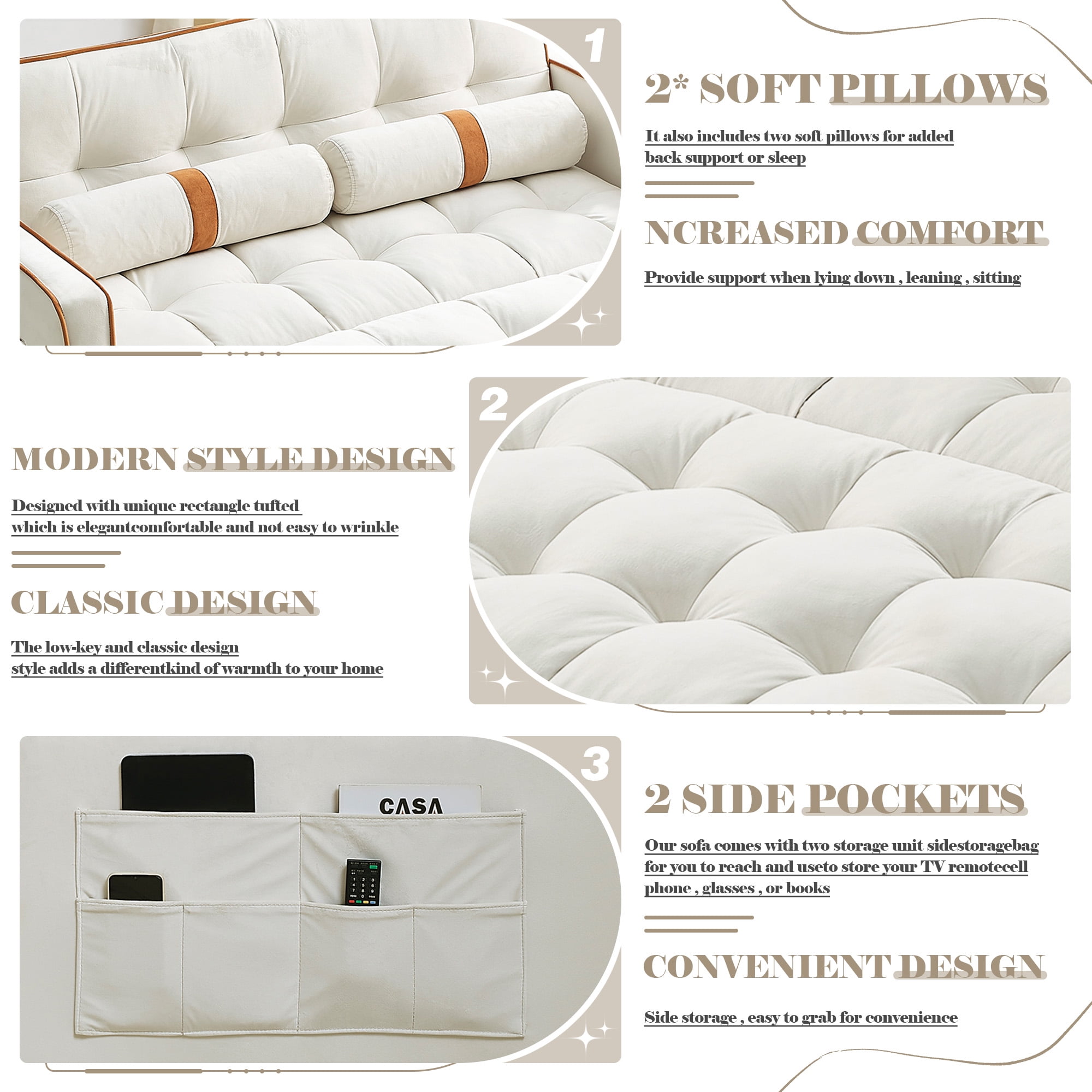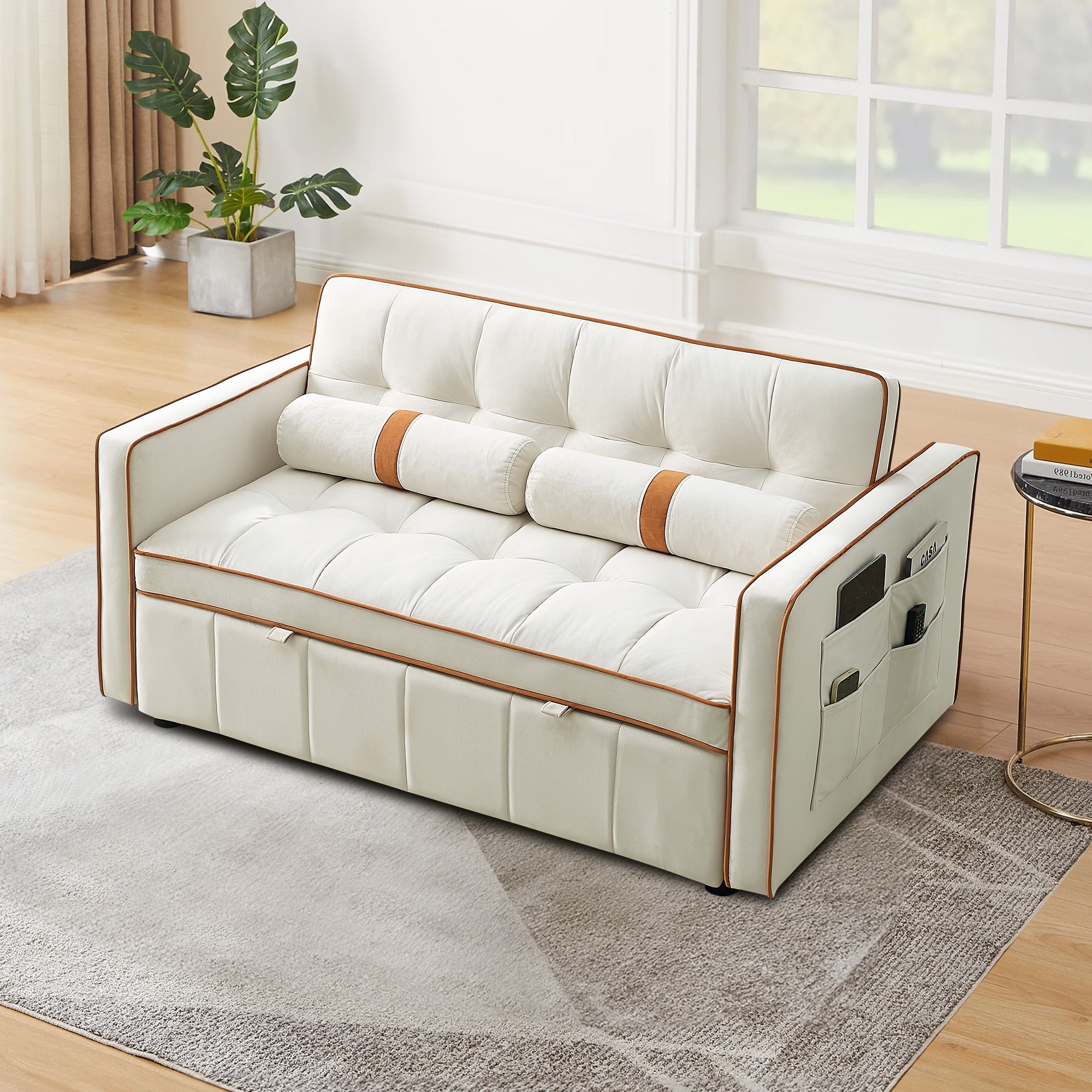 Introducing the Muumblus convertible sofa bed – a perfect blend of contemporary aesthetics and practicality. This compact and stylish piece of furniture is designed to seamlessly integrate into your living room, bedroom, or home office, adding a touch of modern elegance to your space. The foam-filled sleeper sofa is inviting and comfortable, making it perfect for lounging or resting. Whether you’re hosting a movie night or preparing for a sleepover, the Muumblus sofa bed ensures you’re always ready to accommodate your guests in style and comfort. Muumblus Convertible Sofa Bed, 55″ Pull Out Sofa Bed – Tufted Velvet Loveseat Sleeper Sofa Couch for Living Room, Beige CONVERTIBLE SOFA BED — Pull the included handle and it slides out on its rollers to make loveseat sofa converts to 2 Seat Adult lounge chair/sleeper bed easily! 3 LEVEL ADJUSTABLE BACKREST — This convertible sofa meets your various needs.So easy to make loveseat converts to bed. Nice to sitting,laying and sleeping,it can be easily converted into chaise lounge or a sleeper bed for small apartment. SPACE SAVING DESIGN & STORAGE POCKETS — With its folded compact size,it is easy to store and space saving when not use. Our sofa comes with a removable side storage bag for you to reach and use to store your TV remote, cell phone, glasses or books. STRONGE STRUCTURE — Crafted of sturdy wood frame, strong sinuous spring, high-density foam, soft velvet fabric,good foam-filled seats, soft 2 lumbar pillows make you feeling so comfortable to take a good rest. Maximum Weight Capacity is 500 lbs. EVRY EVRY EASY TO ASSEMBLE — With clear instruction and hardware, our sofa bed is easy to assemble. It is convenient for you to save much time and energy. As a sofa size: 55″L x 38.5″W x 30.5″H; As a sofa bed size: 46″L x 70″D