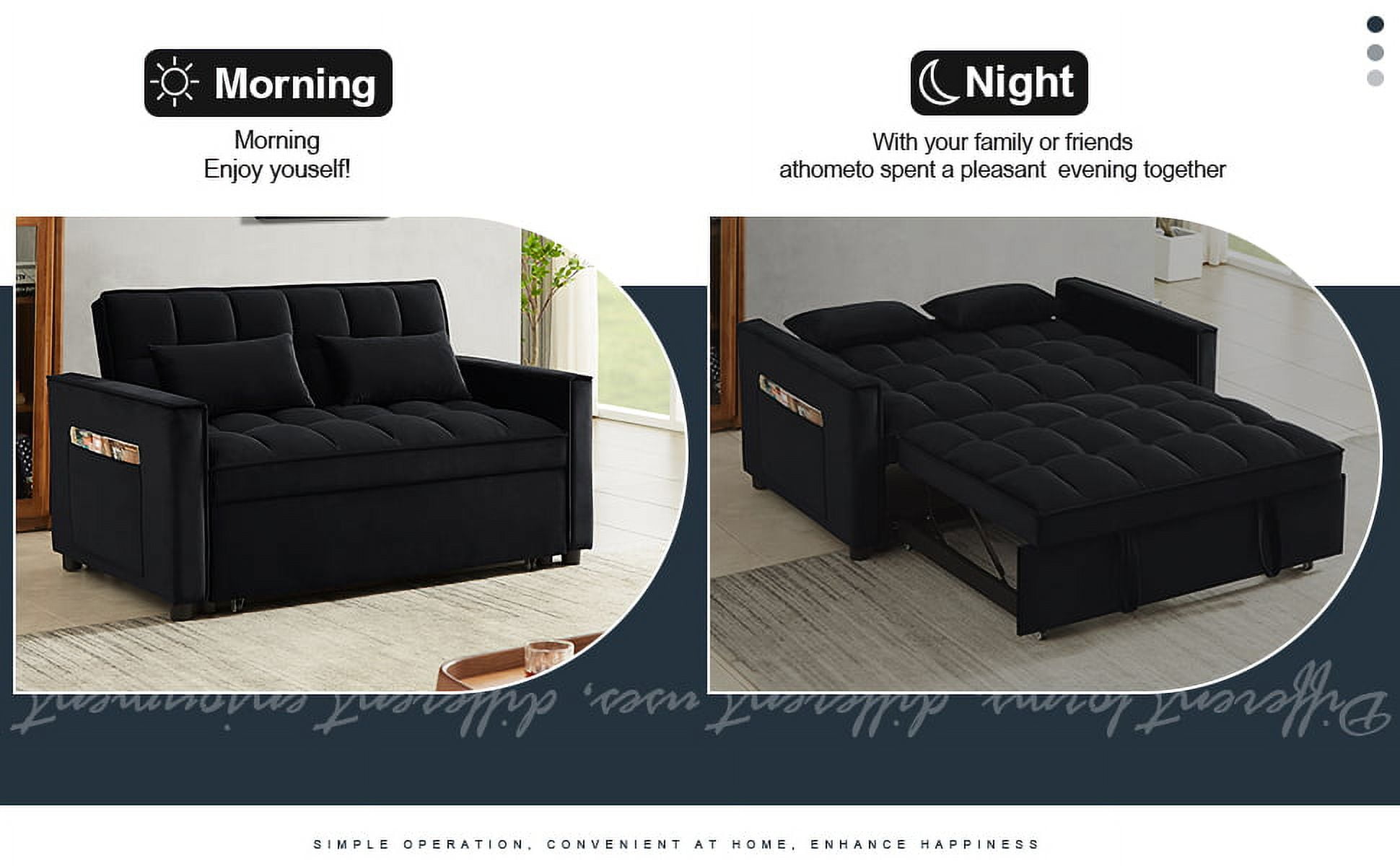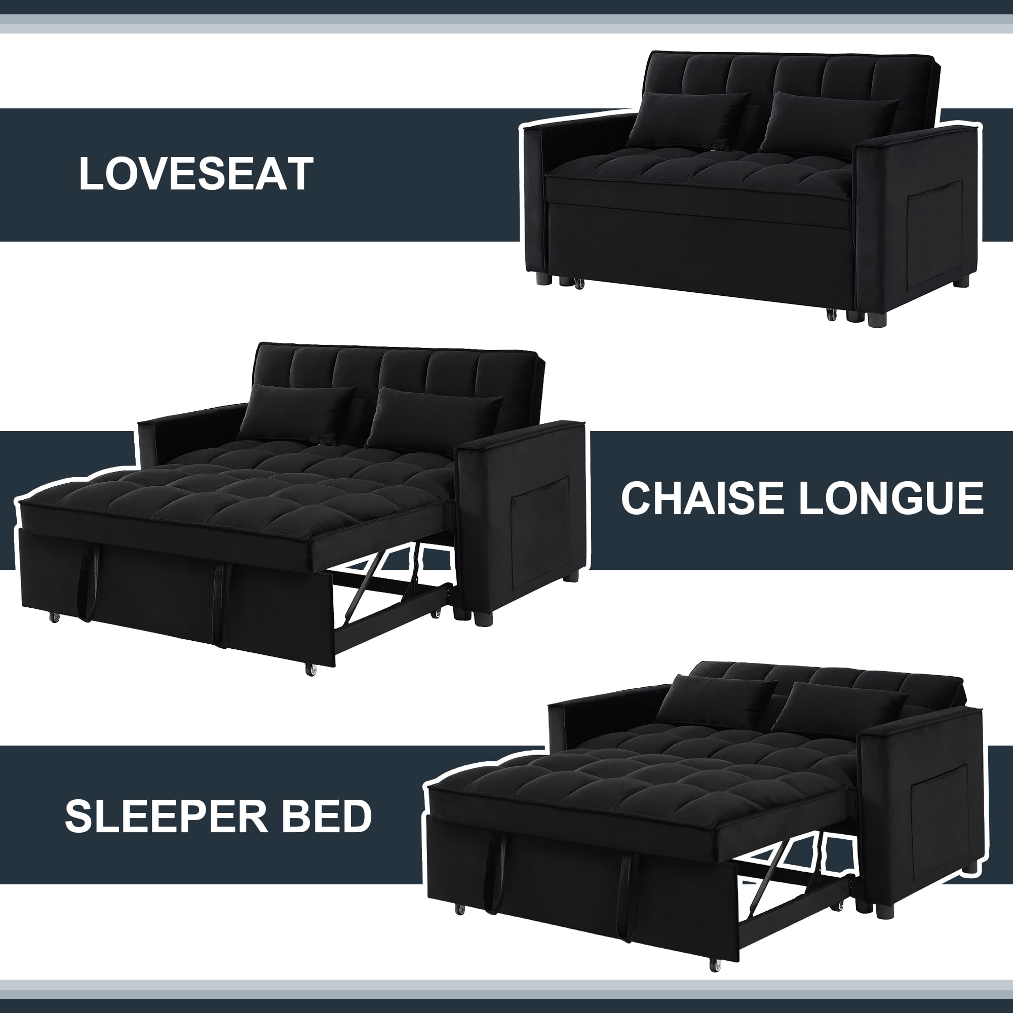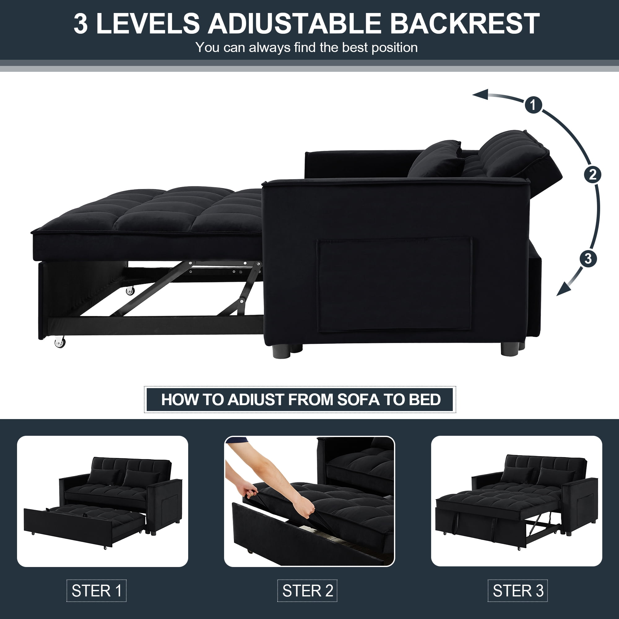 CONVERTIBLE SOFA BED — Pull the included handle and it slides out on its rollers to make loveseat sofa converts to 2 Seat lounge chair/sleeper bed easily! 3 LEVEL ADJUSTABLE BACKREST — This convertible sofa meets your various needs.So easy to make loveseat converts to bed. Nice to sitting,laying and sleeping,it can be easily converted into chaise lounge or a sleeper bed for small apartment. SPACE SAVING DESIGN & STORAGE POCKETS — With its folded compact size,it is easy to store and space saving when not use. Our sofa comes with a removable side storage bag for you to reach and use to store your TV remote, cell phone, glasses or books. STRONGE STRUCTURE — Crafted of sturdy wood frame, strong sinuous spring, high-density foam, soft velvet fabric,good foam-filled seats, soft 2 lumbar pillows make you feeling so comfortable to take a good rest. Maximum Weight Capacity is 500 lbs. EVRY EVRY EASY TO ASSEMBLE — With clear instruction and hardware, our sofa bed is easy to assemble. It is convenient for you to save much time and energy. As a sofa size: 55″L x 33.5″W x 31.5″H; As a sofa bed size: 46.9″L x 70.5″D x 18.5“H