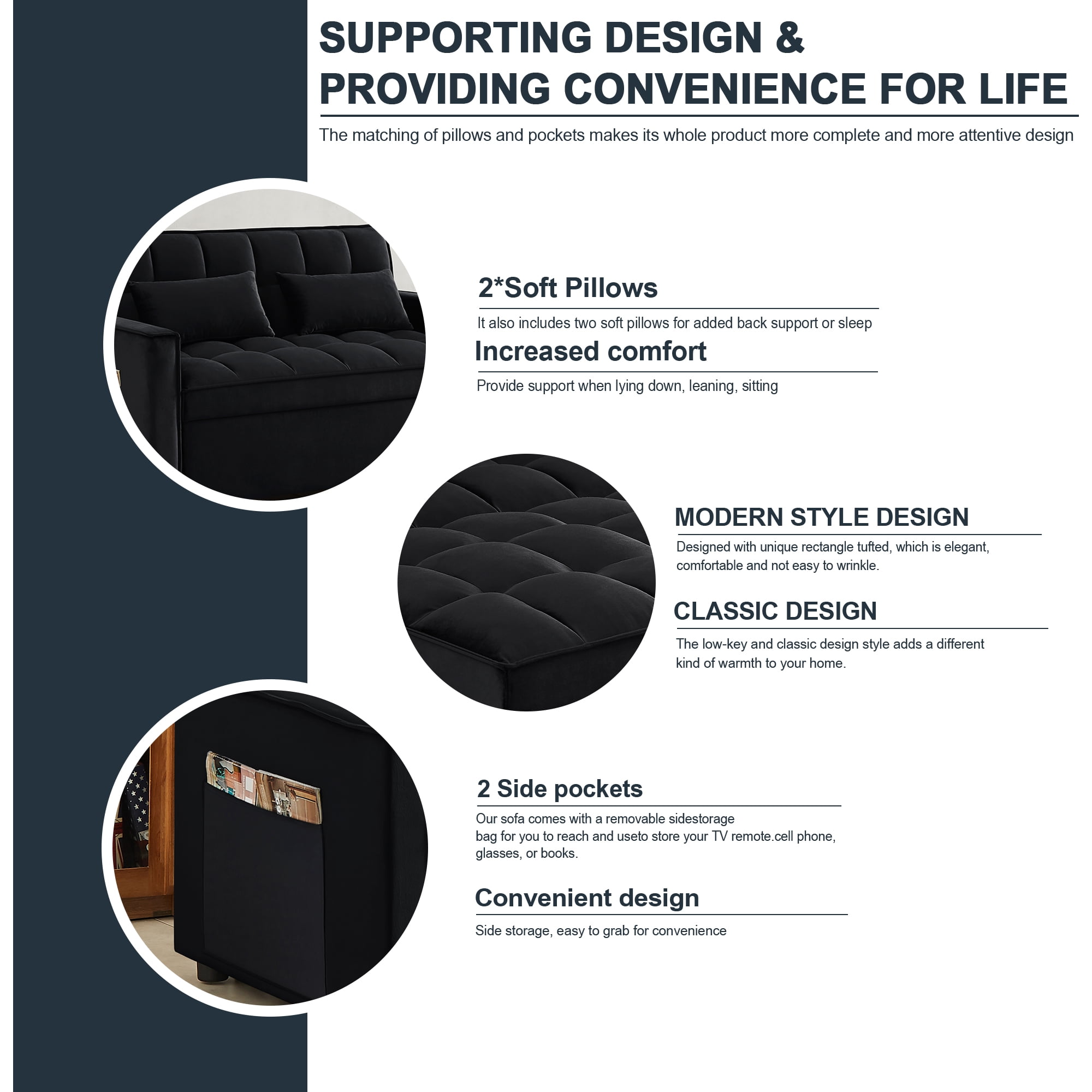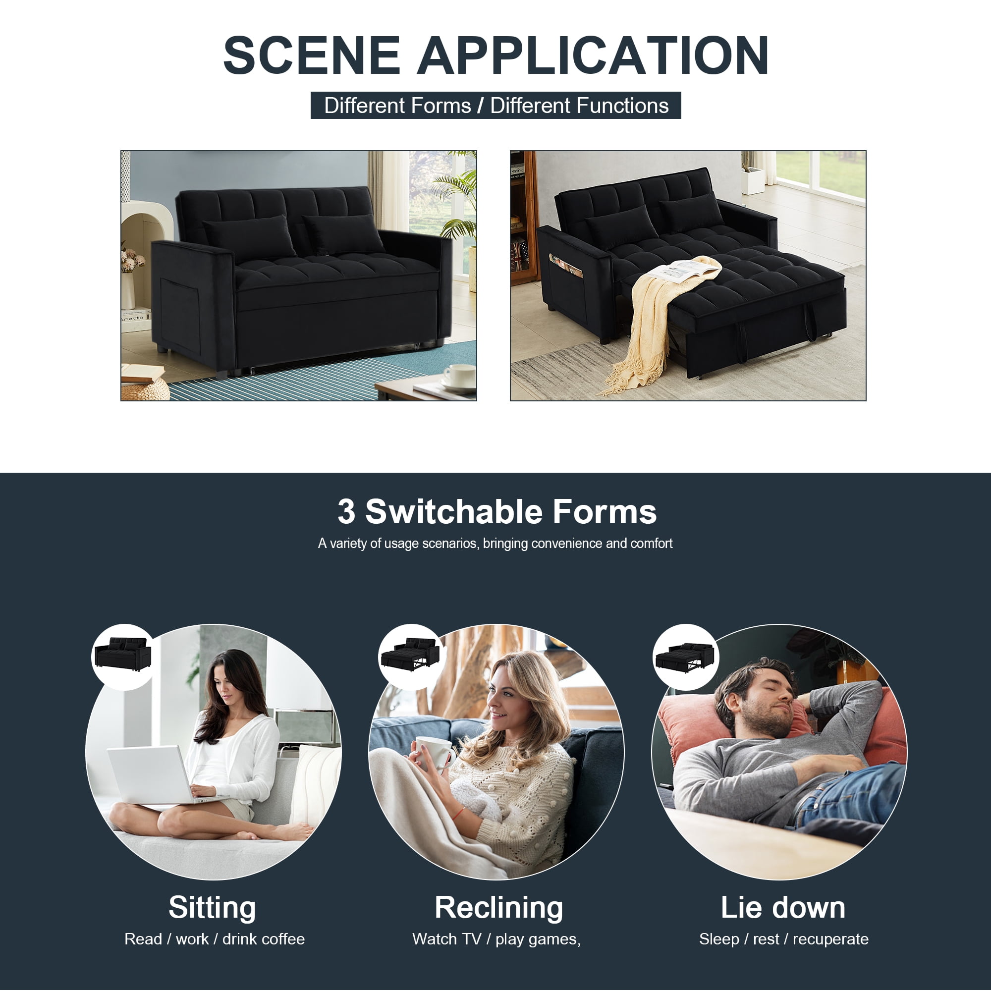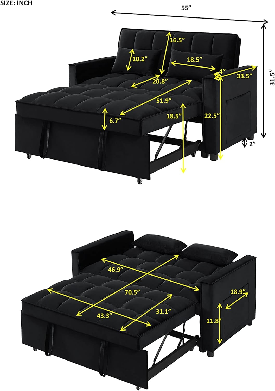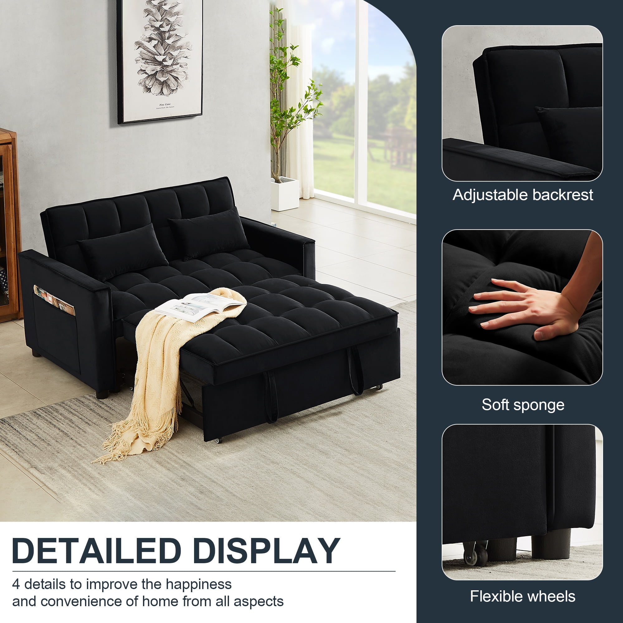 CONVERTIBLE SOFA BED — Pull the included handle and it slides out on its rollers to make loveseat sofa converts to 2 Seat lounge chair/sleeper bed easily! 3 LEVEL ADJUSTABLE BACKREST — This convertible sofa meets your various needs.So easy to make loveseat converts to bed. Nice to sitting,laying and sleeping,it can be easily converted into chaise lounge or a sleeper bed for small apartment. SPACE SAVING DESIGN & STORAGE POCKETS — With its folded compact size,it is easy to store and space saving when not use. Our sofa comes with a removable side storage bag for you to reach and use to store your TV remote, cell phone, glasses or books. STRONGE STRUCTURE — Crafted of sturdy wood frame, strong sinuous spring, high-density foam, soft velvet fabric,good foam-filled seats, soft 2 lumbar pillows make you feeling so comfortable to take a good rest. Maximum Weight Capacity is 500 lbs. EVRY EVRY EASY TO ASSEMBLE — With clear instruction and hardware, our sofa bed is easy to assemble. It is convenient for you to save much time and energy. As a sofa size: 55″L x 33.5″W x 31.5″H; As a sofa bed size: 46.9″L x 70.5″D x 18.5“H