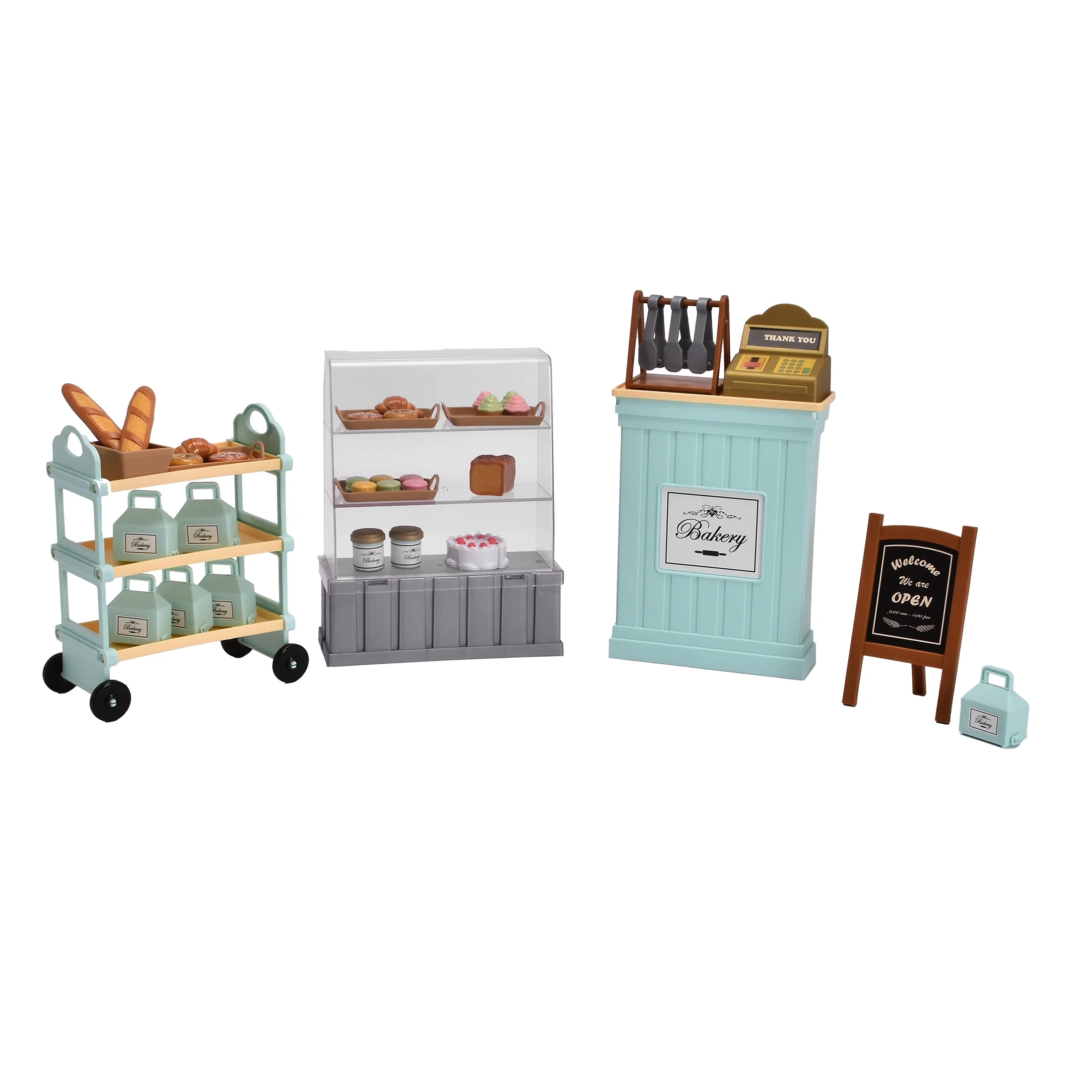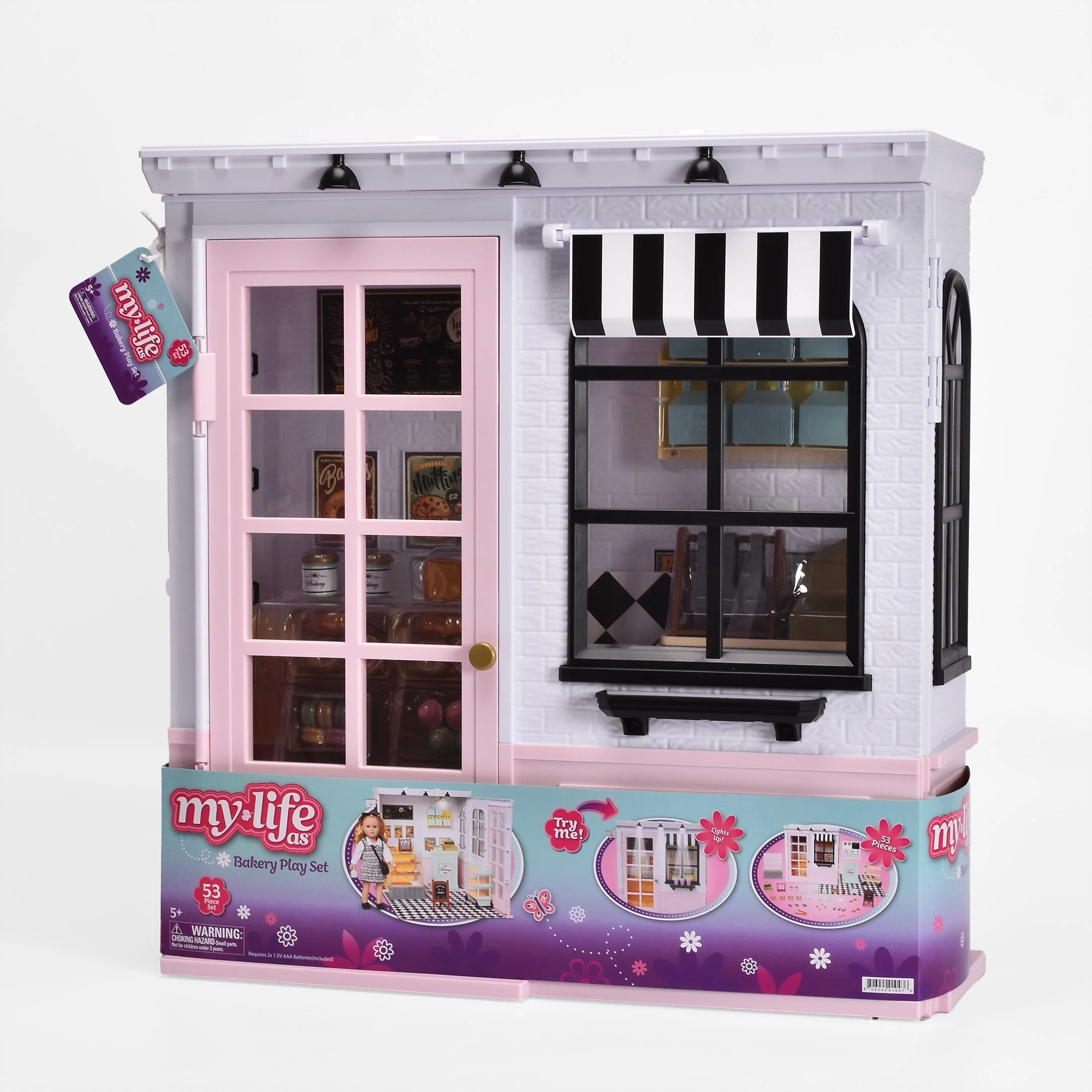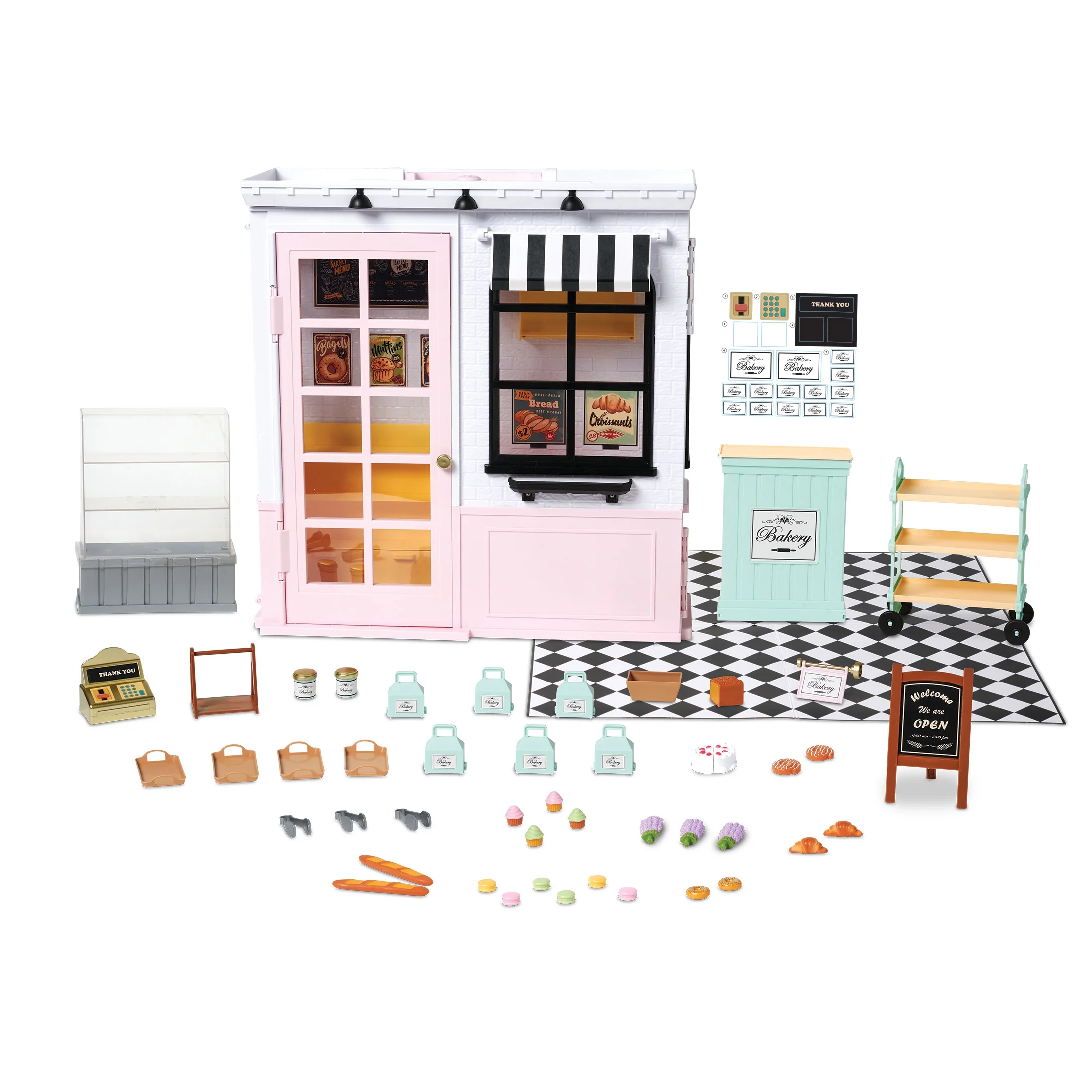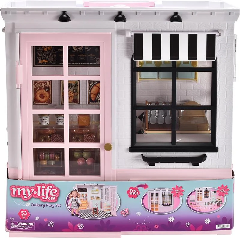 Everything a bakery-loving little one needs for their 18-inch doll! Includes trays filled with wonderful baked goods: baguettes, bagels and rye bread. As well as pastry boxes that can be filled with colorful cupcakes to take on the go from the bakery 53-piece set includes: 1 x Rye Bread, 2 x Bagels, 2 x Baguettes, 2 x Croissants, 1 x Cinnamon Rolls, 4 x Cup Cake Tops, 4 x Cup Cake Base, 1 x Cake, 6 x Macaroons, 2 x Jams, 4 x Trays (A), 1 x Tray (B), 1 x Sign, 1 x Welcome Board, 1 x Tongs Holder, 3 x Tongs, 1 x Cashier, 1 x Counter, 1 x Pastry Case, 3 x Lilacs, 6 x Pastry Boxes, 1 x Rolling Cart, 1 x Map, 1 x A5 Sticker For 18” dolls Part of the My Life As Doll Collection Exclusive to For children aged 5 and up Product dimensions: 22” x 21” x 8.5” Requires batteries (included)