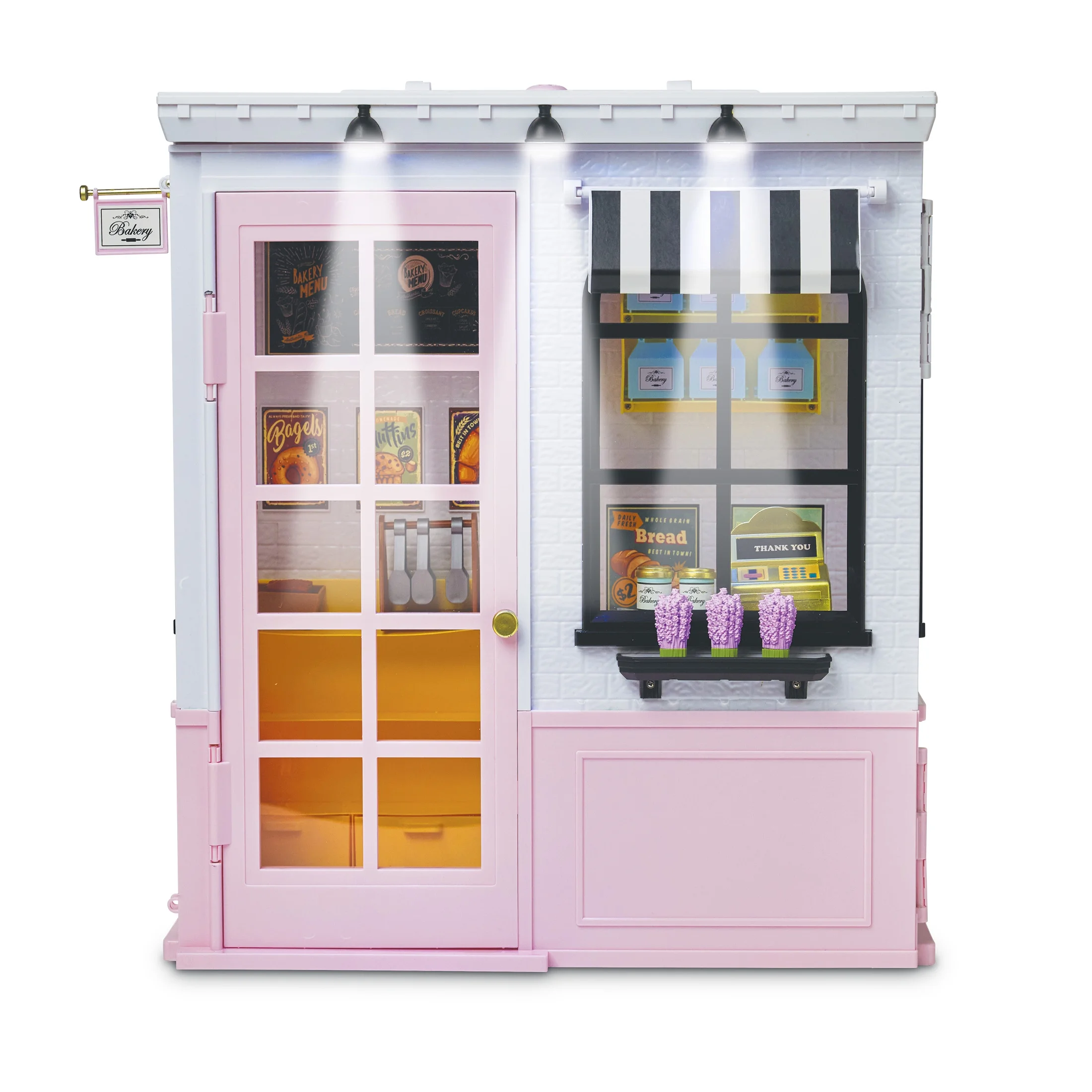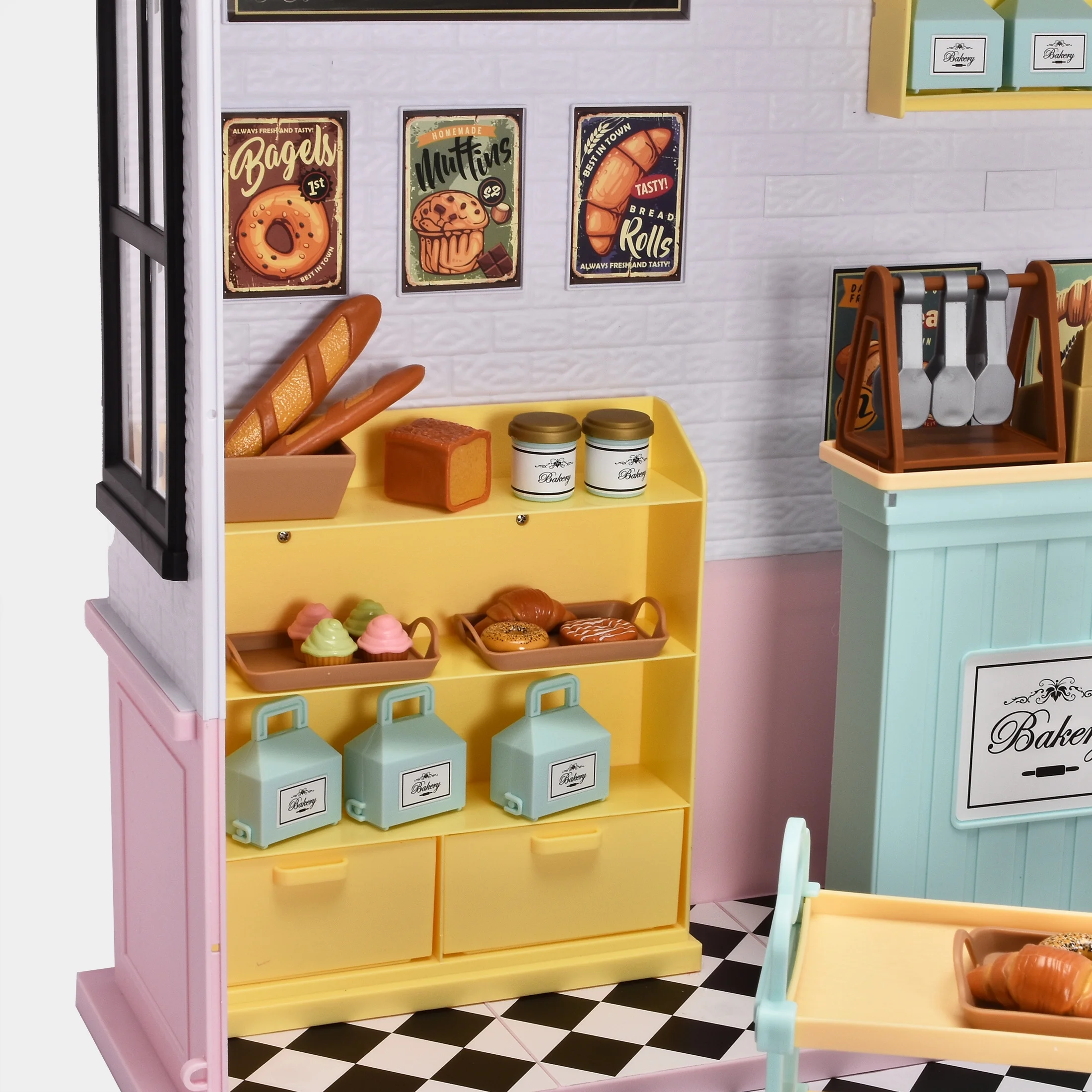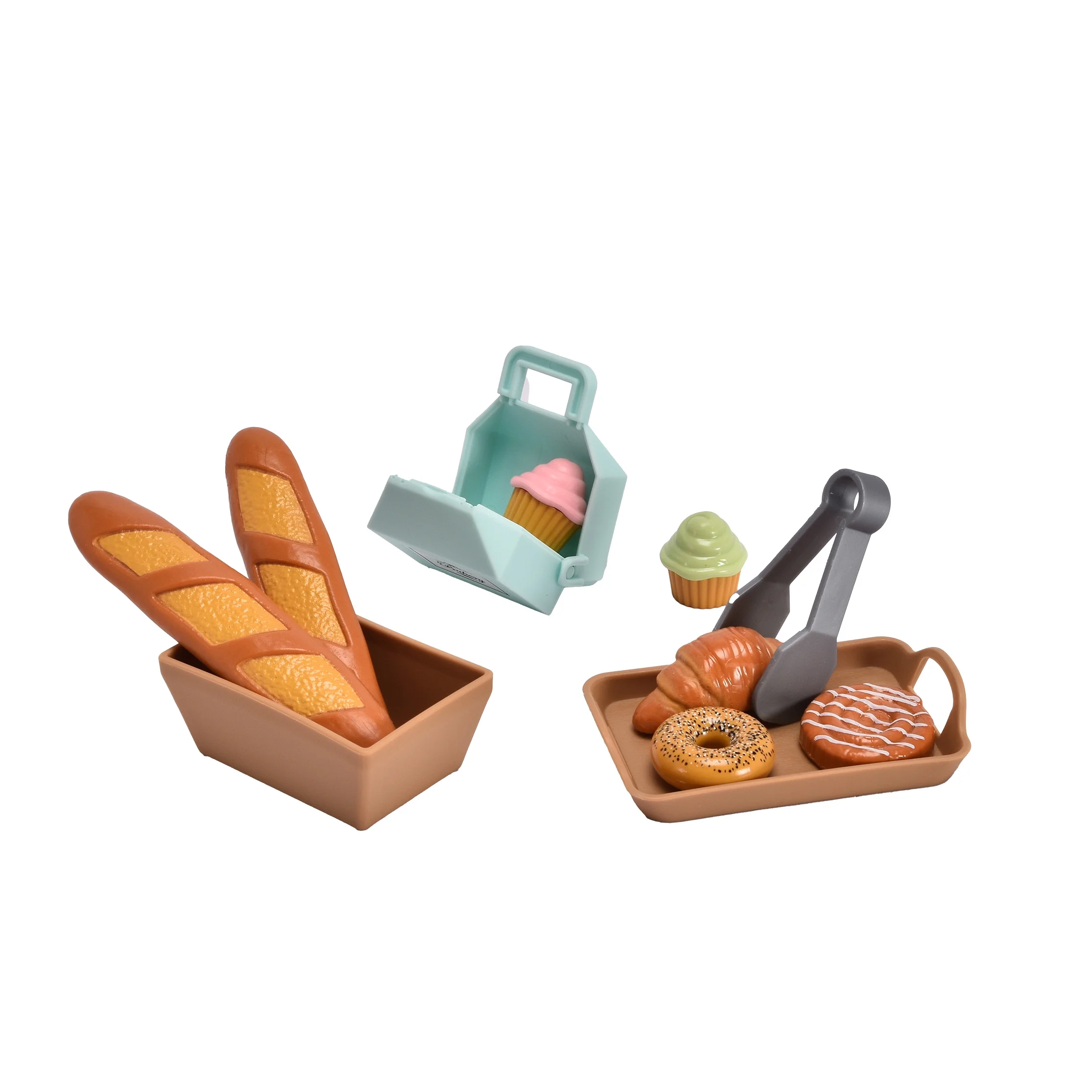 Everything a bakery-loving little one needs for their 18-inch doll! Includes trays filled with wonderful baked goods: baguettes, bagels and rye bread. As well as pastry boxes that can be filled with colorful cupcakes to take on the go from the bakery 53-piece set includes: 1 x Rye Bread, 2 x Bagels, 2 x Baguettes, 2 x Croissants, 1 x Cinnamon Rolls, 4 x Cup Cake Tops, 4 x Cup Cake Base, 1 x Cake, 6 x Macaroons, 2 x Jams, 4 x Trays (A), 1 x Tray (B), 1 x Sign, 1 x Welcome Board, 1 x Tongs Holder, 3 x Tongs, 1 x Cashier, 1 x Counter, 1 x Pastry Case, 3 x Lilacs, 6 x Pastry Boxes, 1 x Rolling Cart, 1 x Map, 1 x A5 Sticker For 18” dolls Part of the My Life As Doll Collection Exclusive to For children aged 5 and up Product dimensions: 22” x 21” x 8.5” Requires batteries (included)