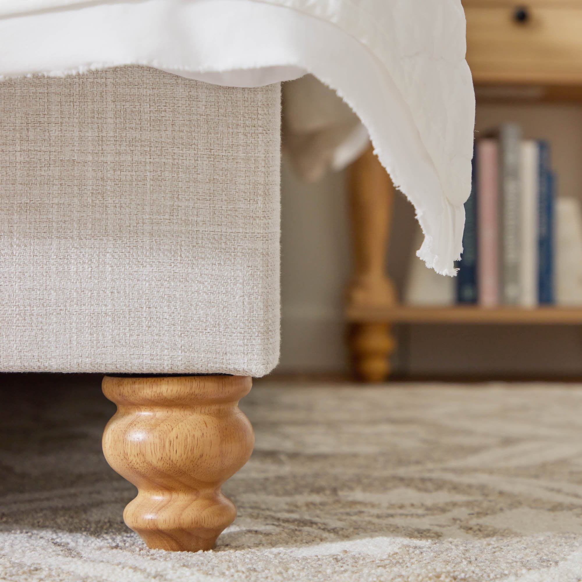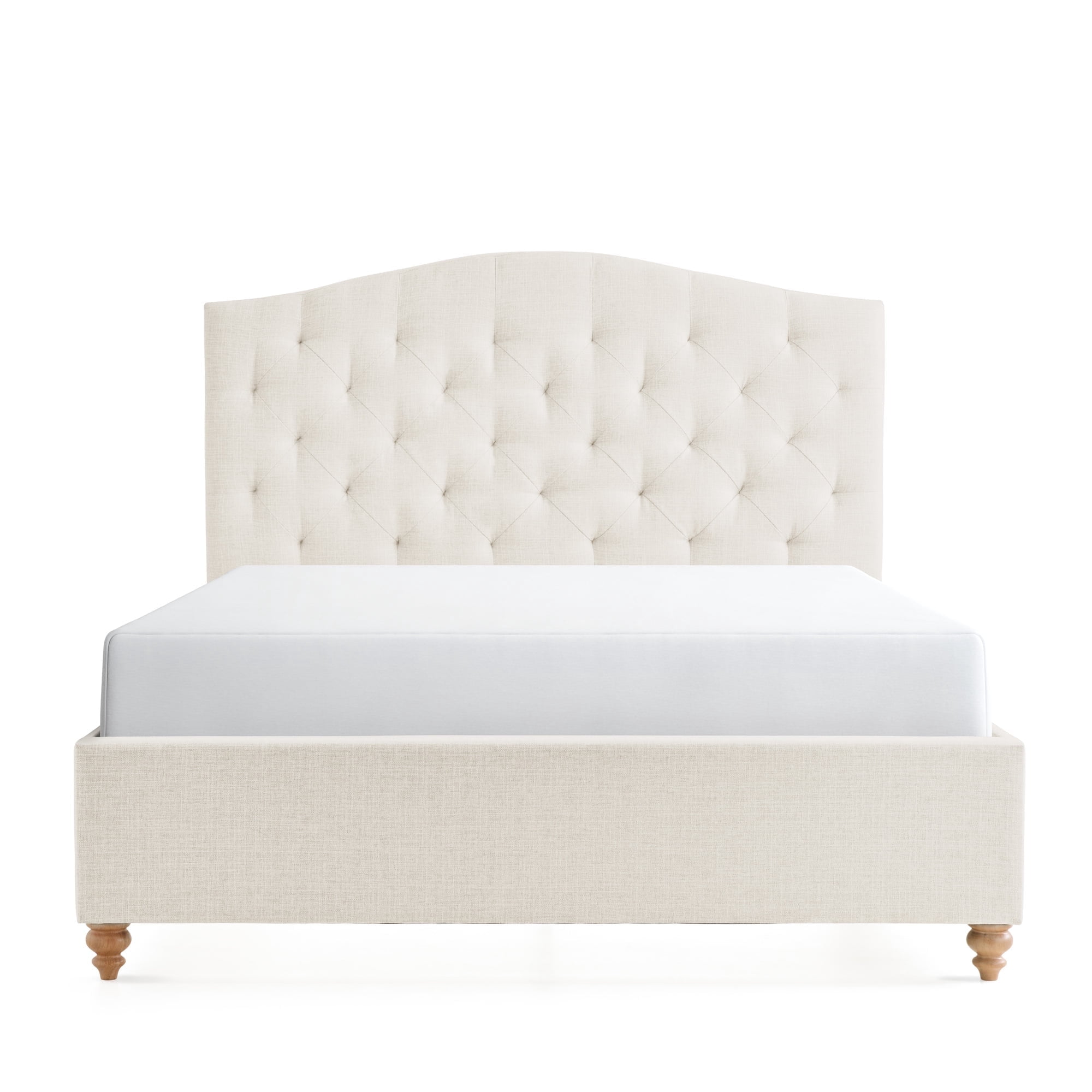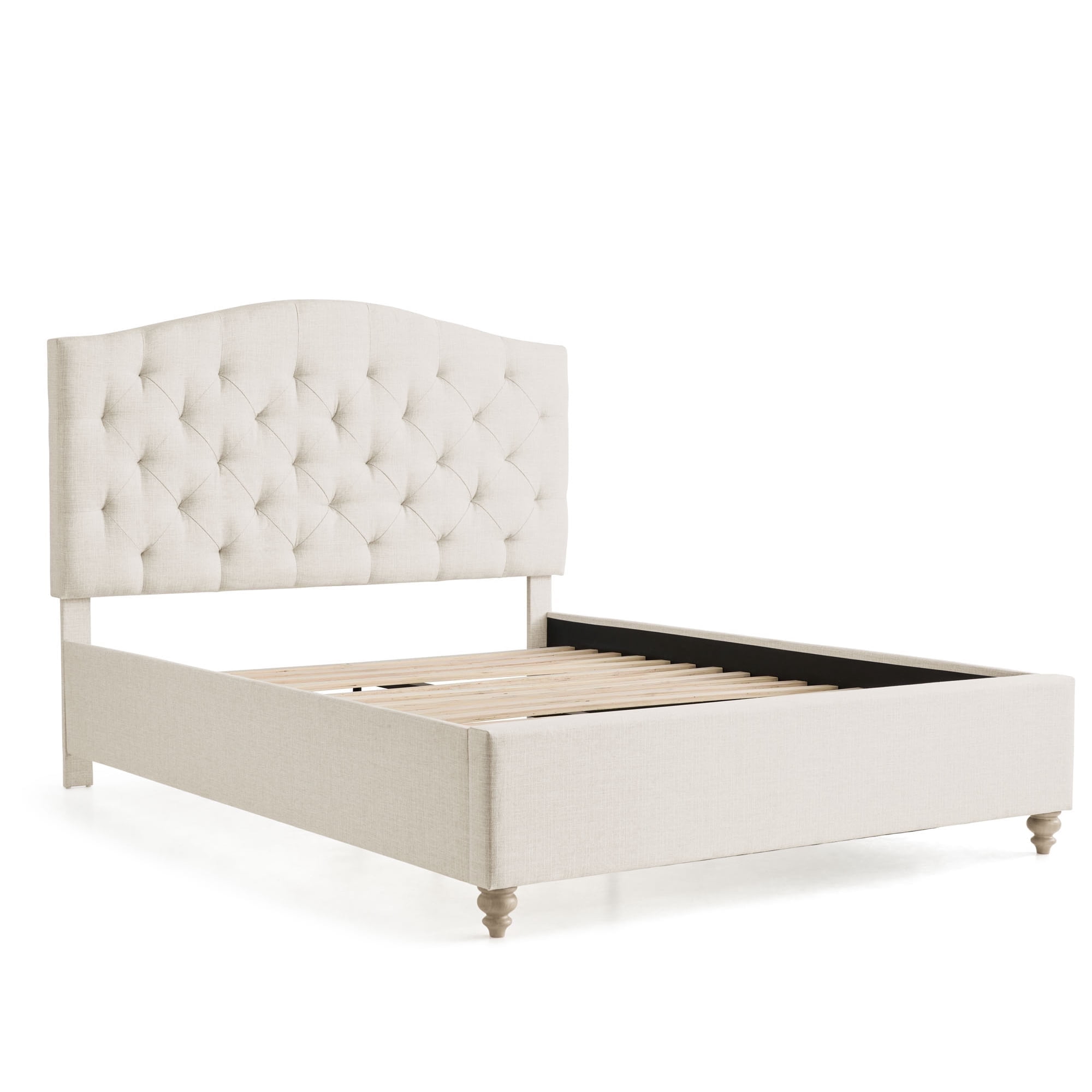 THOUGHTFUL DETAILS: Spindle legs, diamond tufting, and a curved headboard create an elegant design COMPATIBILITY: Full slats included means no box spring is required to use this bed and it is adjustable bed compatible RELIABLE CONSTRUCTION: Made of oak and linen-inspired fabric to withstand everyday use MULTIPLE COLORS: Bed frame is available in Oat or Light Gray to match your design style SHIPS IN TWO BOXES: High quality furniture ships in two boxes and makes it easy to bring larger items into your home SIMPLE ASSEMBLY: All hardware is included for simple assembly, just grab a screwdriver WARRANTY GUARANTEE: Complimentary one-year warranty *Item pictured is a queen size
