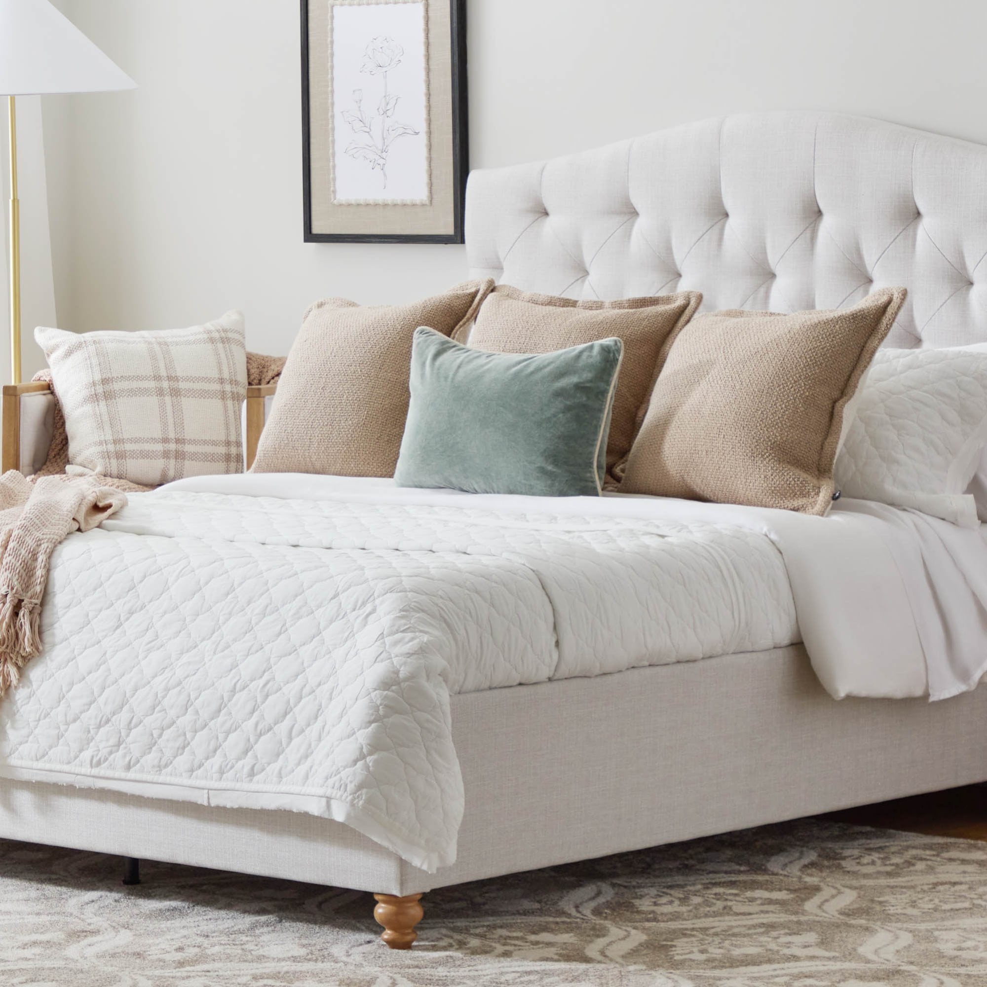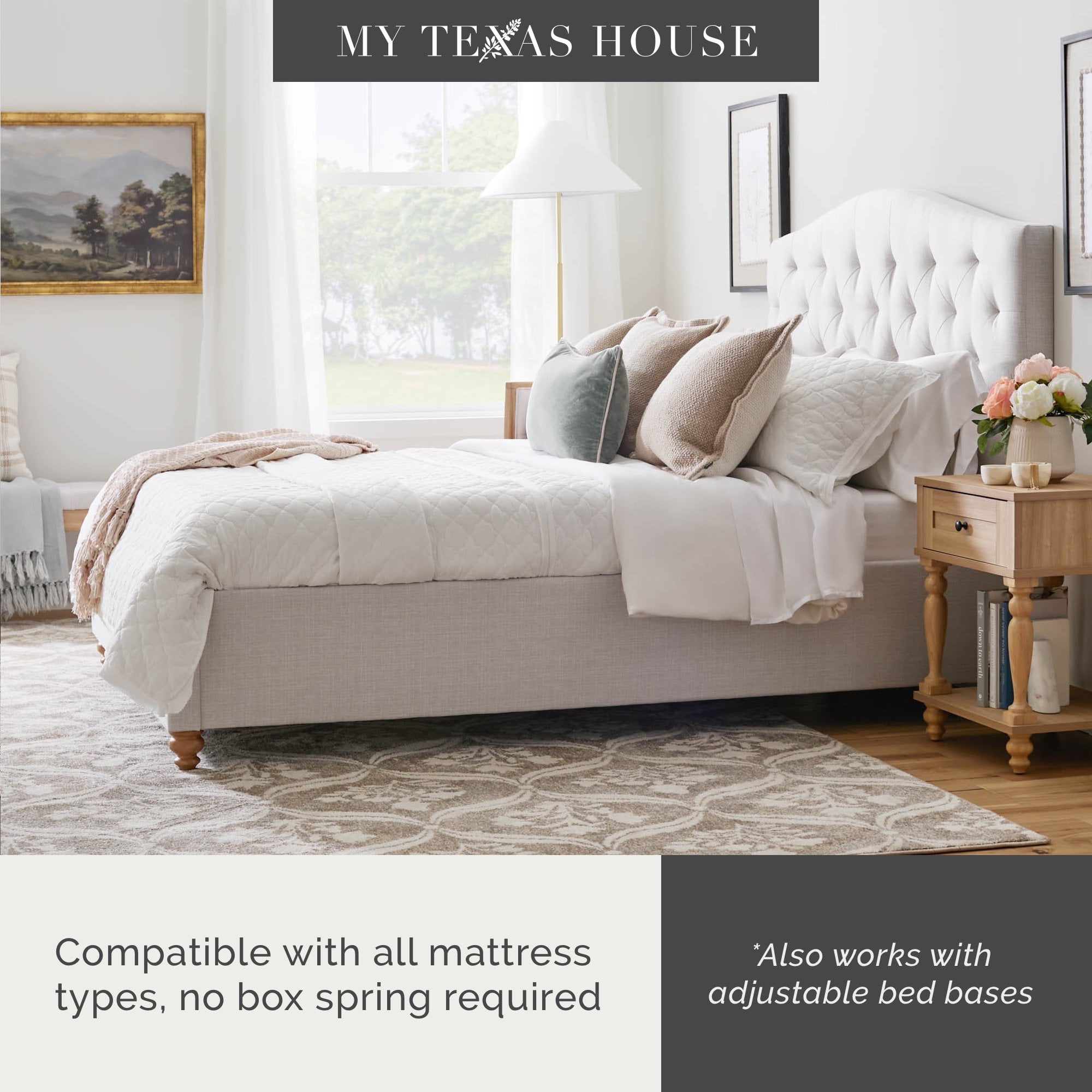 Discover the stylish designs and thoughtful details of the My Texas House furniture collection. With furniture Erin designed for your whole home, this collection features bedding, seating, storage, and more. Add elegance to your home with the My Texas House Anna Upholstered Diamond Tufted Bed. The curved headboard, diamond tufting, and spindle legs come together in a stylish bed. Plus, the full slat roll allows you to use this bed without a box spring and makes it adjustable base compatible. Finished in a linen-inspired fabric and elevated with oak legs, this upholstered bed frame will last. And it ships to your home with all the hardware included for simple assembly. Create an inviting and warm atmosphere in your home with the furniture you’ve been looking for.